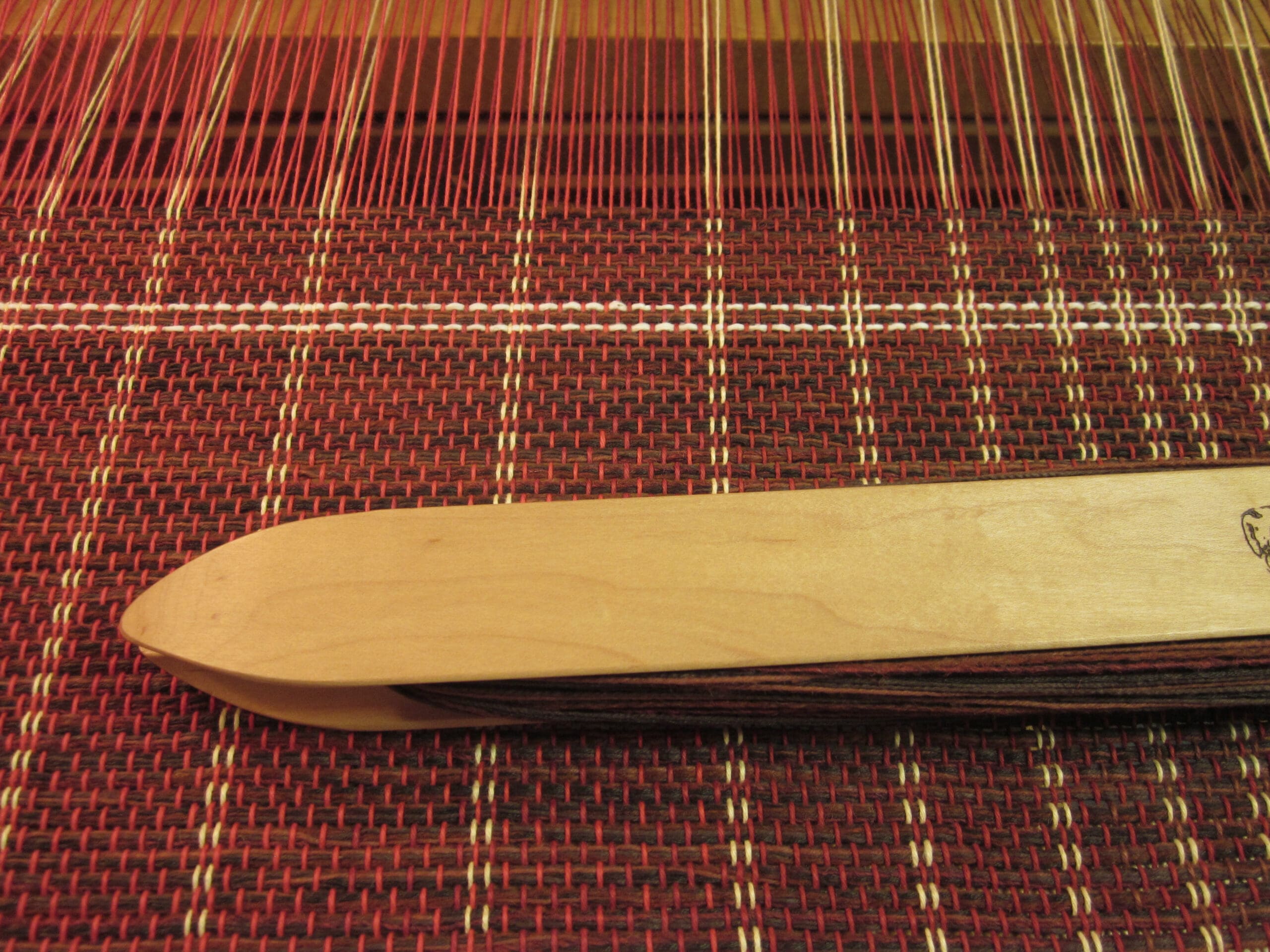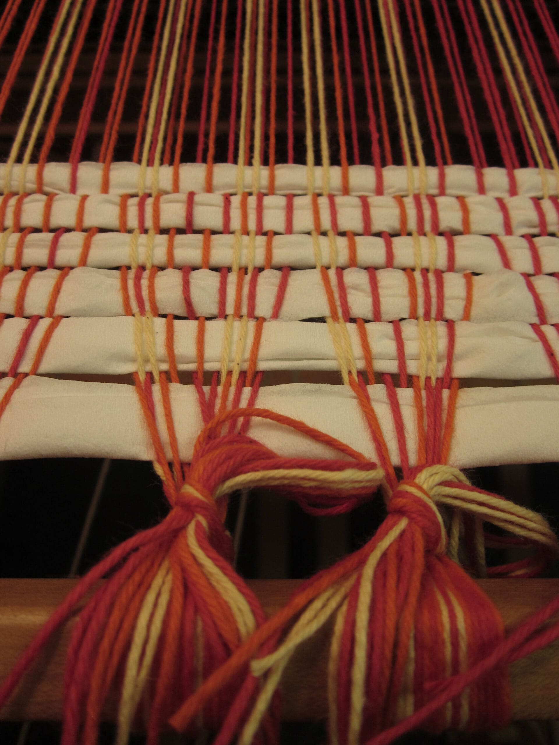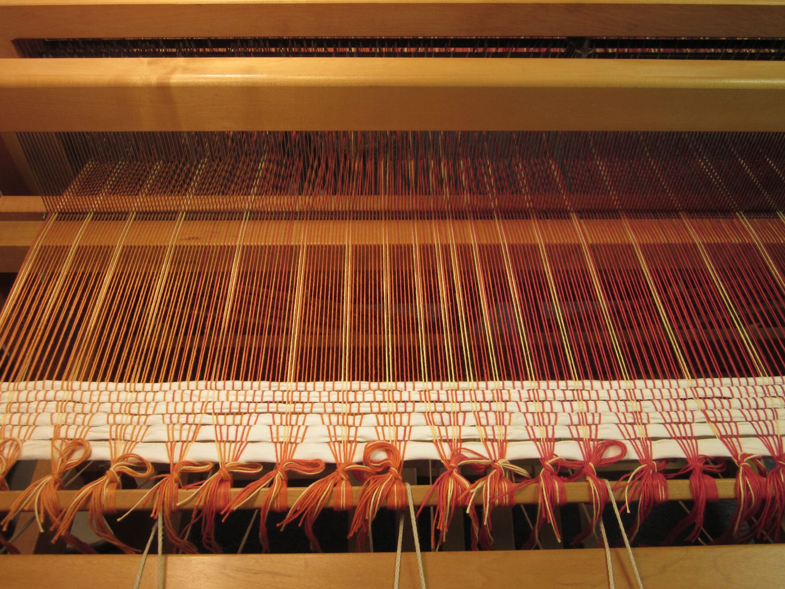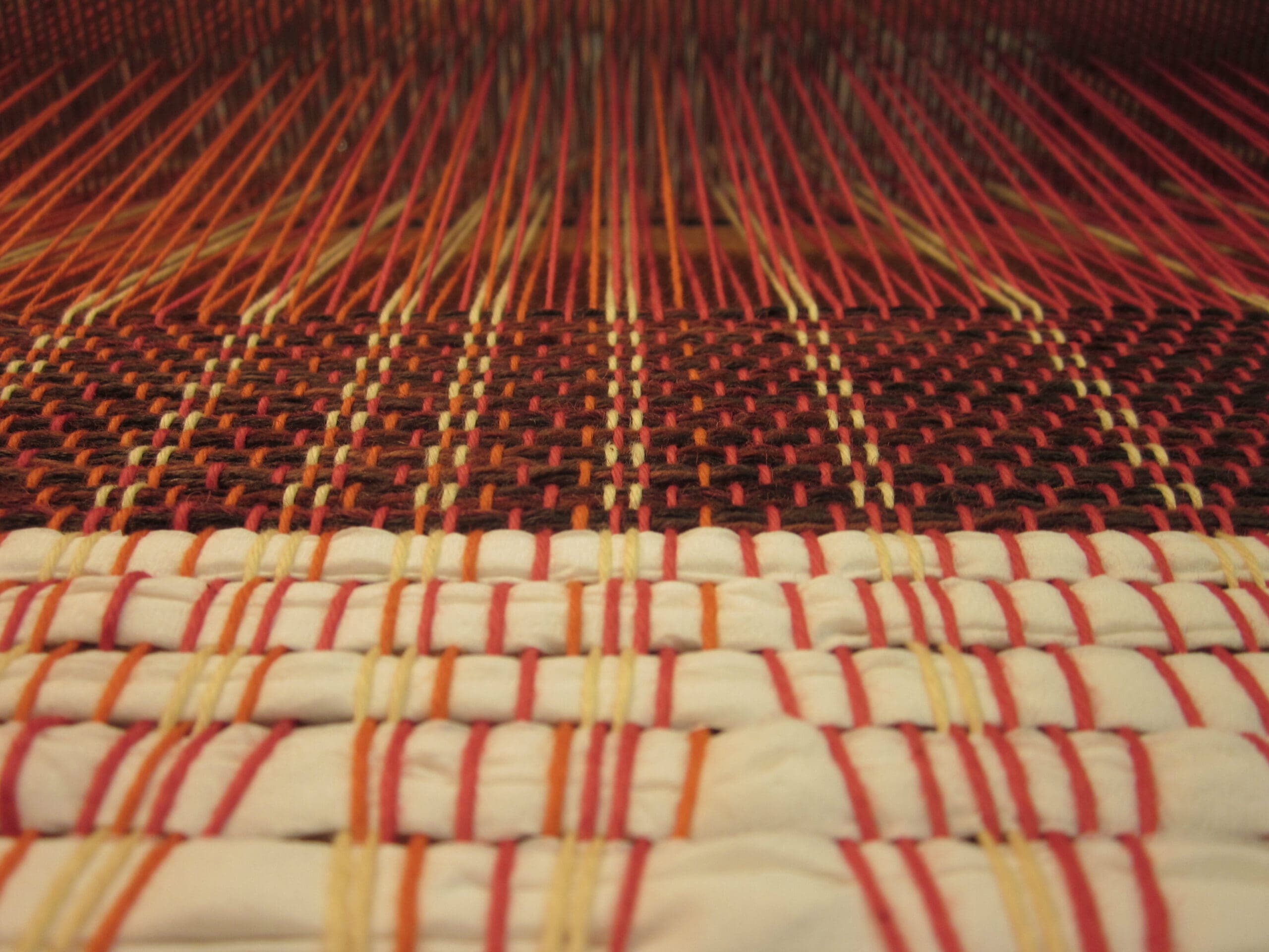So, the beauty in using a loom lies in the options it provides you, the artist, once it’s been dressed. (“Dressing the loom” is the phrase weavers use when they describe the set-up process.) At any given point, I can completely change the pattern by lifting and lowering different yarns. I could have a spontaneous twill or basket weave break out at any time! I have a 4-shaft loom (meaning each yarn could go into 4 different positions) which provides a large number of options. But, looms can be found with 8, 12, 24+ shafts, giving the weaver enough choices to really make her head spin! Kind of makes me dizzy just thinking about it…