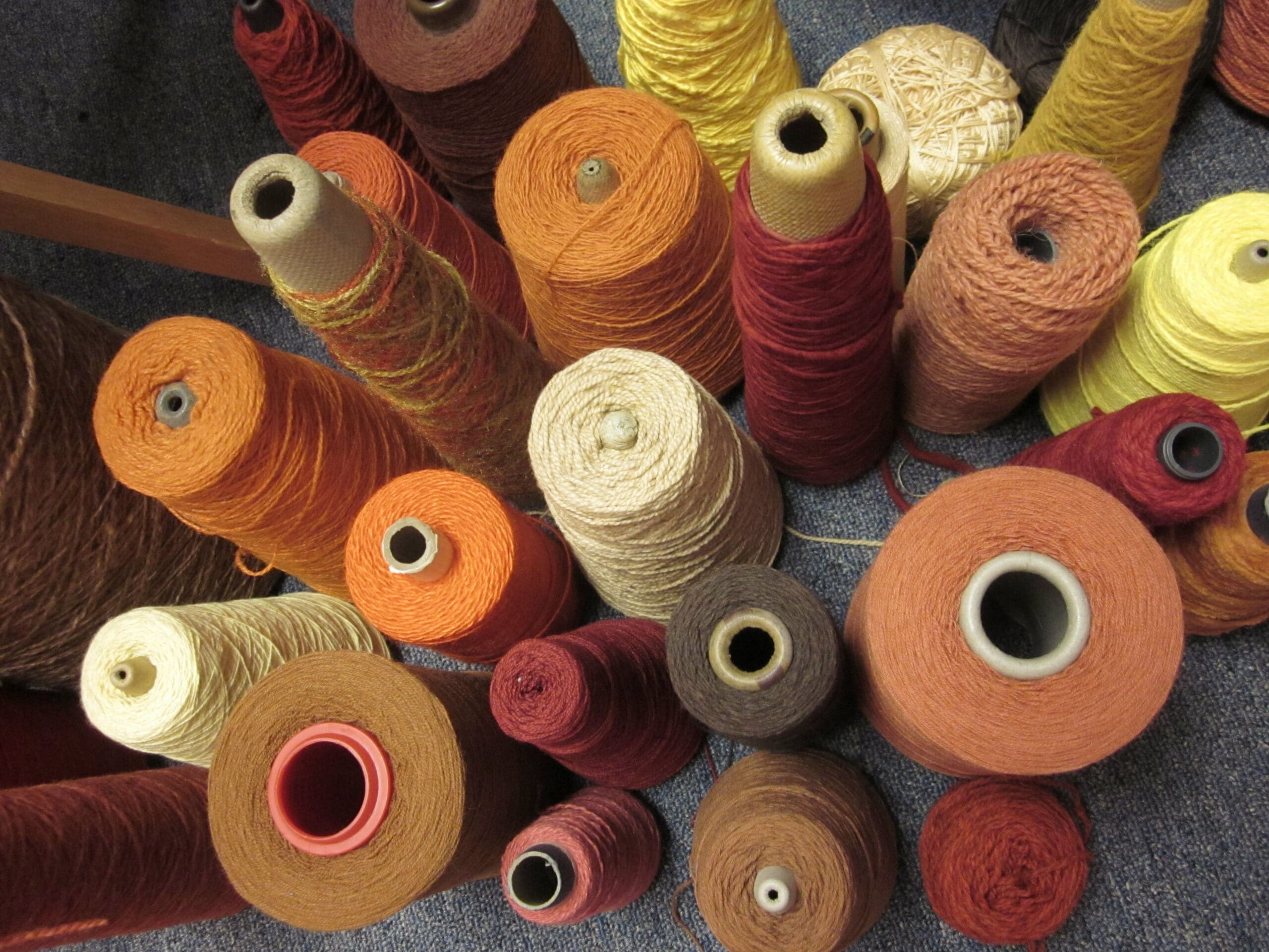 When I begin weaving a project, I go into my shelves of yarn (and there are MANY at this point!) and pull out everything that I may remotely want. This typically results in a 5′ x 2′ patch of carpet slammed full of cones and tubes of yarn! Visually, it’s fantastic! And for me, seeing everything in one place works better than constantly trying to recall what’s available and then searching for that specific color. Everyone at my house knows when the weaving has officially started because of the massive amounts of yarn crowding the loom!