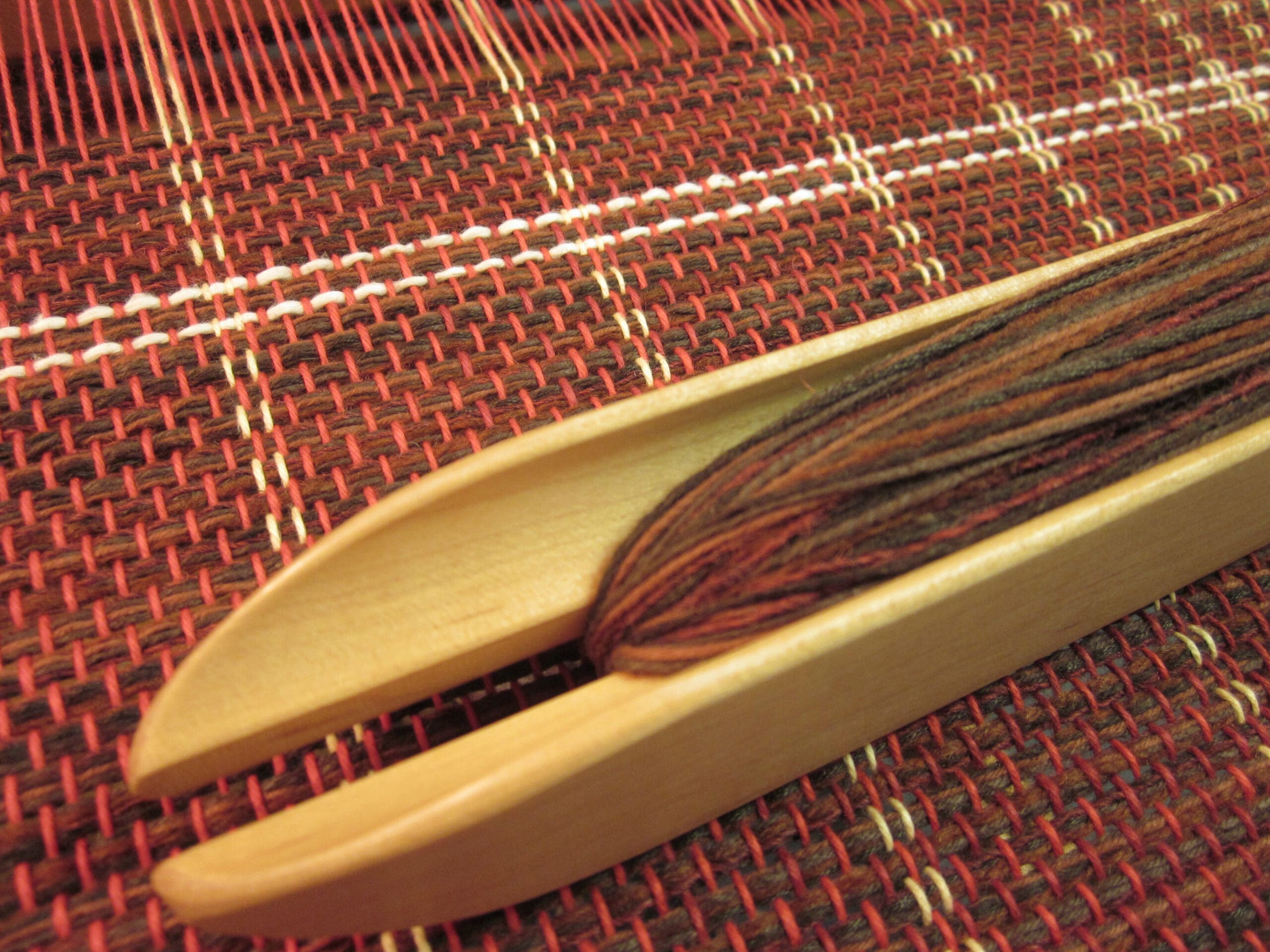I love incorporating black and white into my projects. But, for this one, the plan is to only use colors related to the warp yarns – yellow, orange, red, brown. It’s a challenge, but I like the rich colors in the fabric! So, I’ll take a big breath, put down the black, and select a chocolate yarn instead. (It’s tough sticking to the rules you make, isn’t it? Even if it’s for your own good!)