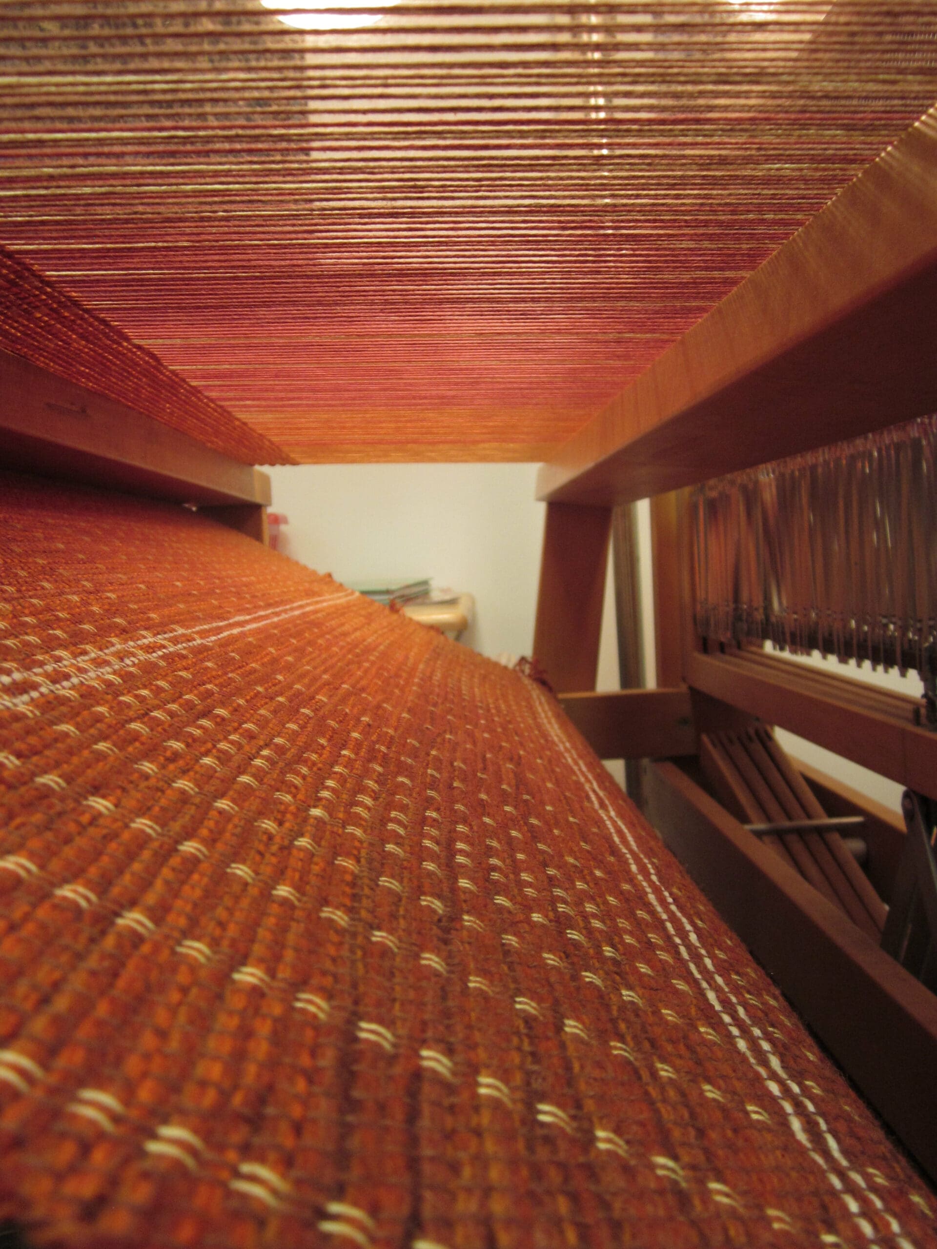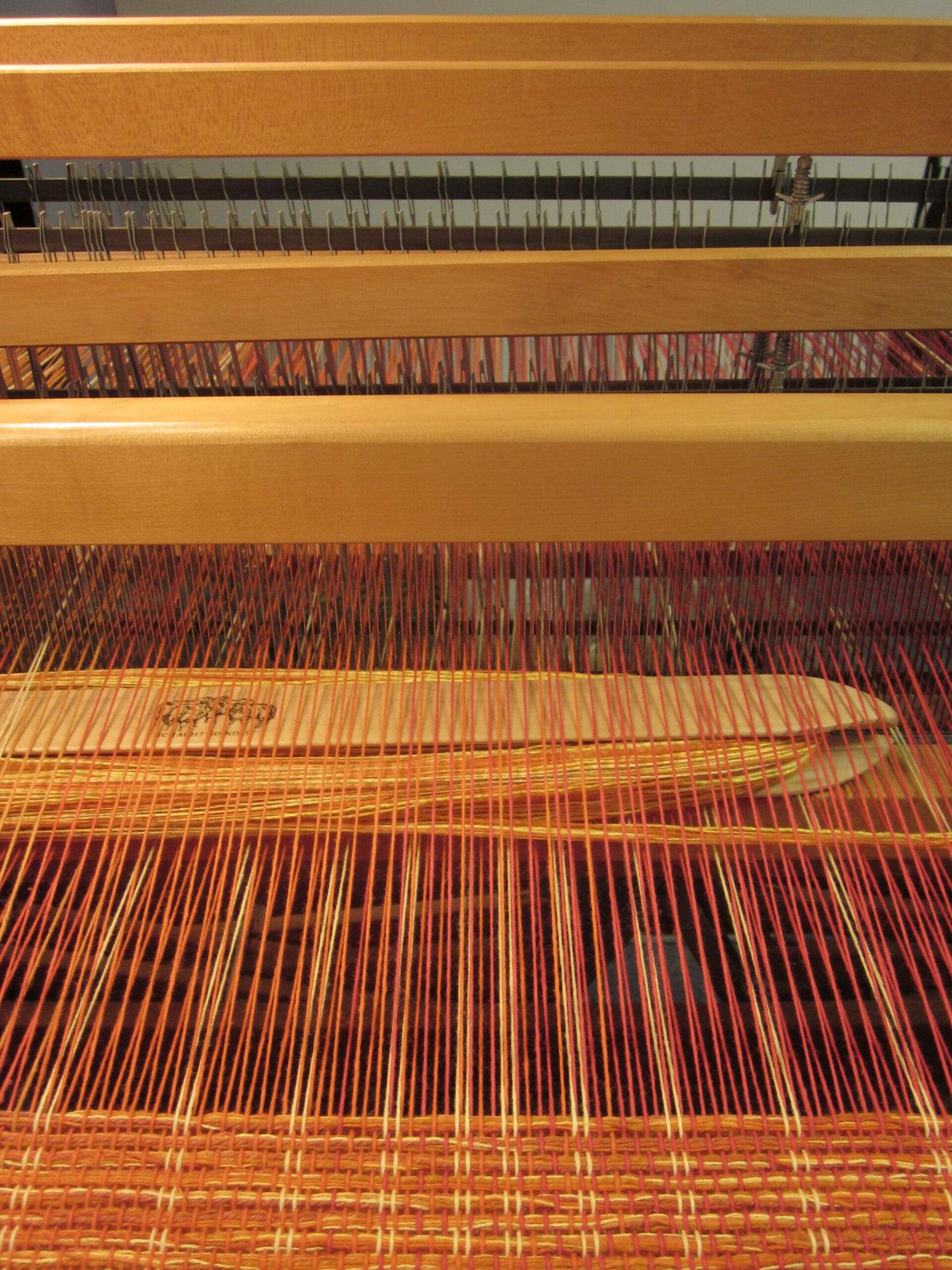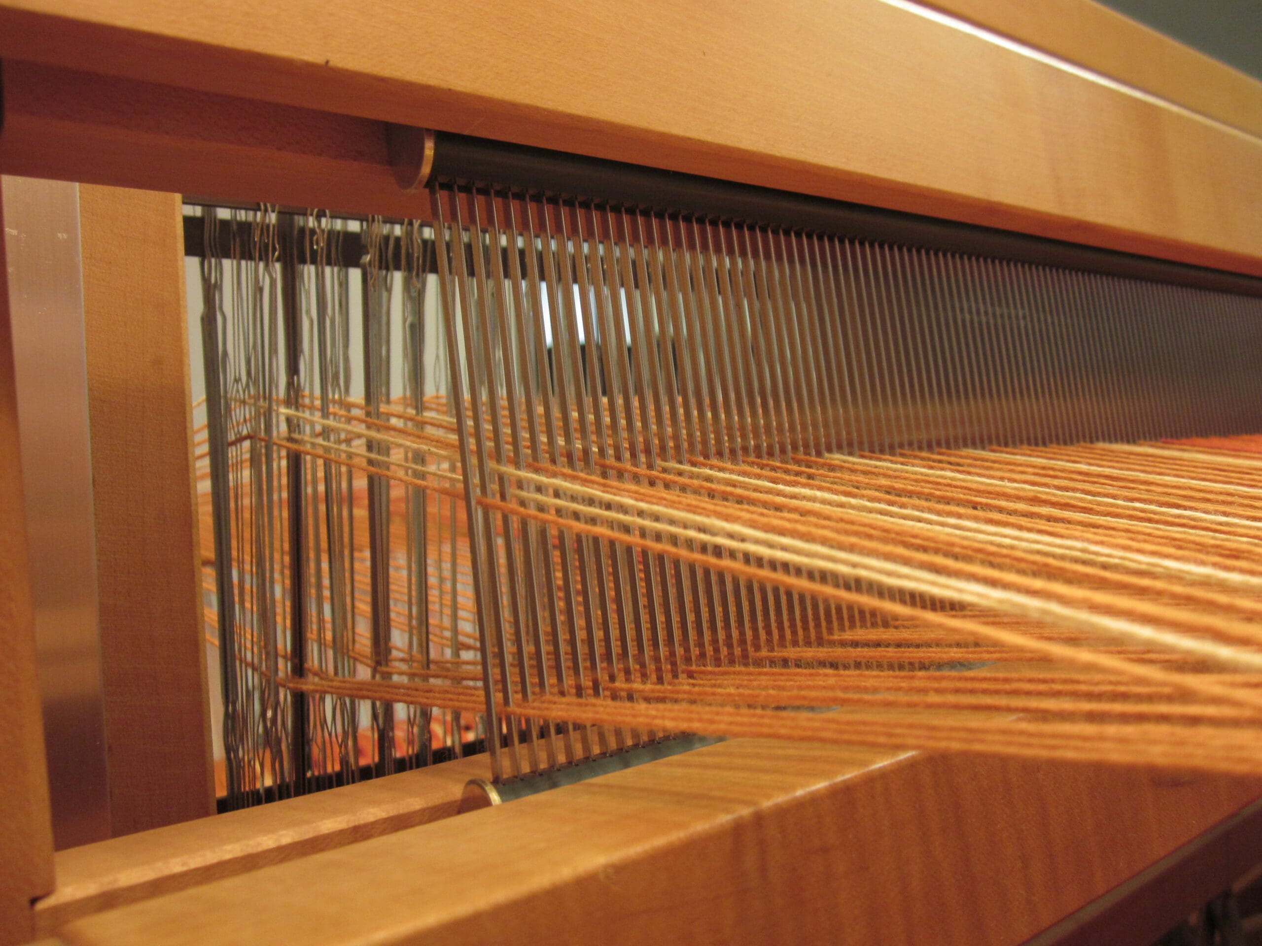 I guess for someone who’s not a weaver, the constant clanging of the shafts might be loud. The metal heddles sliding along the shafts creates a bit of noise! There are other types of heddles that are quieter, I’m sure. But, the truth is, I don’t hear it anymore! I just slide up the volume on the tv (2) notches and I’m good to go!