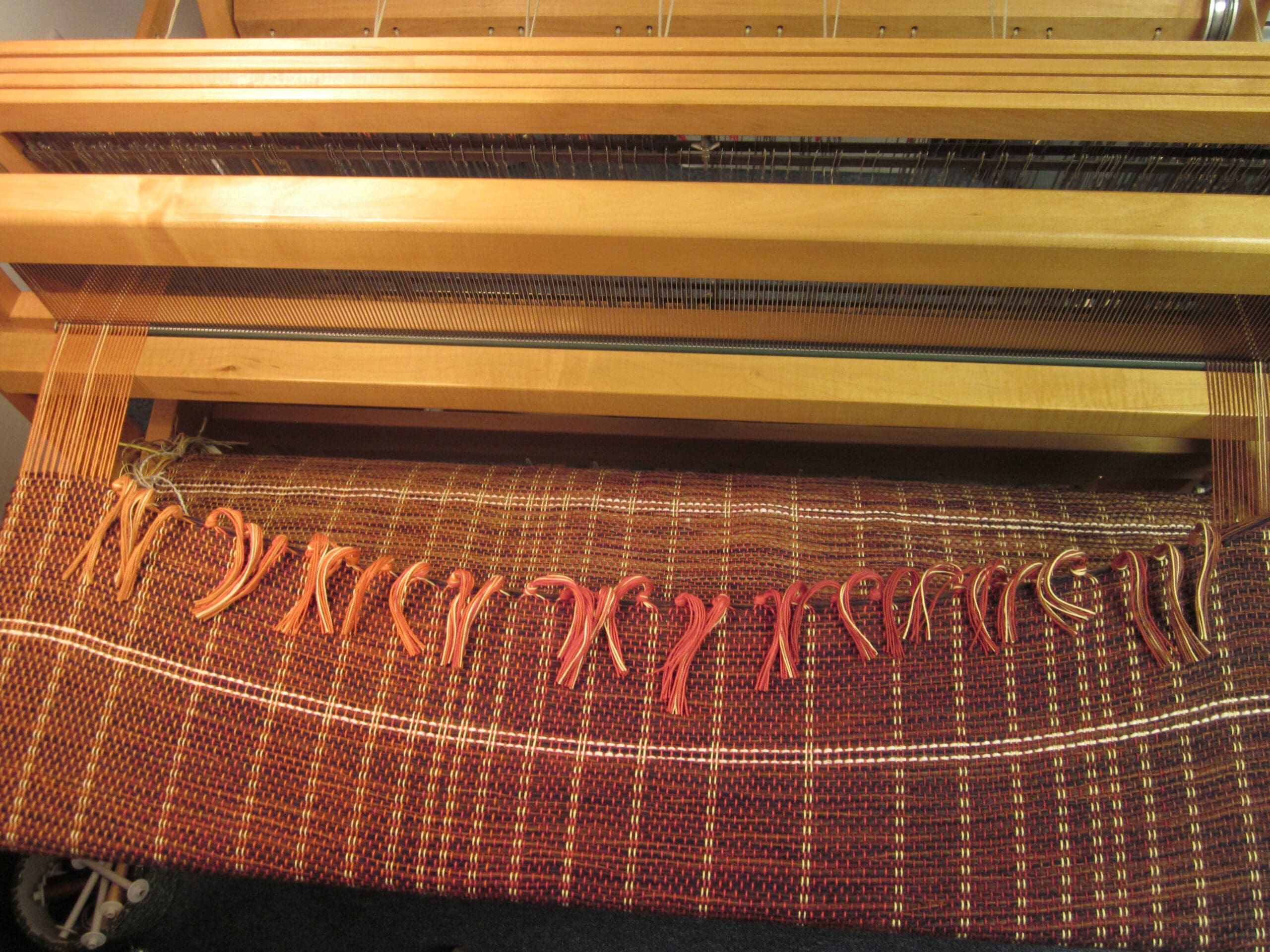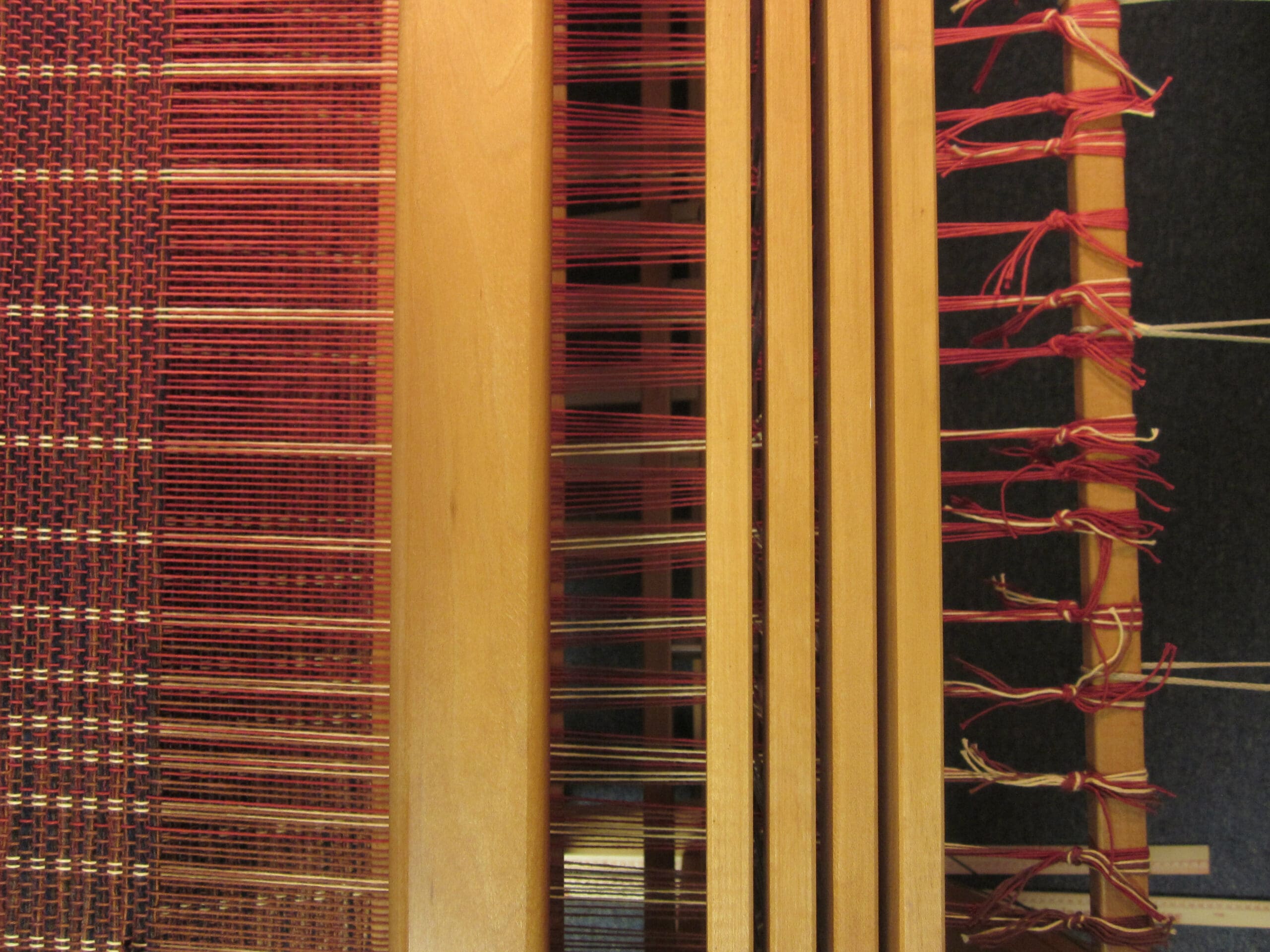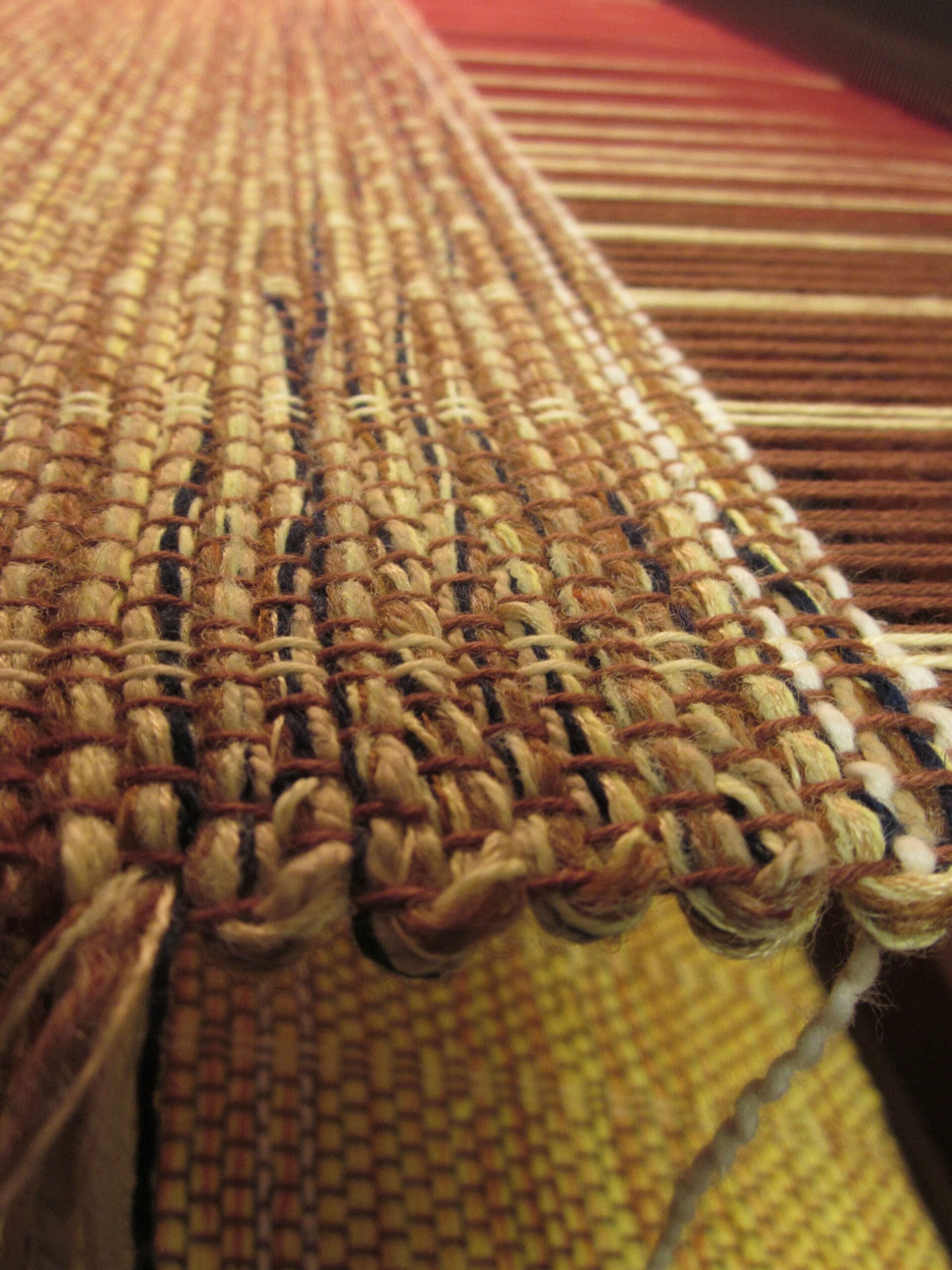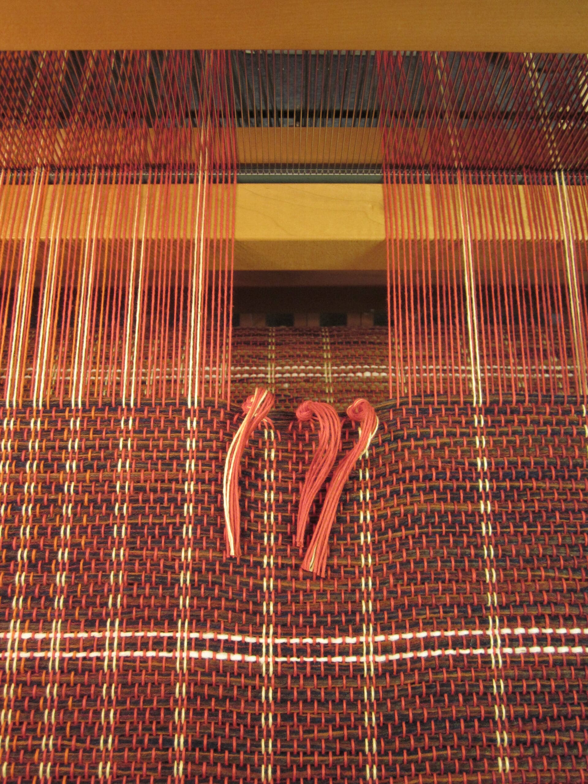 And how do you know when you are ready to cut it off the loom? First of all, you can see the knots at the back and all the yardsticks have long since fallen out. Secondly, the space where the shuttle goes through the warp yarns becomes smaller and smaller, until it’s just too snug! At that point, you pull out the scissors!