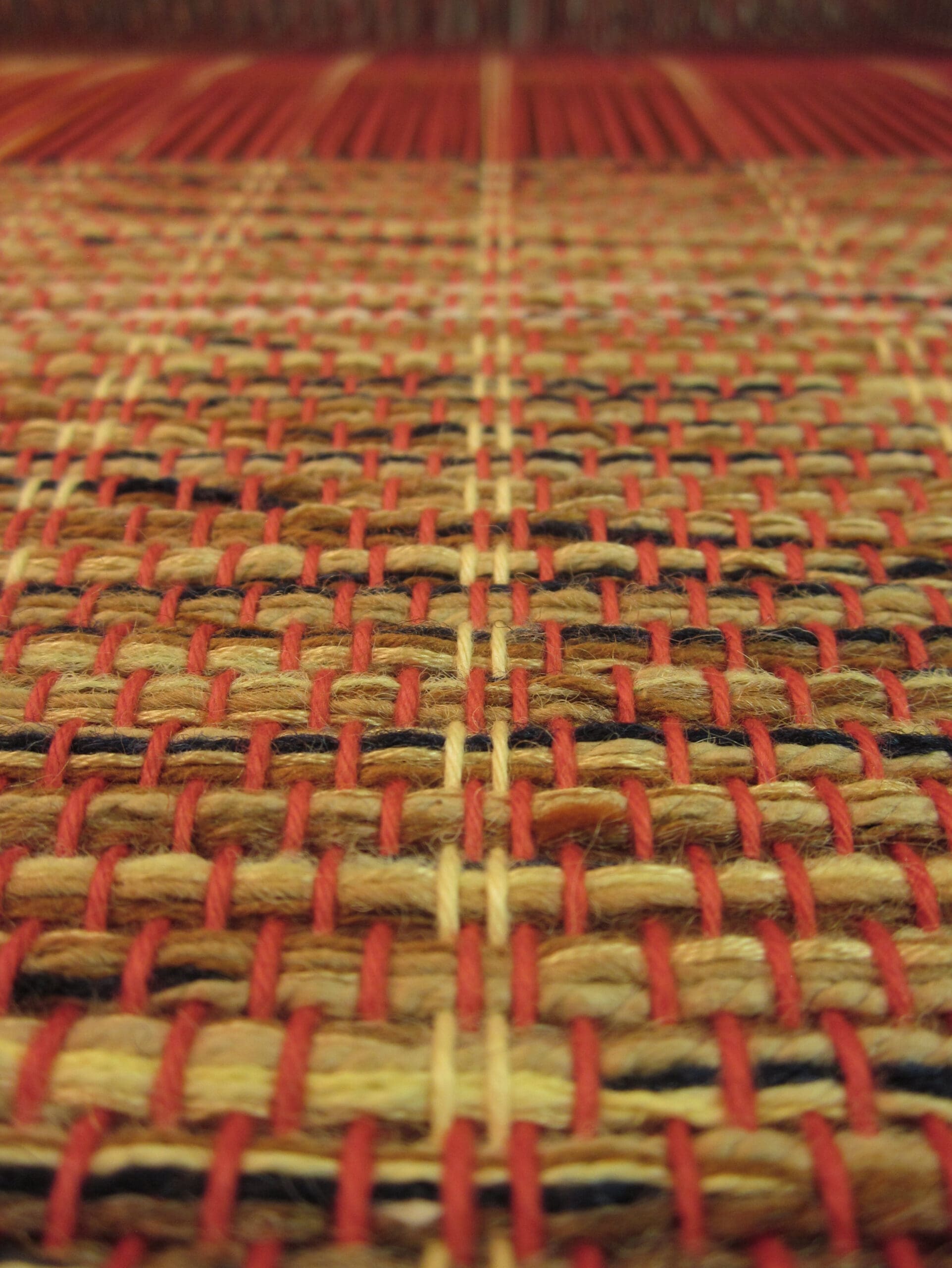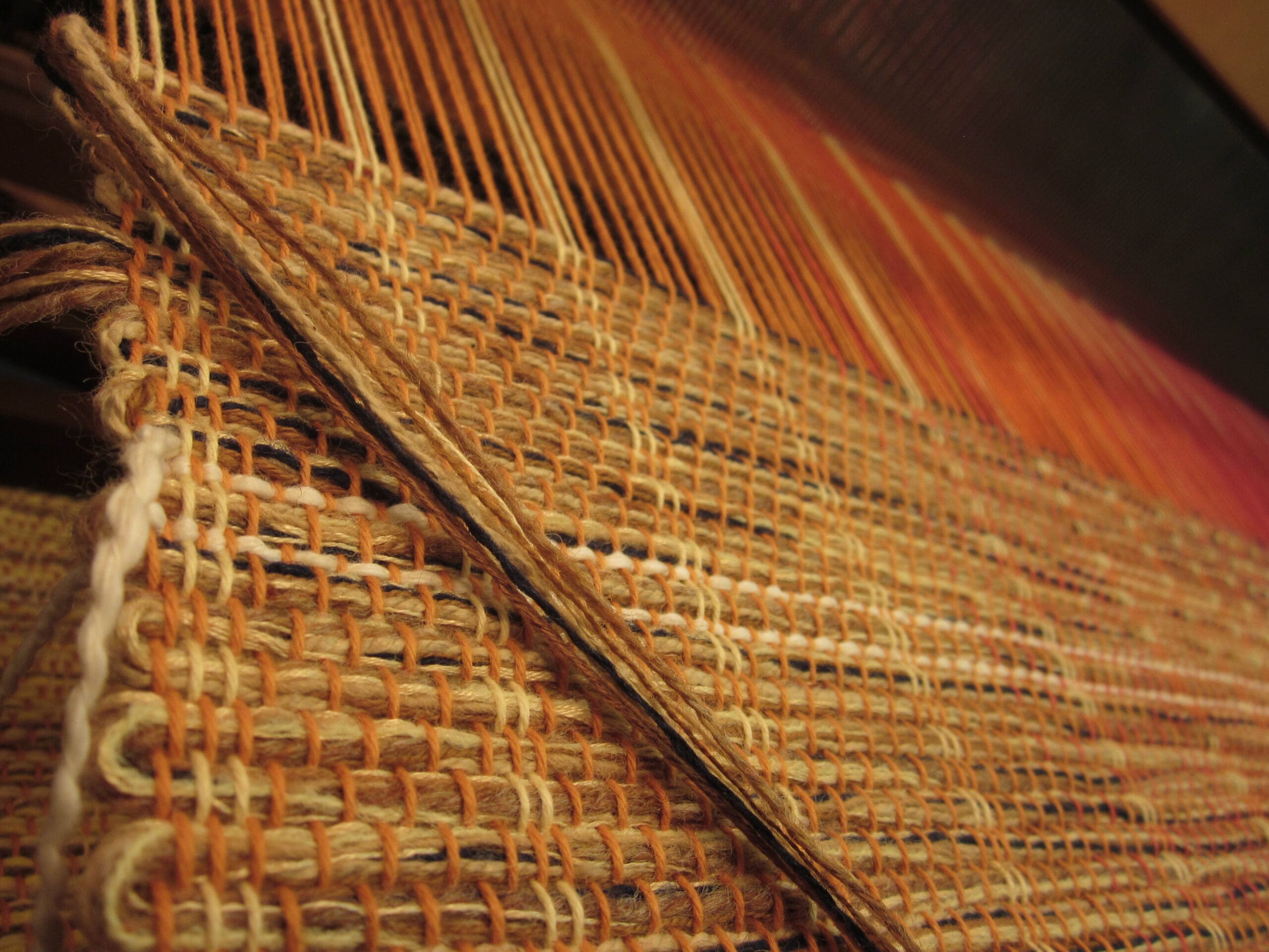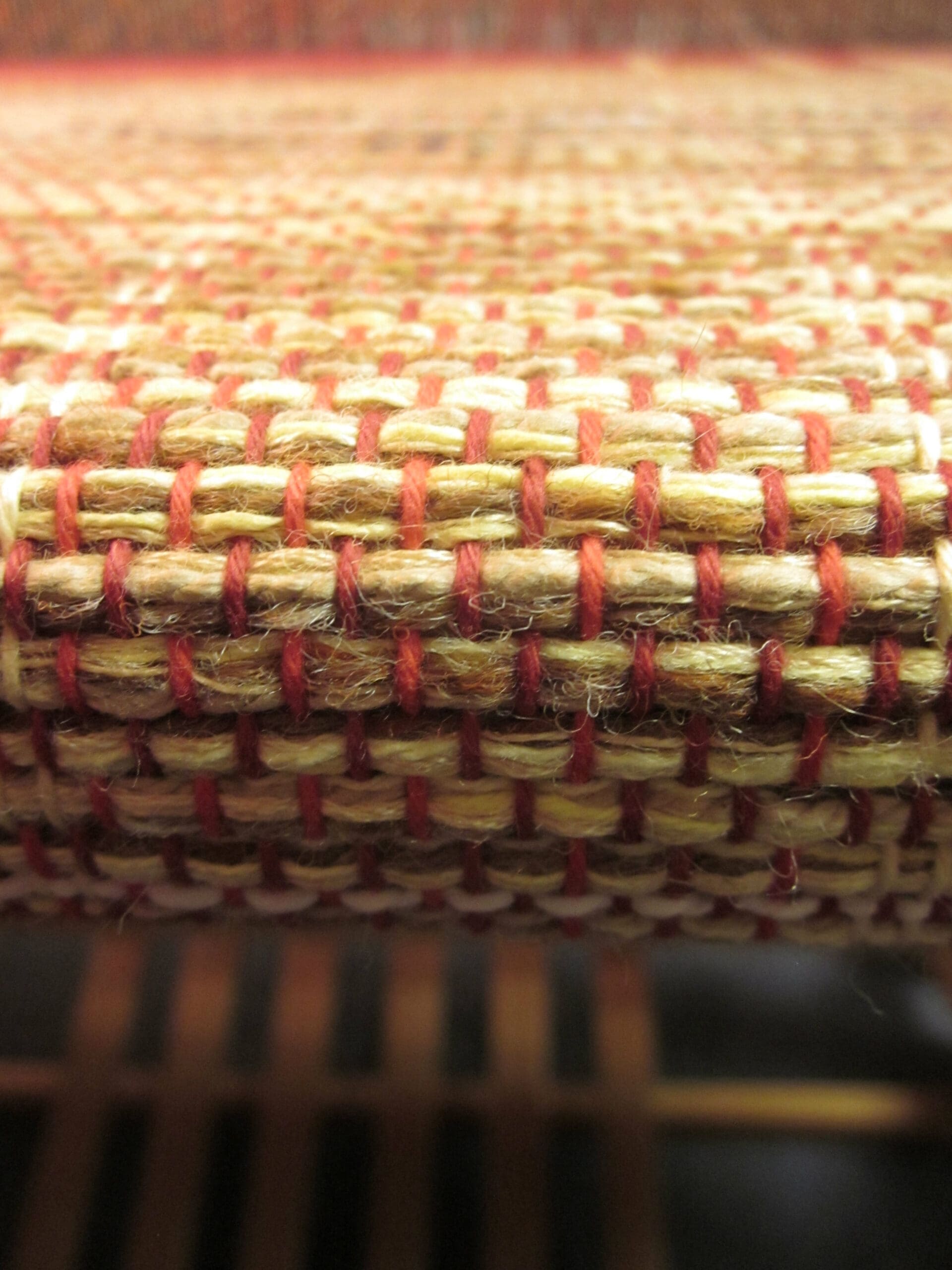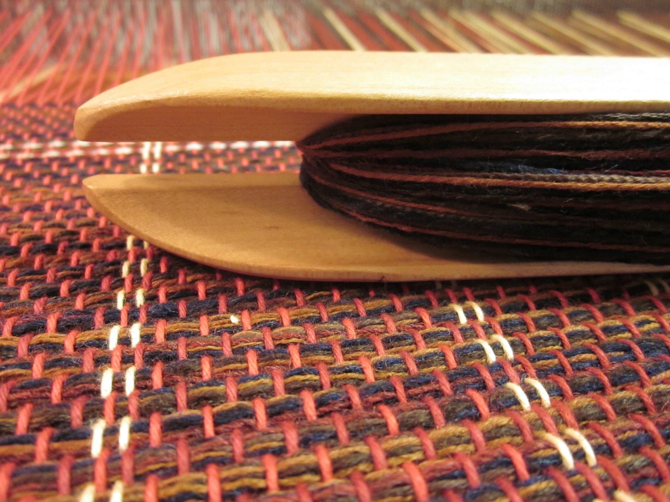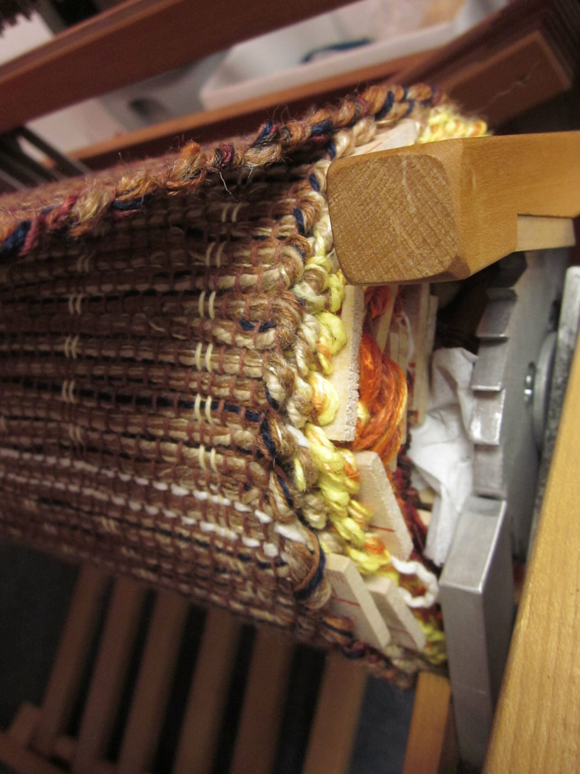 And how do you know when you are ready to cut it off the loom? First of all, you can see the knots at the back and all the yardsticks have long since fallen out. Secondly, the space where the shuttle goes through the warp yarns becomes smaller and smaller, until it’s just too snug! At that point, you pull out the scissors!