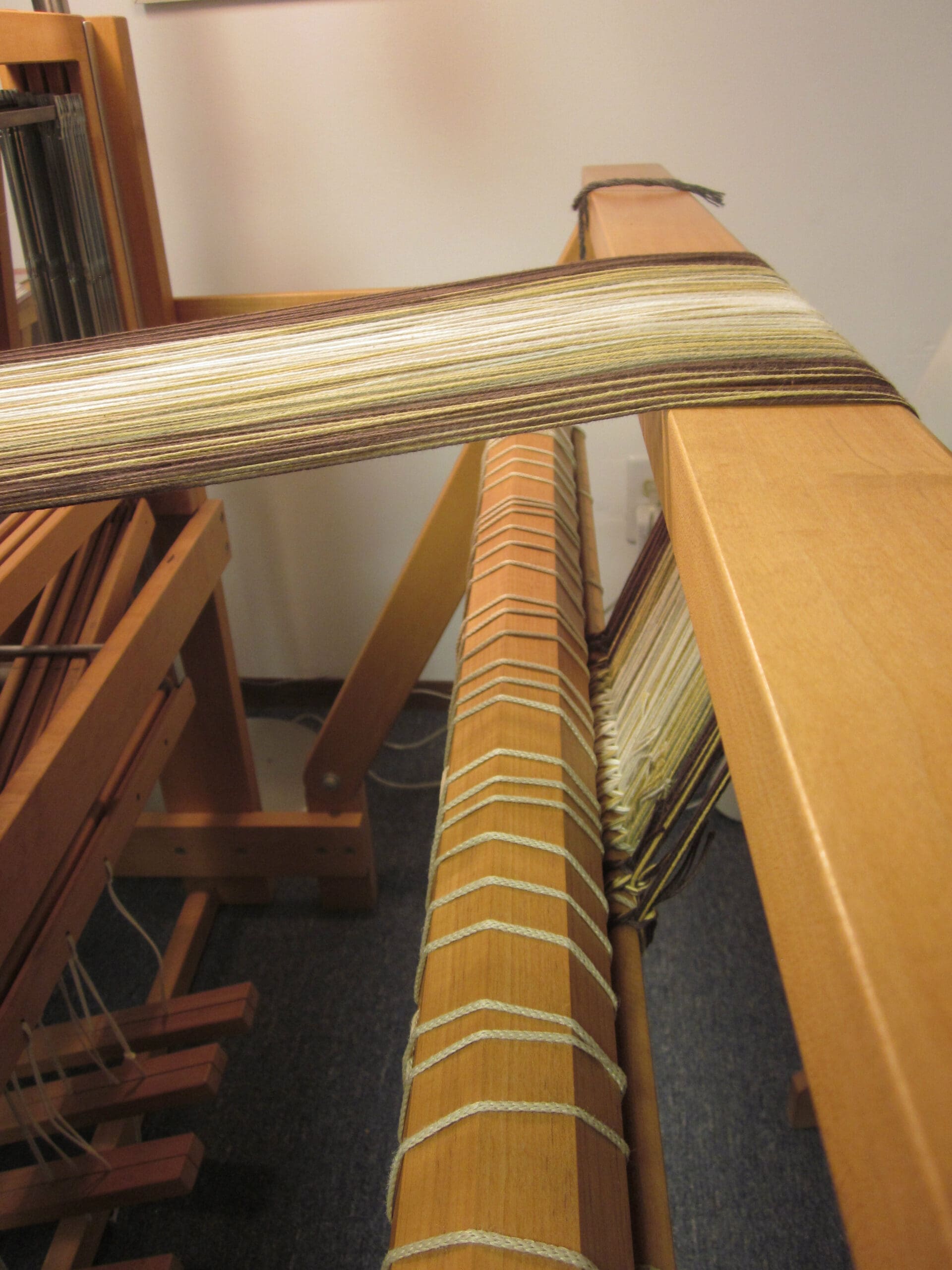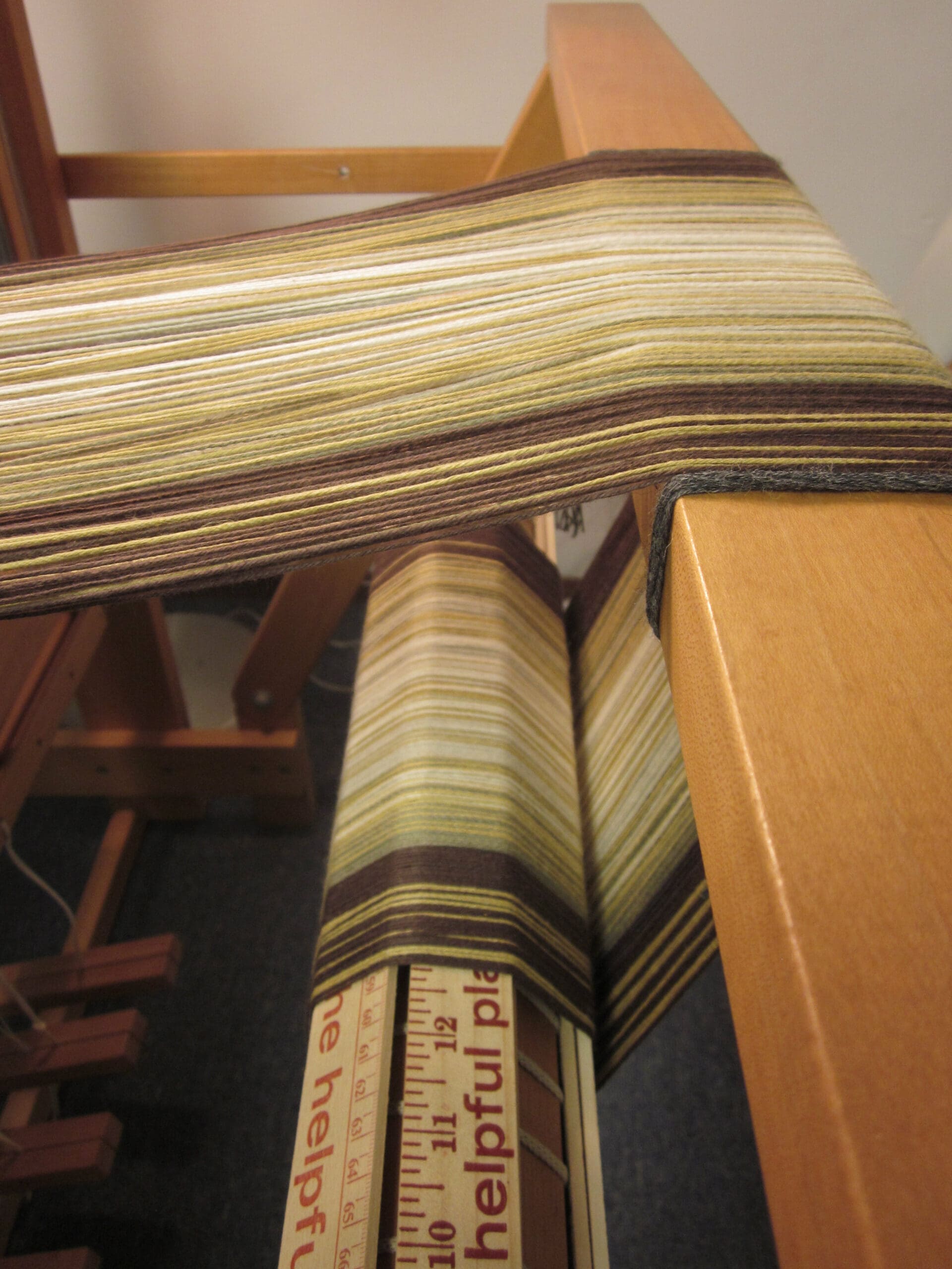 At the front of the loom, I have separated the yarn into chunks. I give each one a yank, release the brake on the loom, and spin the back beam about 2/3 of a turn. Add a yard stick, rinse and repeat!