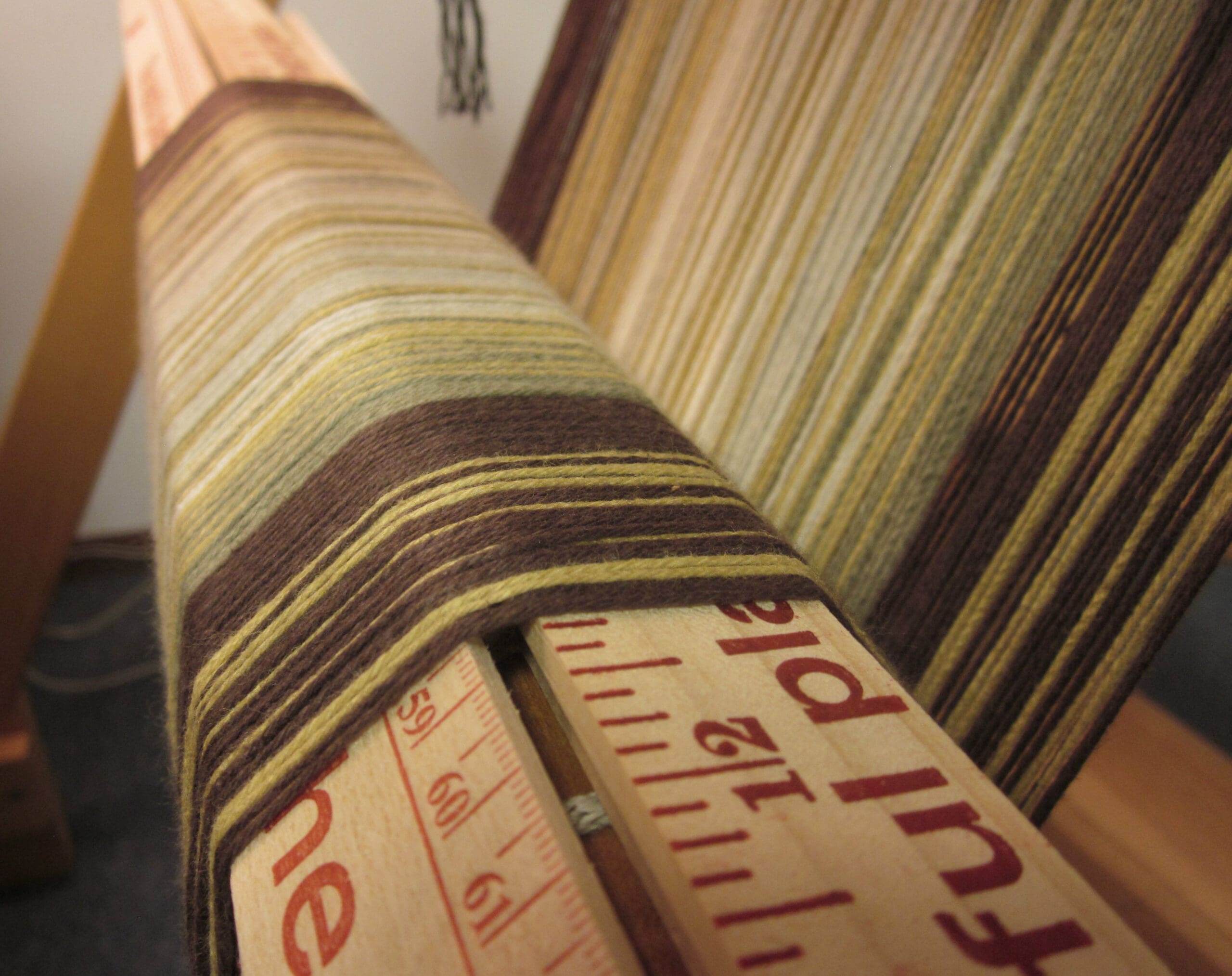 To help with the “equal tension” part of the program, I like to use yard sticks to ensure that the yarn is laying nice and flat! If you don’t use something (sticks or heavy paper), the yarn will begin to stack up in mountains and valleys as you wind on, causing some unexpected tension problems. Not good… really, really not good!