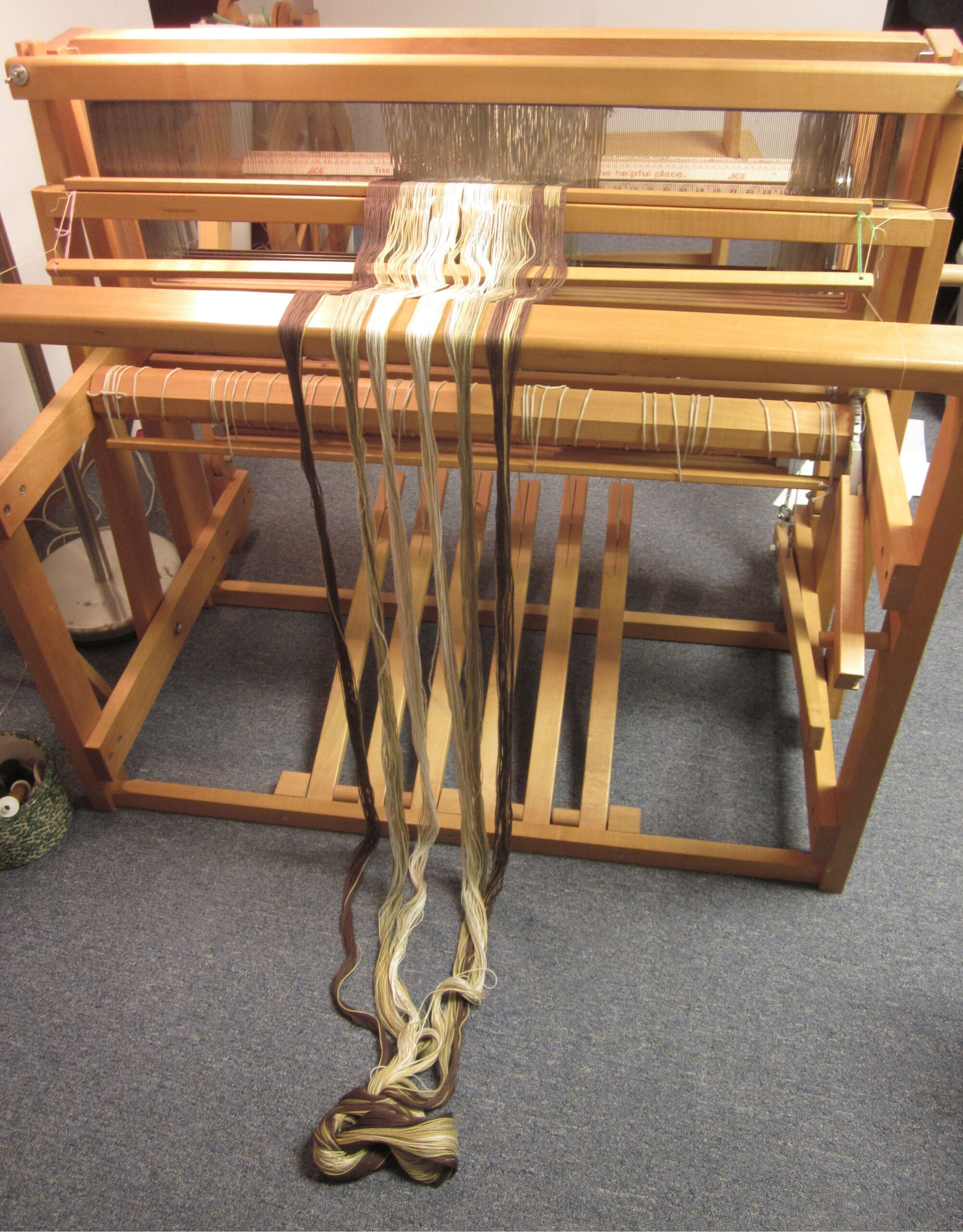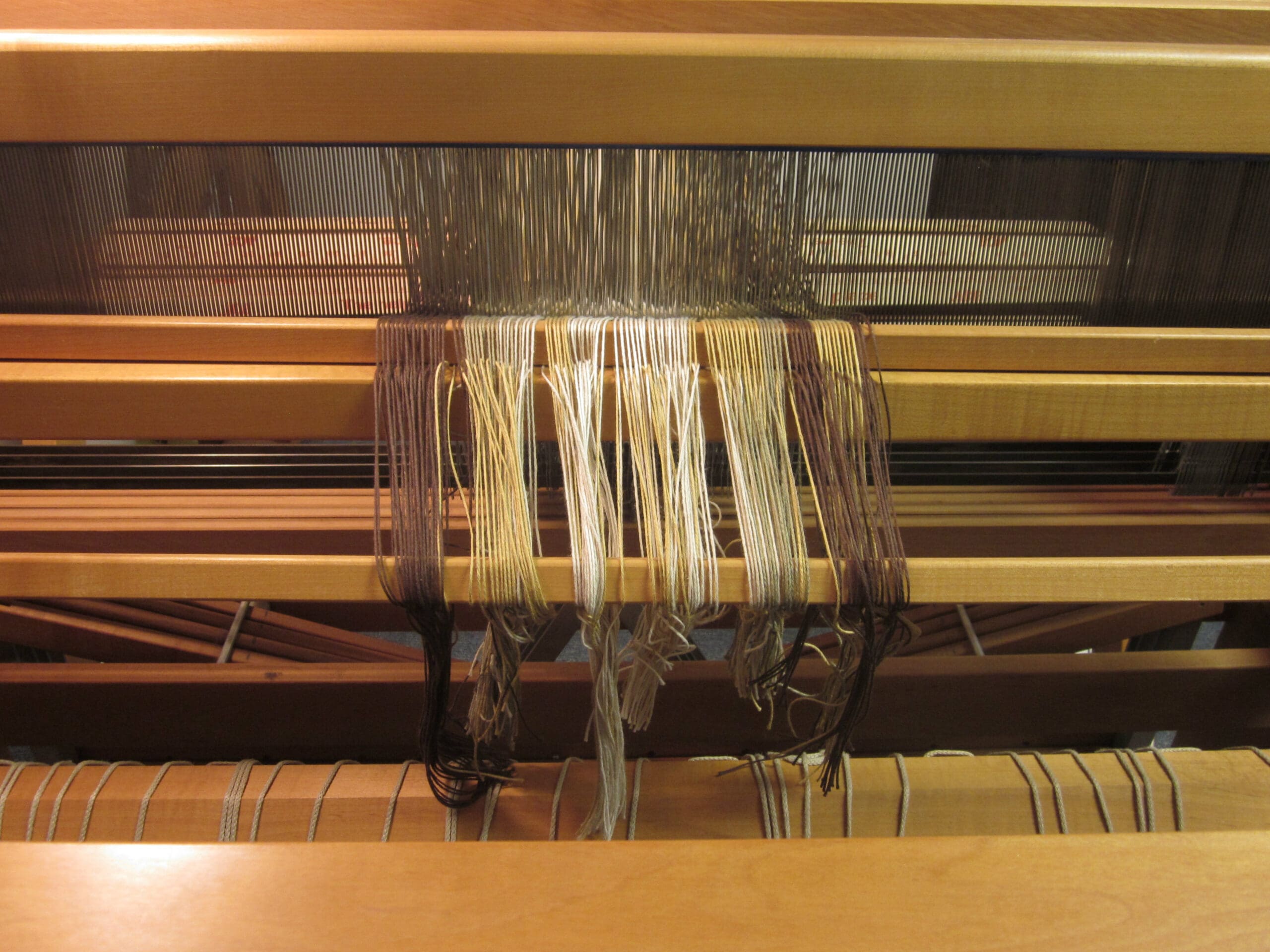 If you remember back to last week’s post, I had collapsed the back of the loom so I could sit really close when threading the heddles. For this part of the process, I like to go ahead and extend the back before I tie the yarns. (You need to extend the back eventually! So, why not now? Right?)