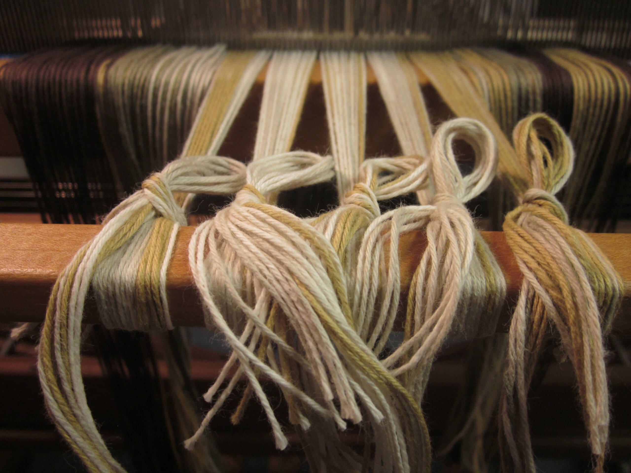 When we last chatted, I had finished measuring the yarn, sleying the reed, and threading the heddles – all the necessary steps to maneuver the yarn through the middle of the loom. Now, I need to tie the yarn to the back and starting winding!