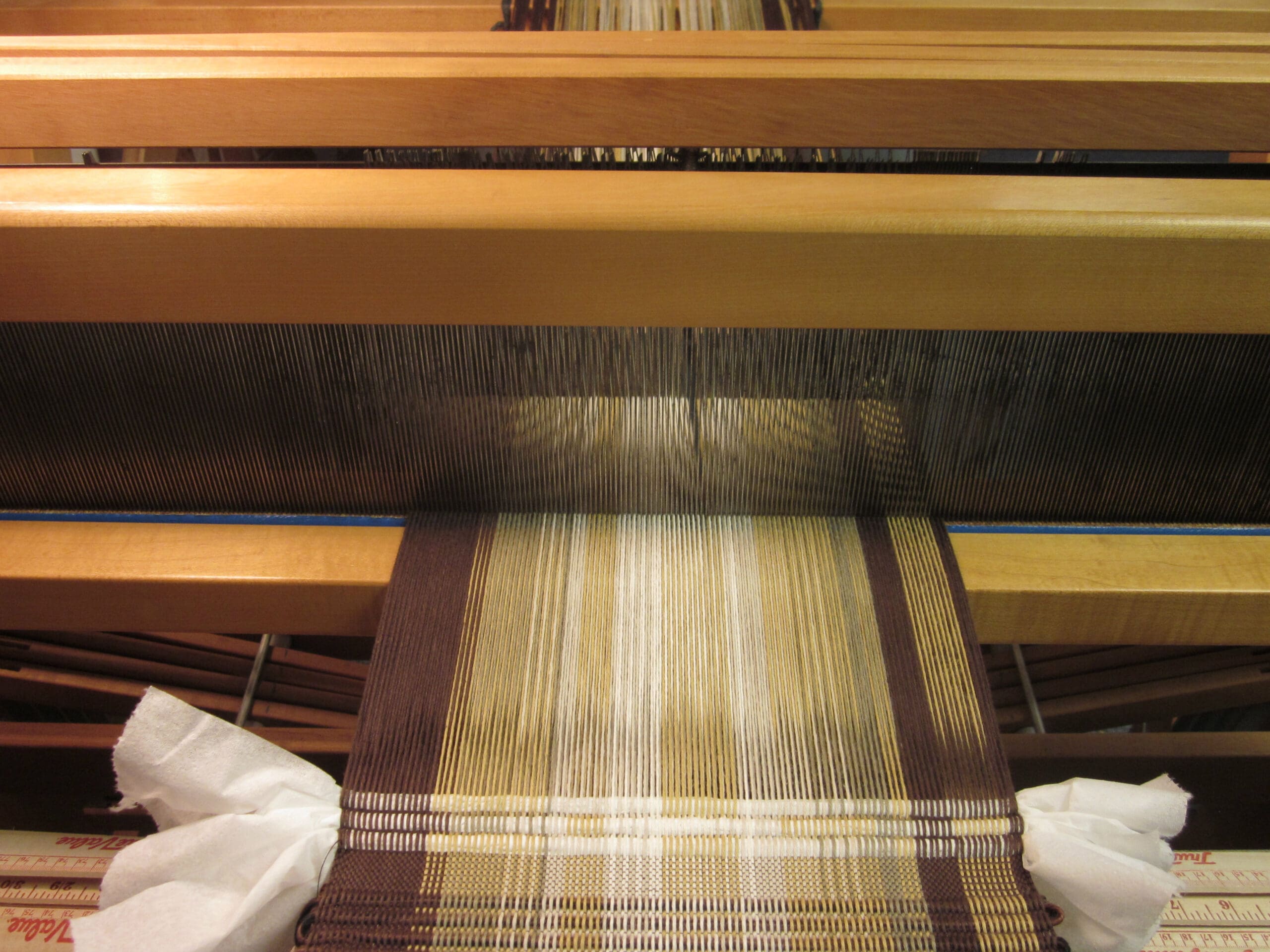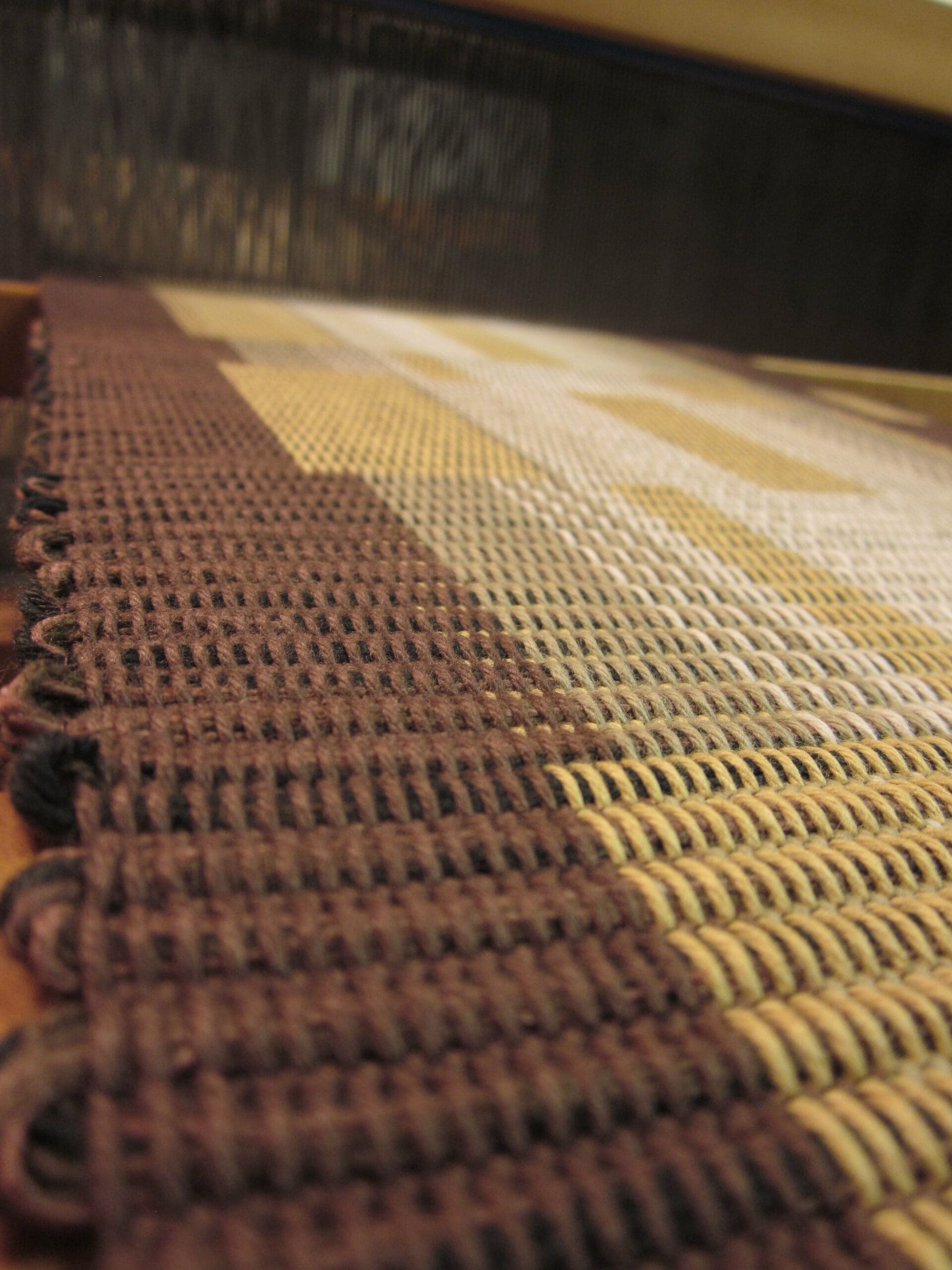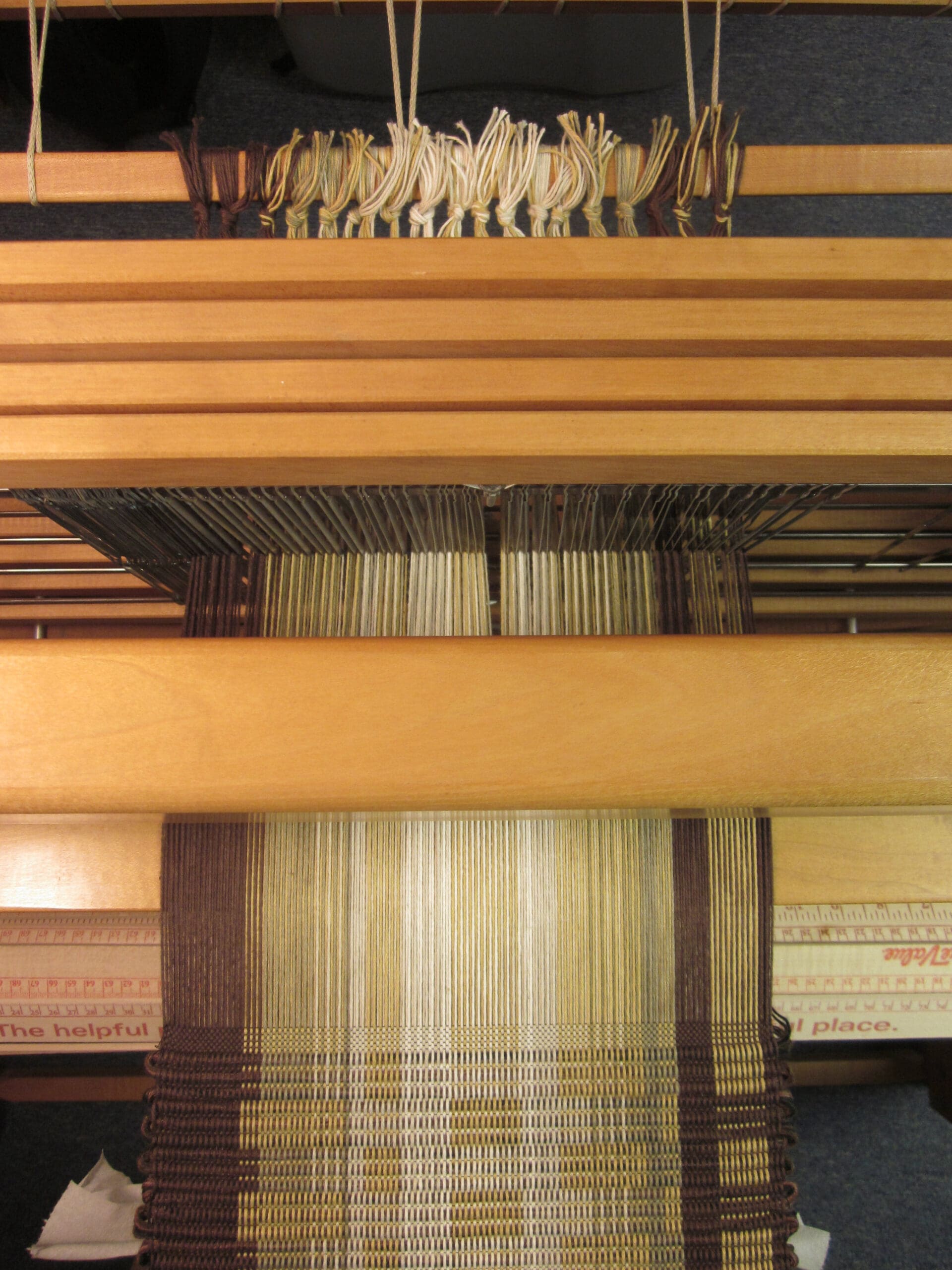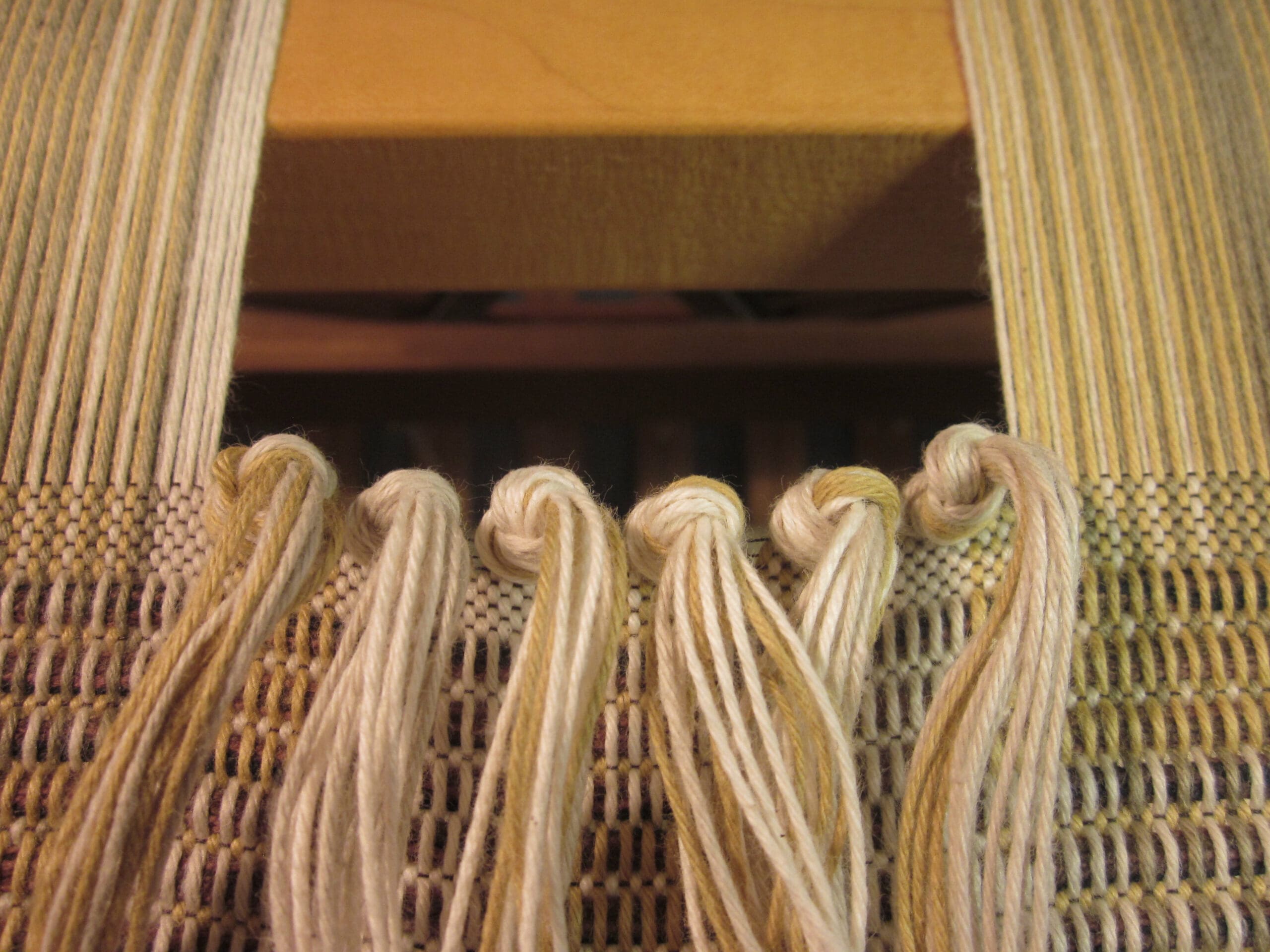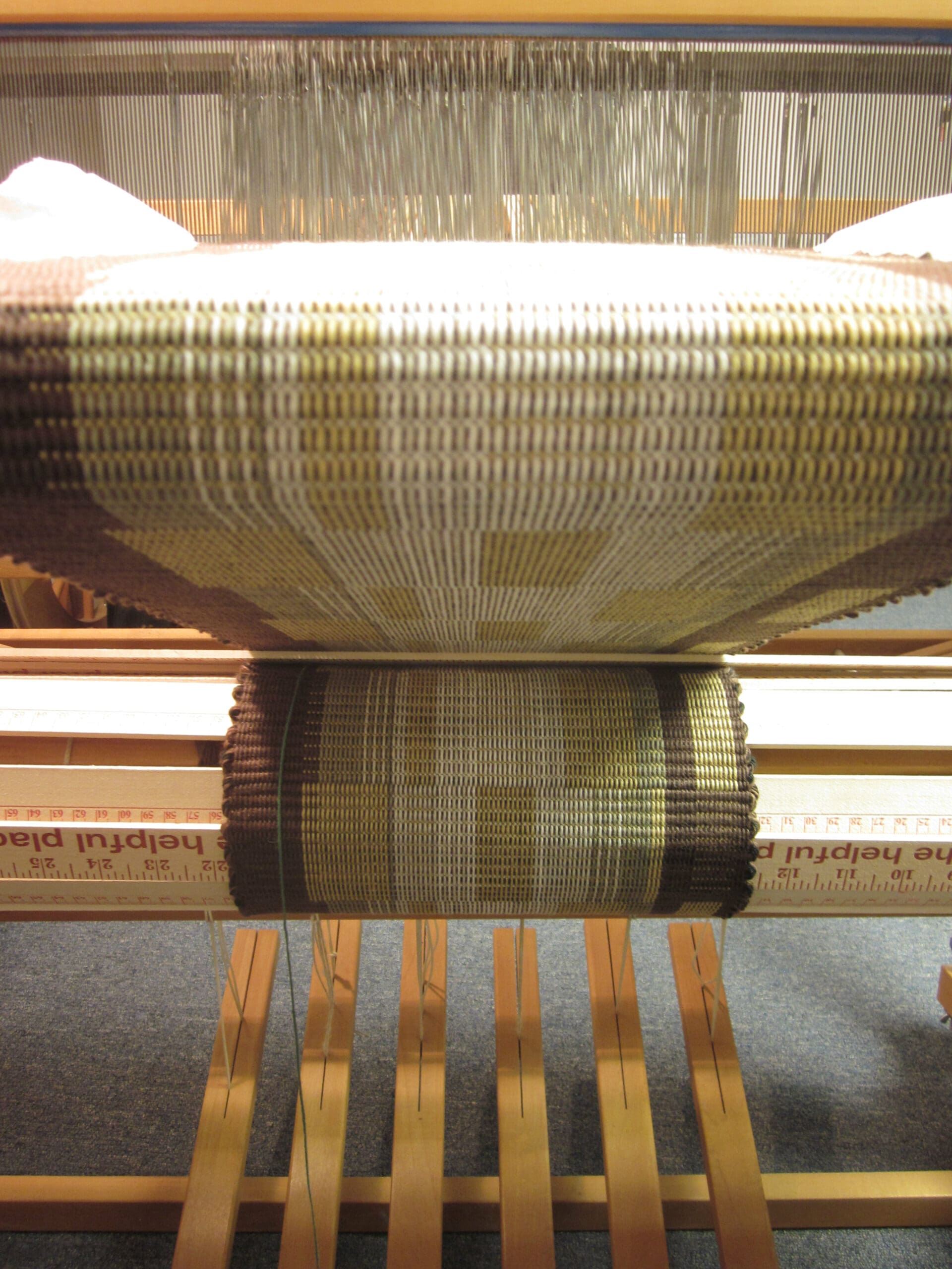 I have laid in a little toilet paper to keep the yarns from shifting, and then forwarded the project until I have enough “fringe inches”. After that, I still have a bit left. So, I’m weaving a little sample in an effort not to waste anything! As you can tell, the entire process is pretty labor intensive. So, I typically attempt to use nearly every inch of yarn on the loom! And all samples can later be transformed into something fun!
