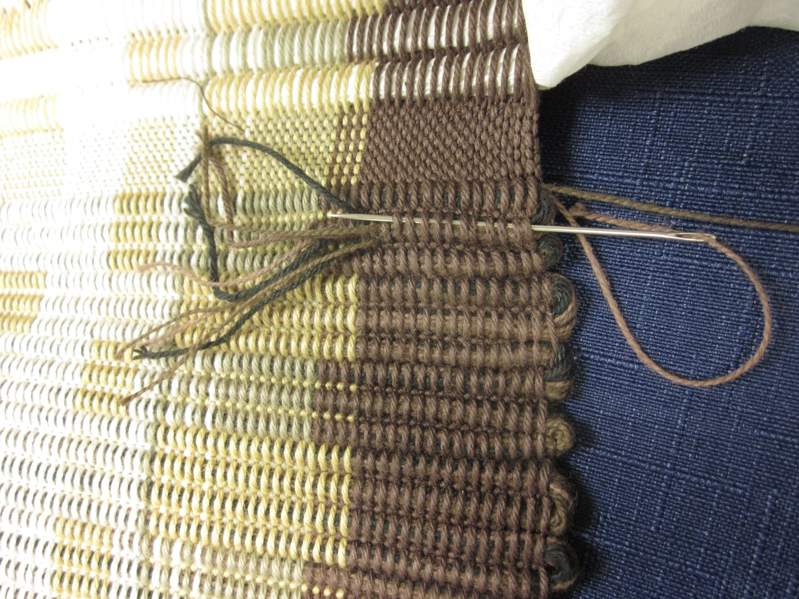 Once it’s off the loom, I need to tuck in any loose yarns. In many cases, I can tuck them in as I’m weaving! But, there are a few at the very end that you just can’t get around. At least, I haven’t figured out how yet! Never say never, right?