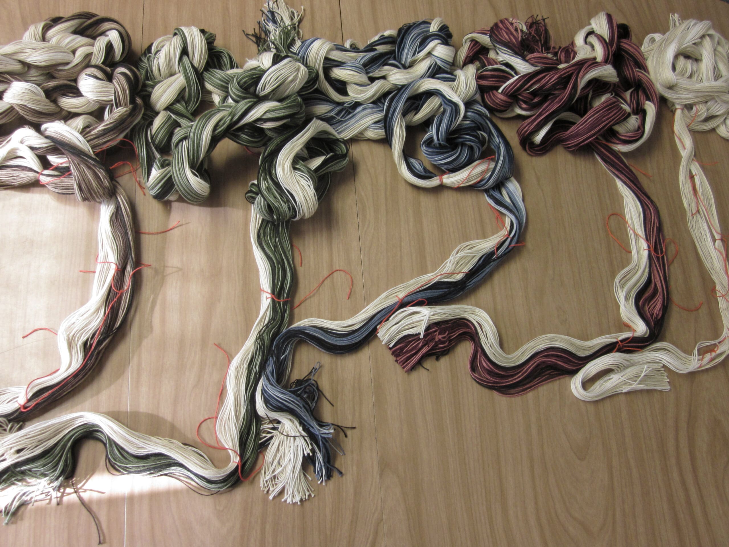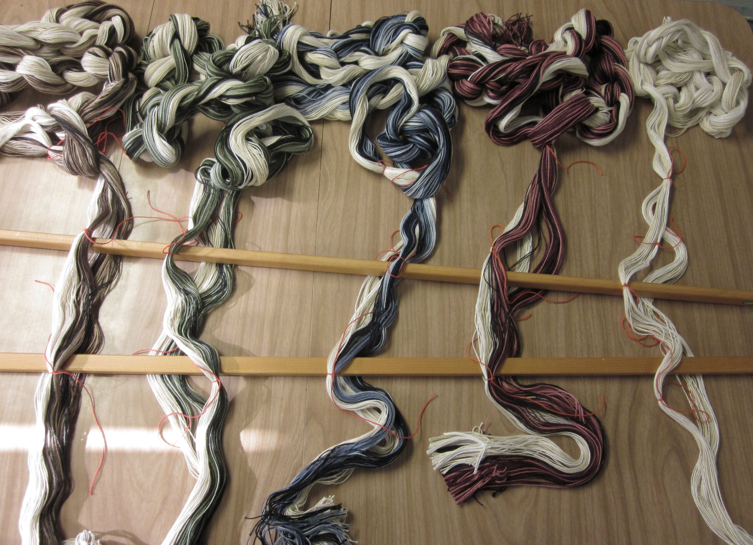 Before I slid the yarn off the warping board, I made sure to tie the yarns at the cross so I could find them at the table. You can see the red yarns above directing me where to place the lease sticks!