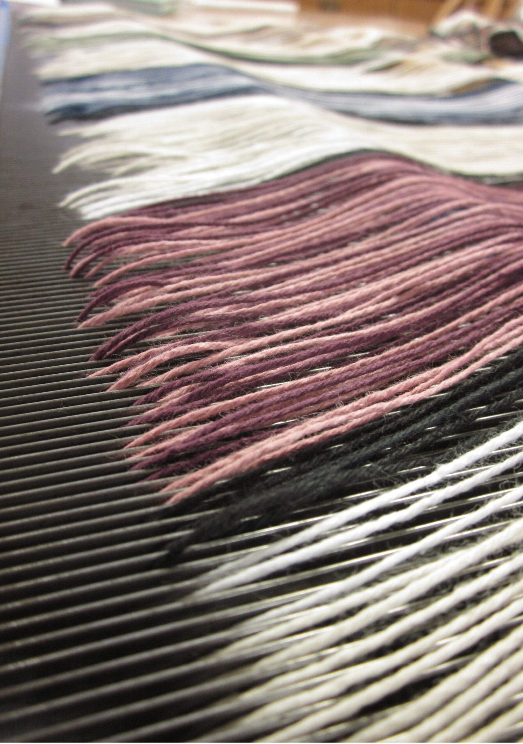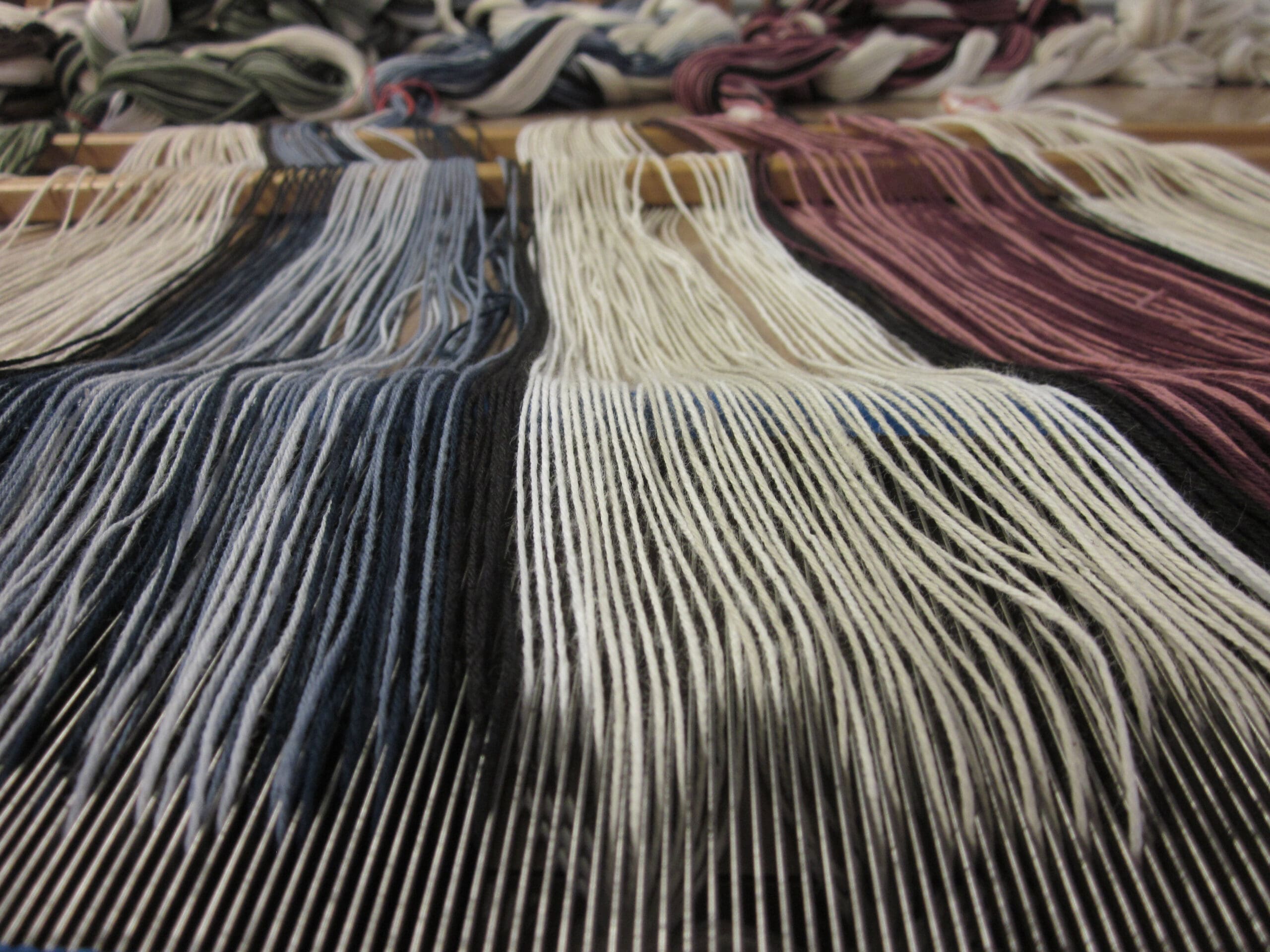 I decided to create a warp (series of yarns that will be held under tension in the loom) with wide bands of color. In between each, just a bit of white and natural yarns.