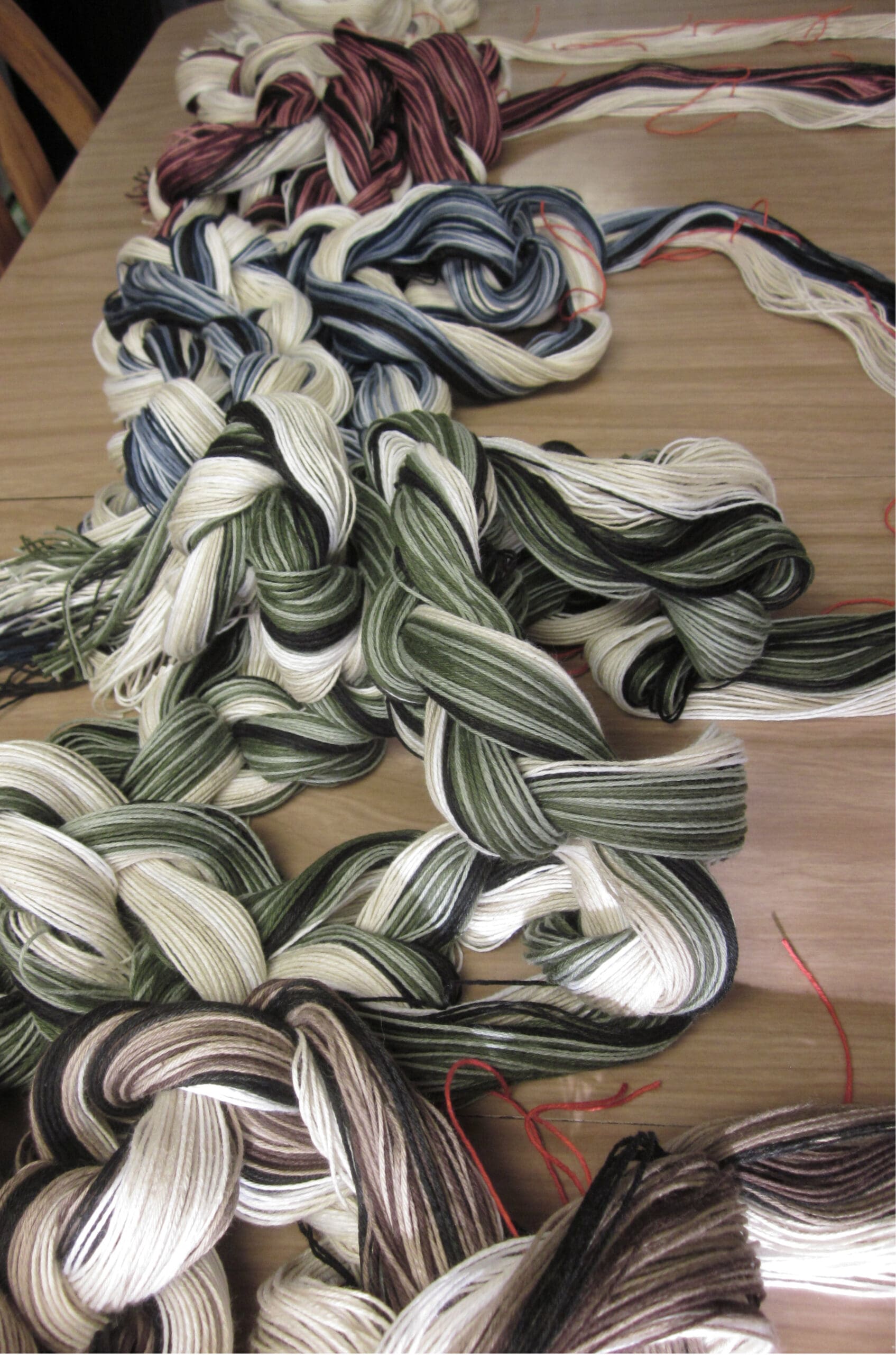 With a project this size, it’s pretty typical to measure the yarns in chunks since the entire project won’t stay on the pegs. So, I broke it up by color! Thus, a group of brown, green, blue and cranberry! Once everything is completed at the warping board, it all converges together at the table where I’ll sley the reed!