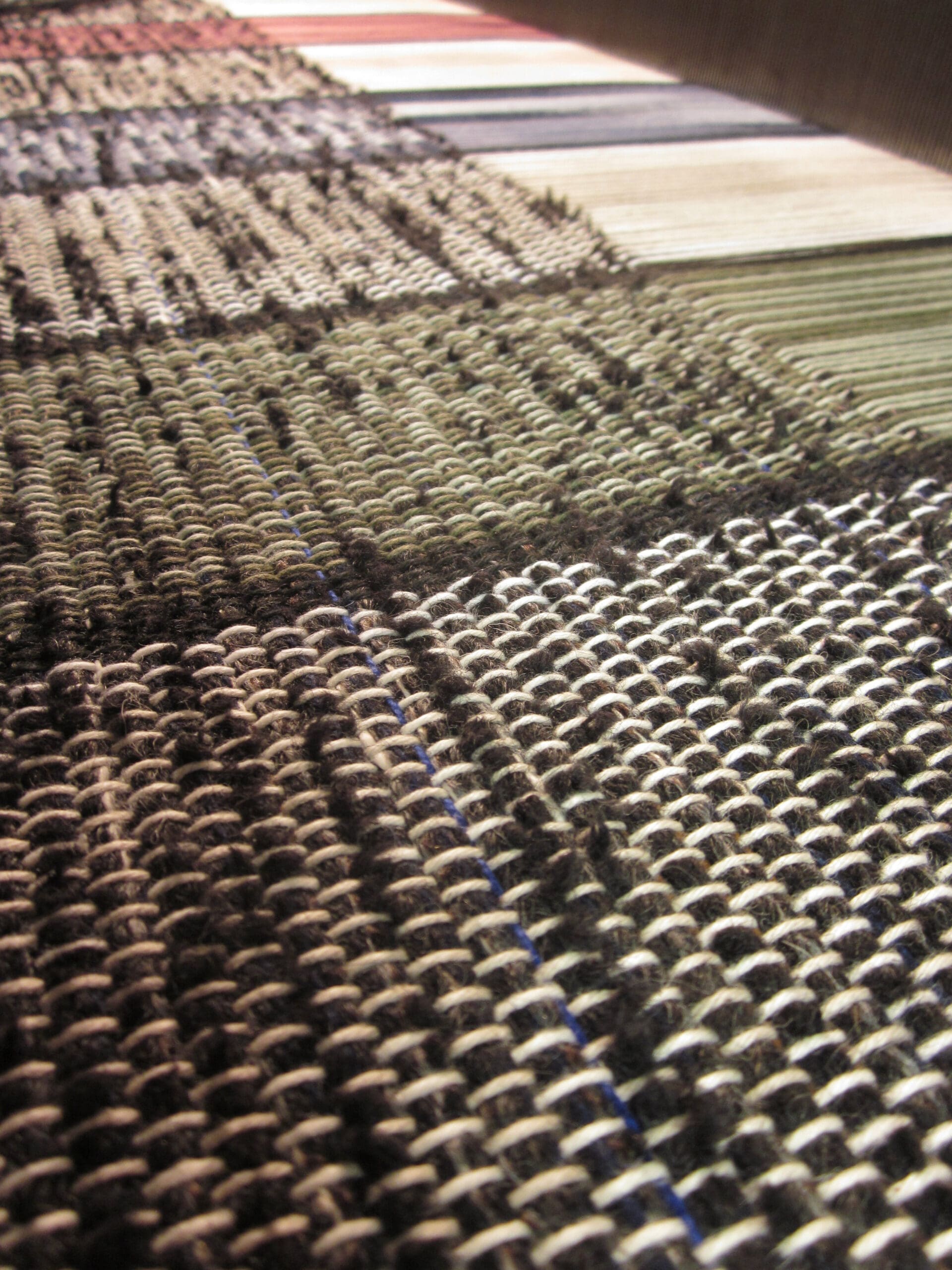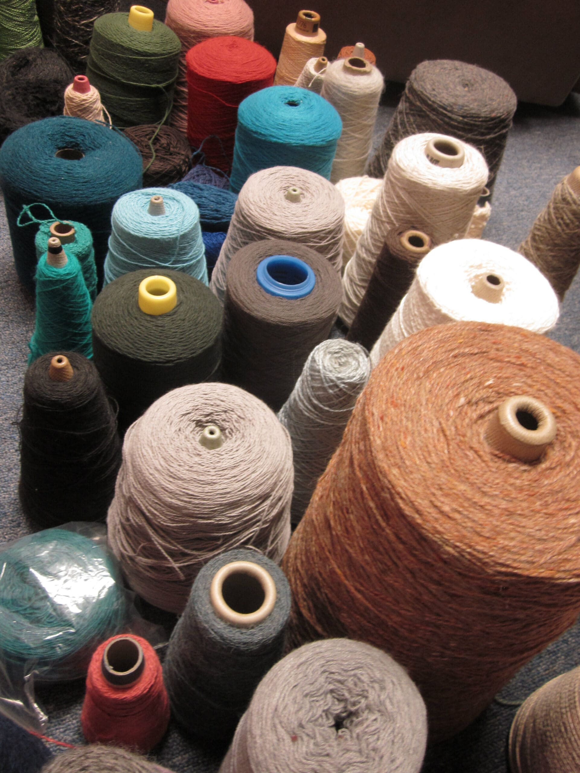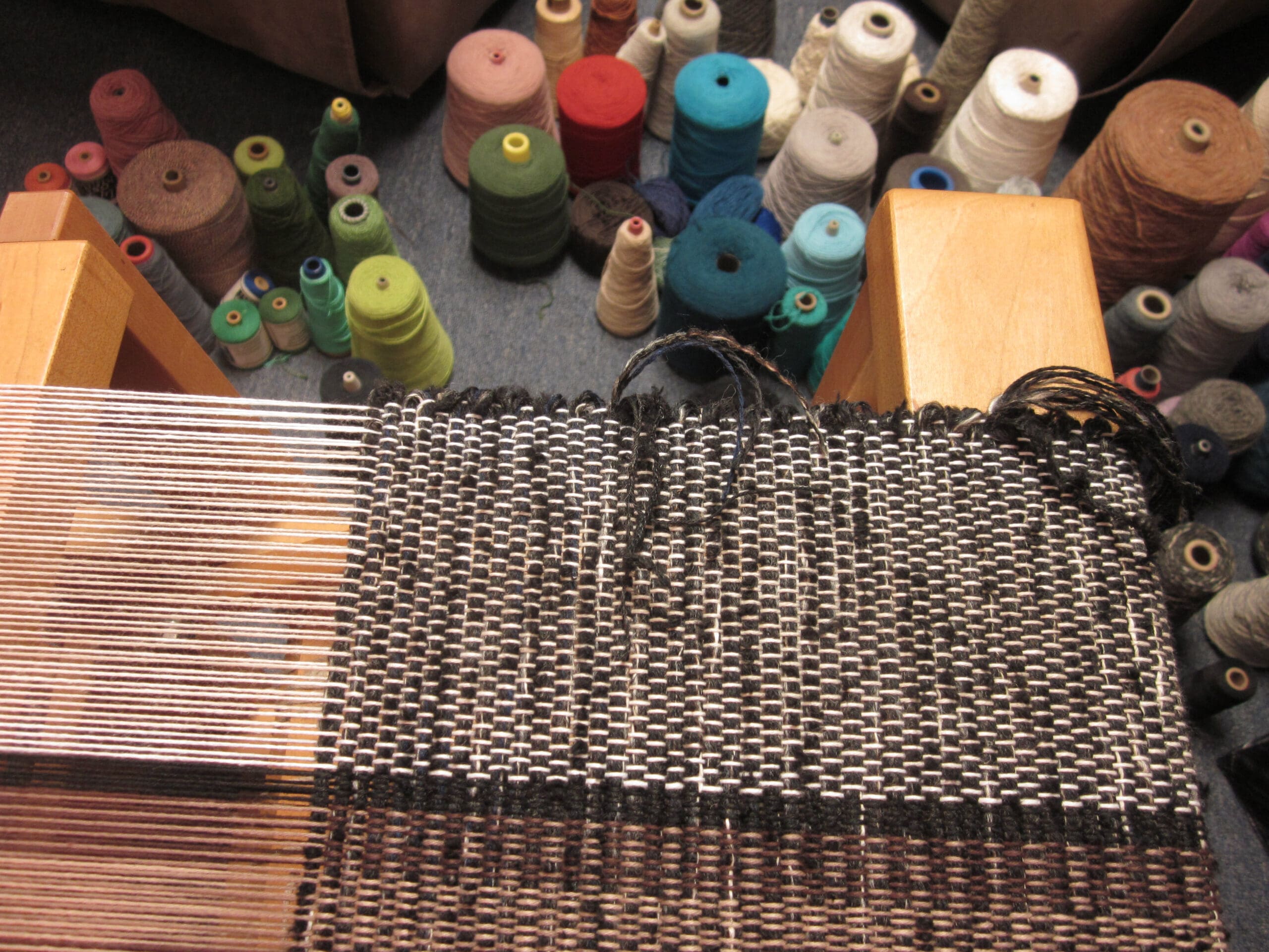 For this project, I selected yarns that follow the colors in the warp (yarns wound on to the loom). So, browns, blues, reds/roses, greens, whites and blacks/grays were all yanked out the shelves and planted right next to the loom. This method makes for tricky traveling around the loom since I don’t usually leave much of an aisle. But, having all the yarns right there allows me to plan for the next shuttle-full and it just makes me happy! So there you have it! (This is part of the fun of being an artist – getting to do what makes you happy!)