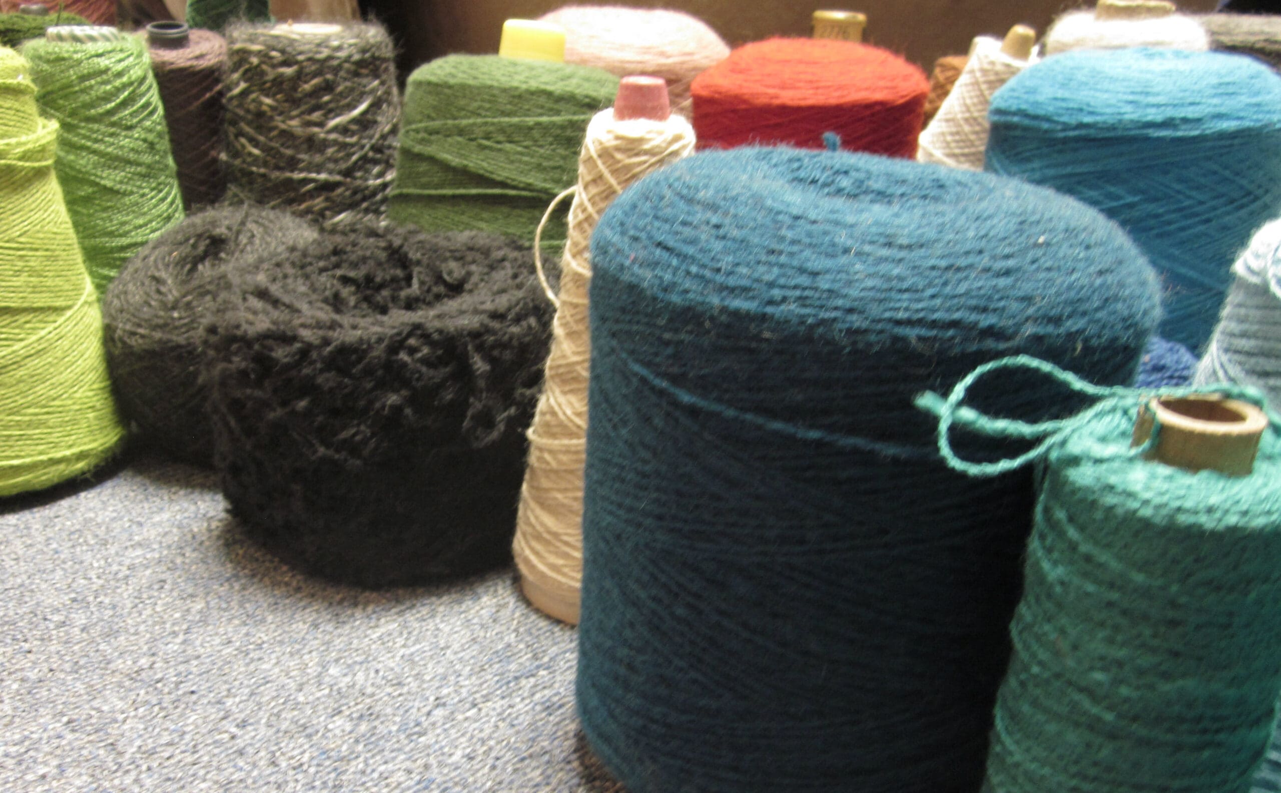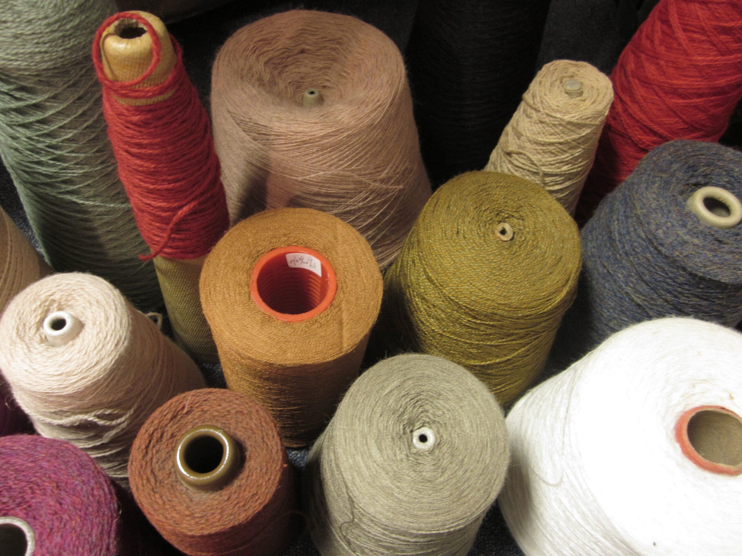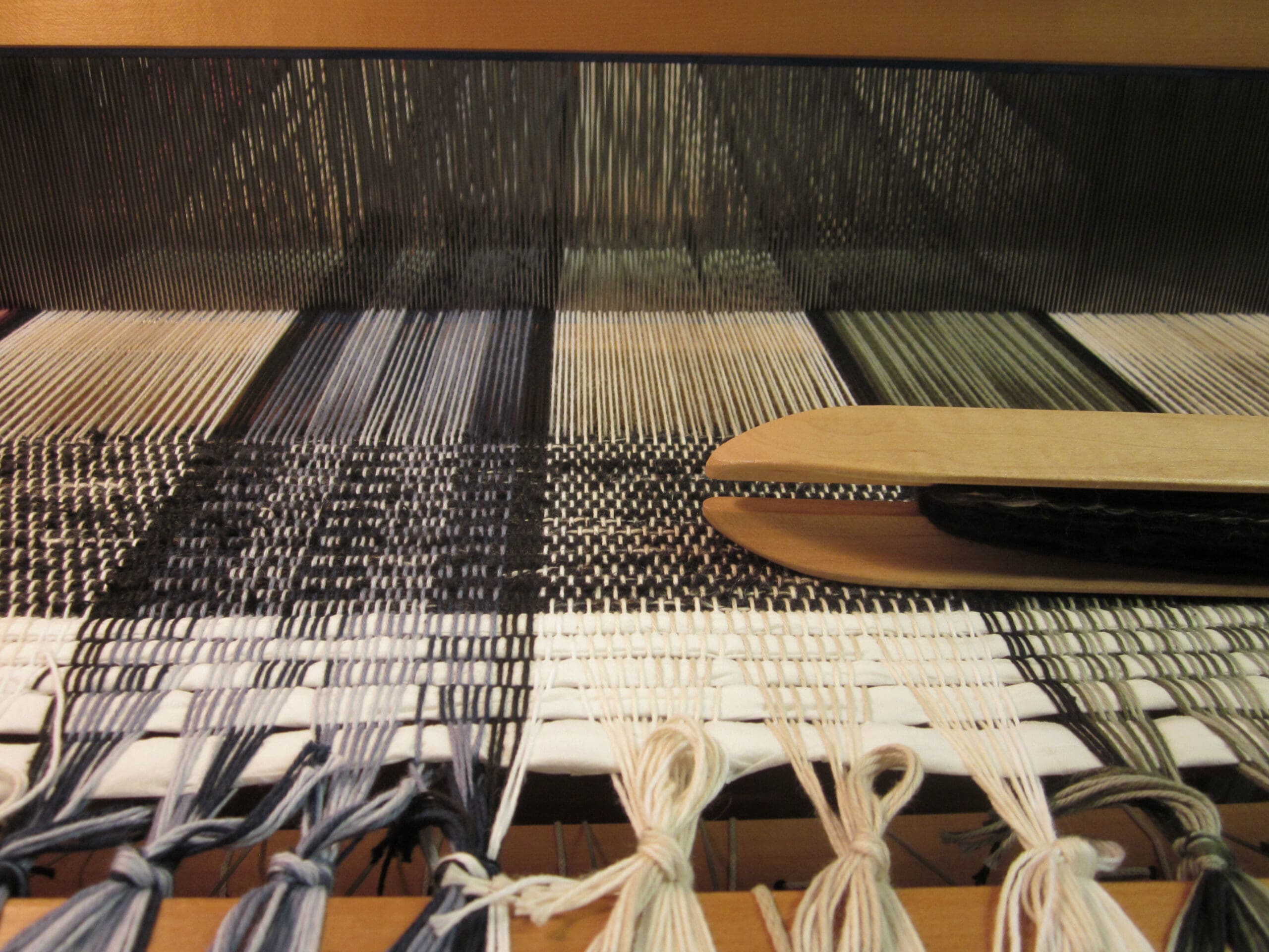 For this project, I selected yarns that follow the colors in the warp (yarns wound on to the loom). So, browns, blues, reds/roses, greens, whites and blacks/grays were all yanked out the shelves and planted right next to the loom. This method makes for tricky traveling around the loom since I don’t usually leave much of an aisle. But, having all the yarns right there allows me to plan for the next shuttle-full and it just makes me happy! So there you have it! (This is part of the fun of being an artist – getting to do what makes you happy!)