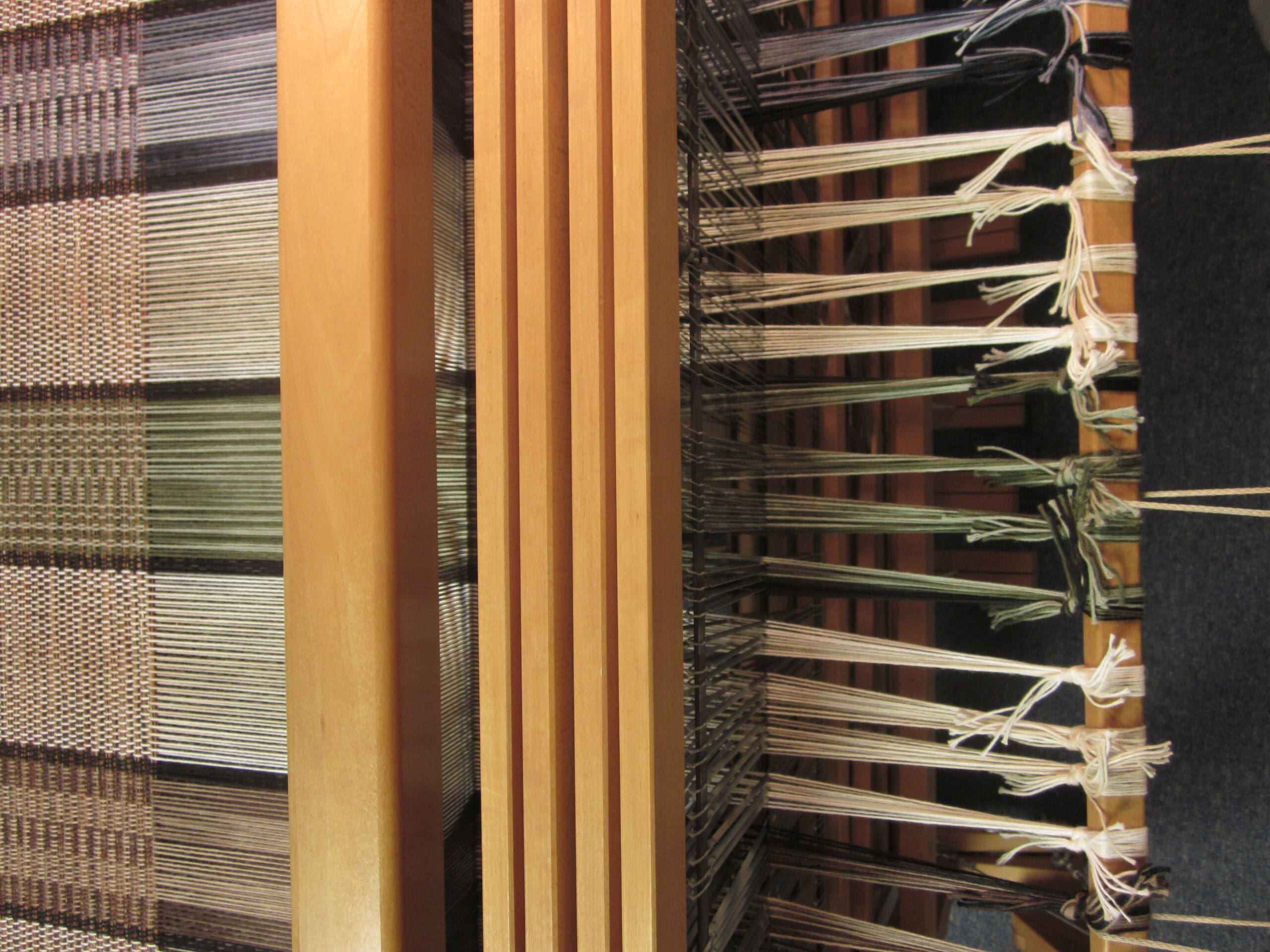The end is in sight! How do you know, you ask? Well, these cute little knots come rolling around the back and pretty soon, there isn’t enough space left to throw the shuttle! It’s a physics thing, really! If shuttle “A” no longer fits through yarns “B & C”, you are done weaving!