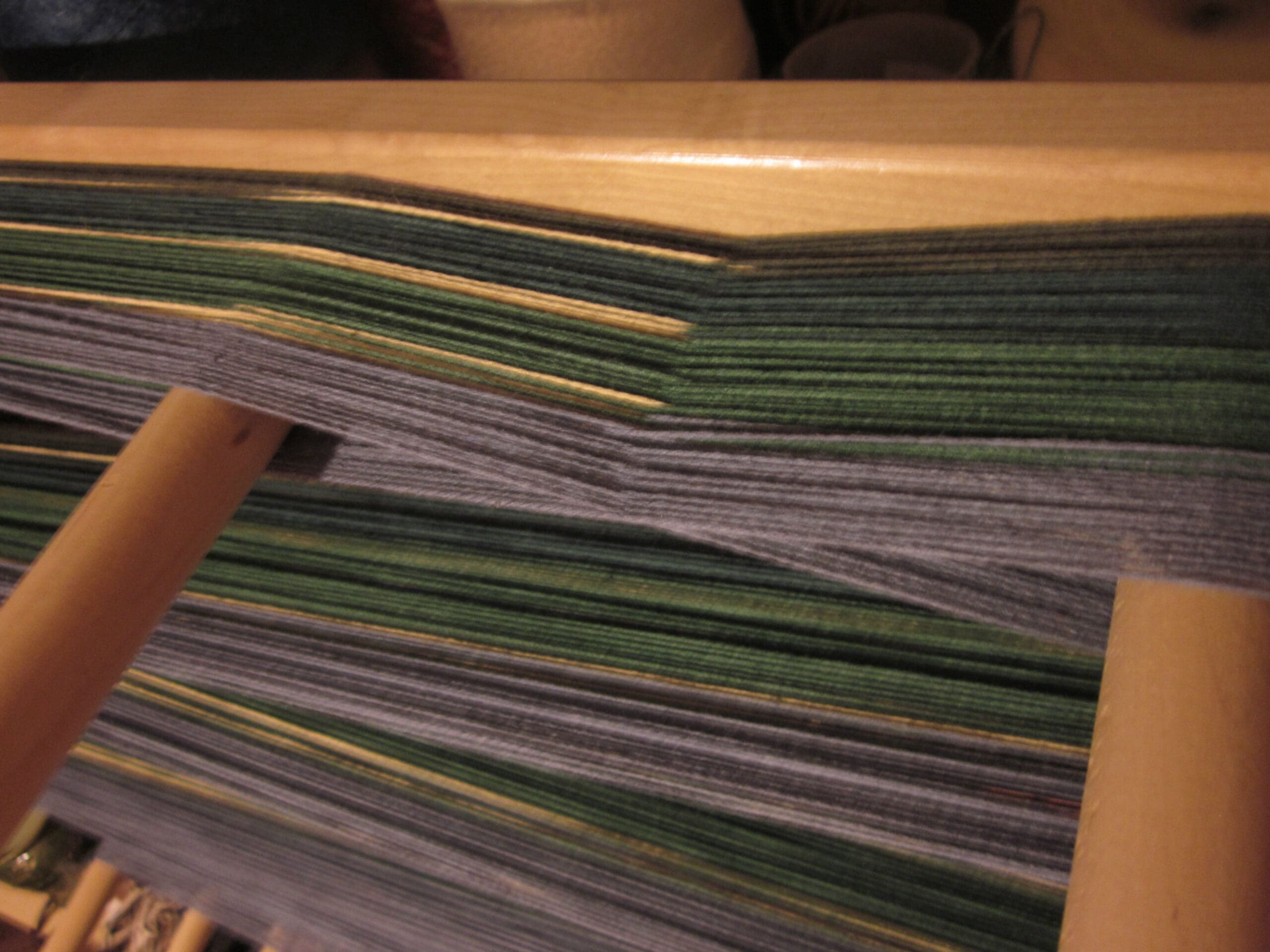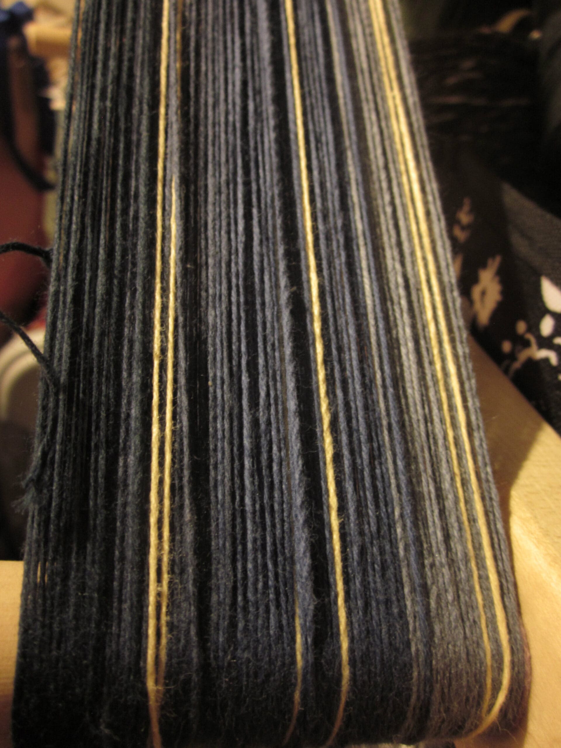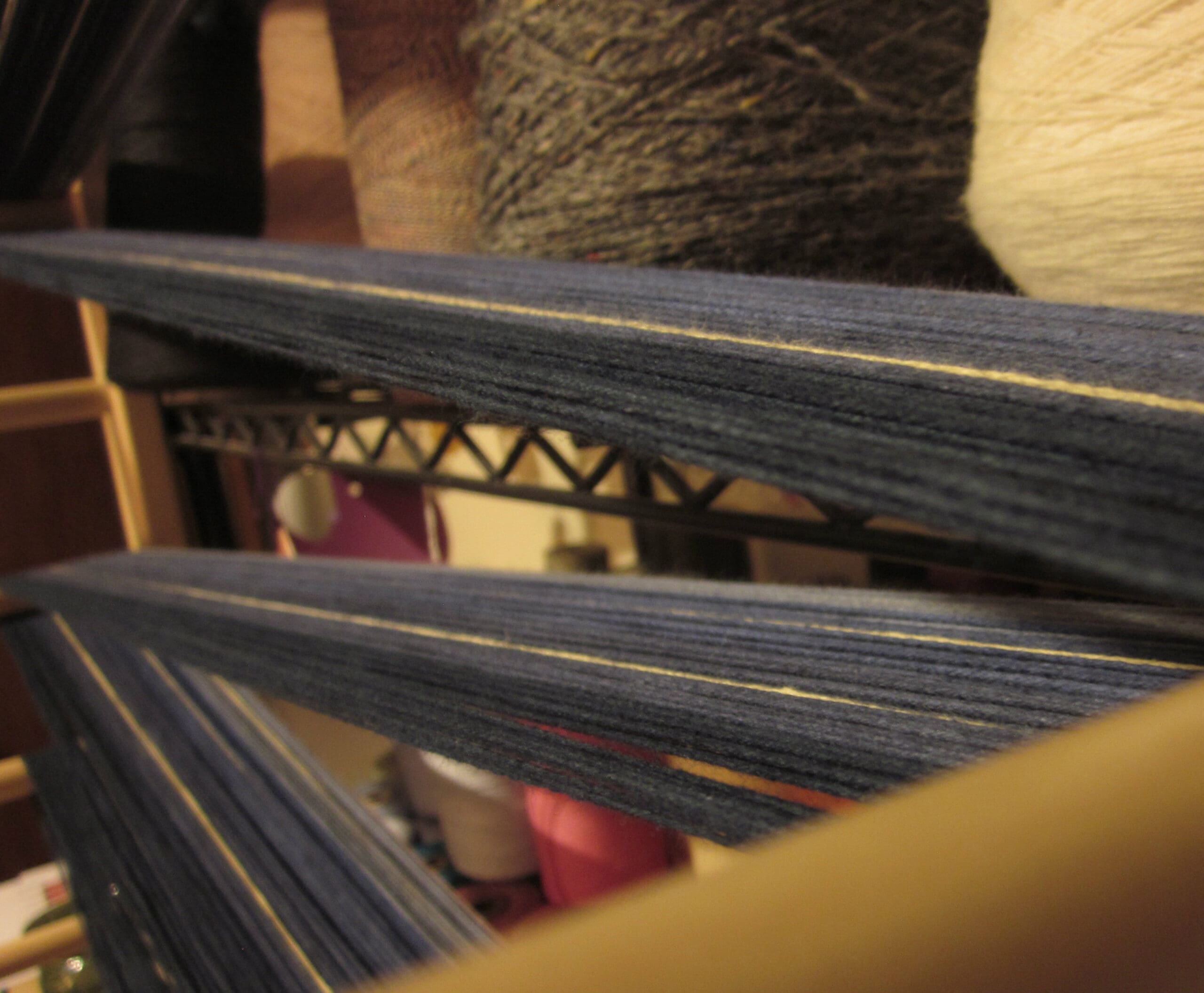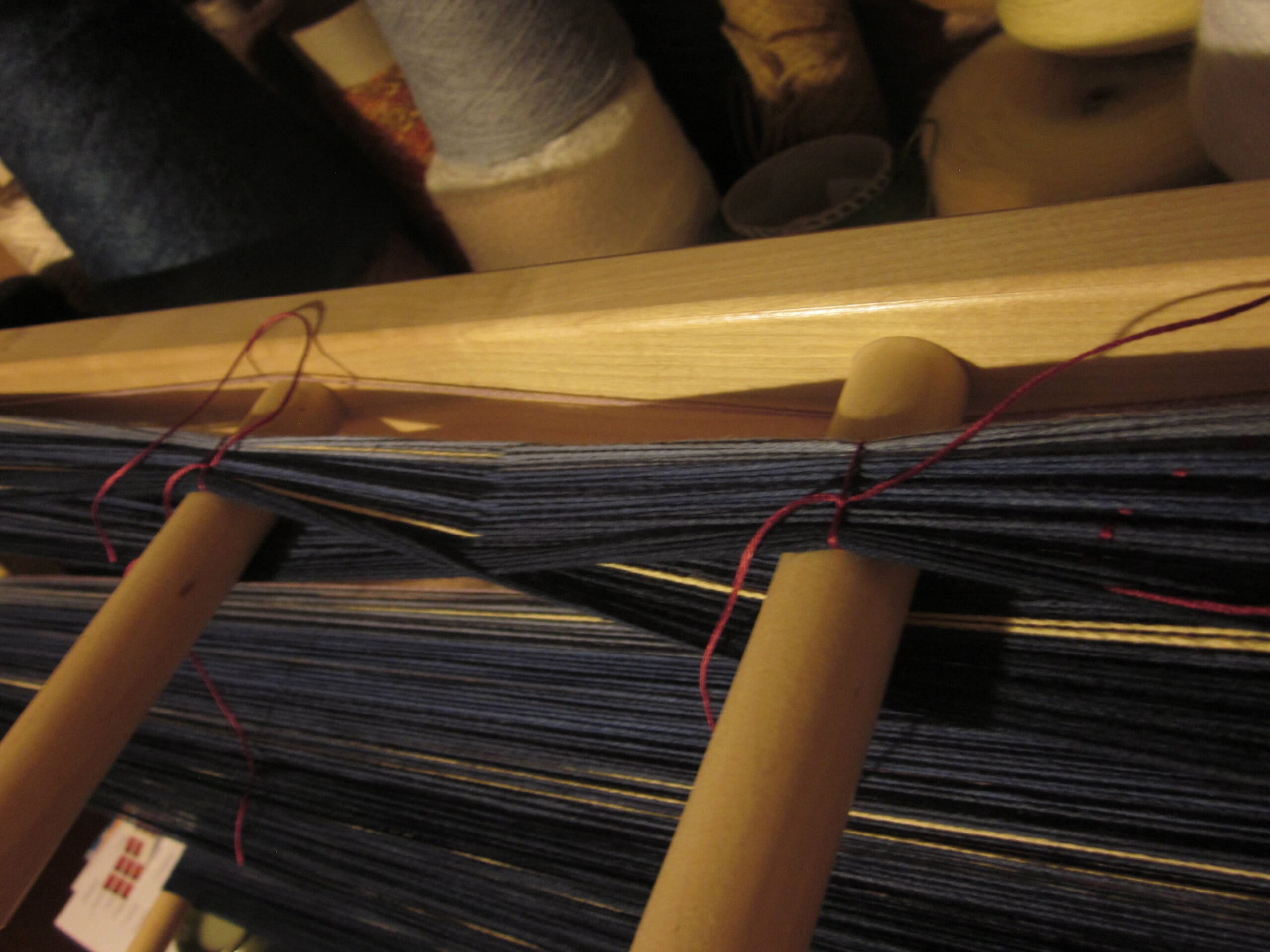 You want to keep the yarns in order on the warping board, so you don’t have to redetermine the order somewhere else in the process. So, weavers use a “cross” to do that! When you move down the board, you go over the left peg & under the right, and when you move up the board, you go over the right peg & under the left! At the intersection of all the yarns, you can see the order! It’s a fairly brilliant concept for whoever thought of it! Thank you, Ms. Cross Inventor! (Yes, it could be a Mister. But it’s my fictional character and Ms. it is! Funny, in my head, she looks sort of like Grandma… )