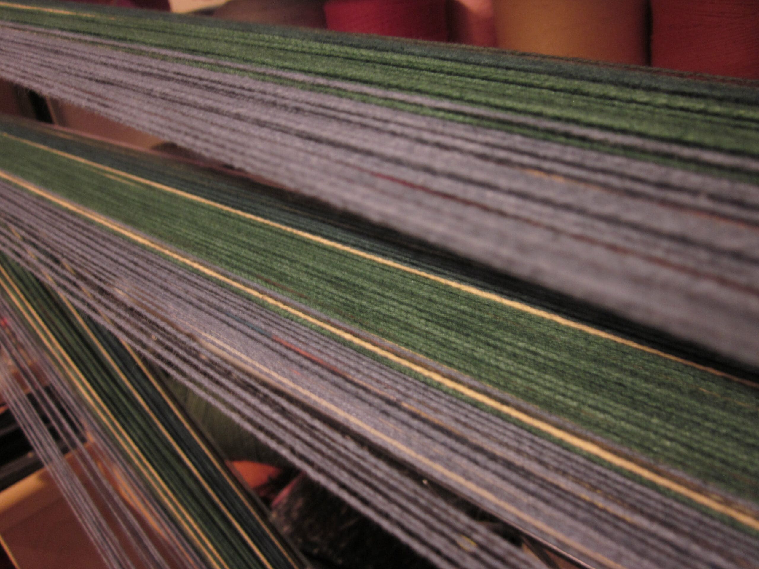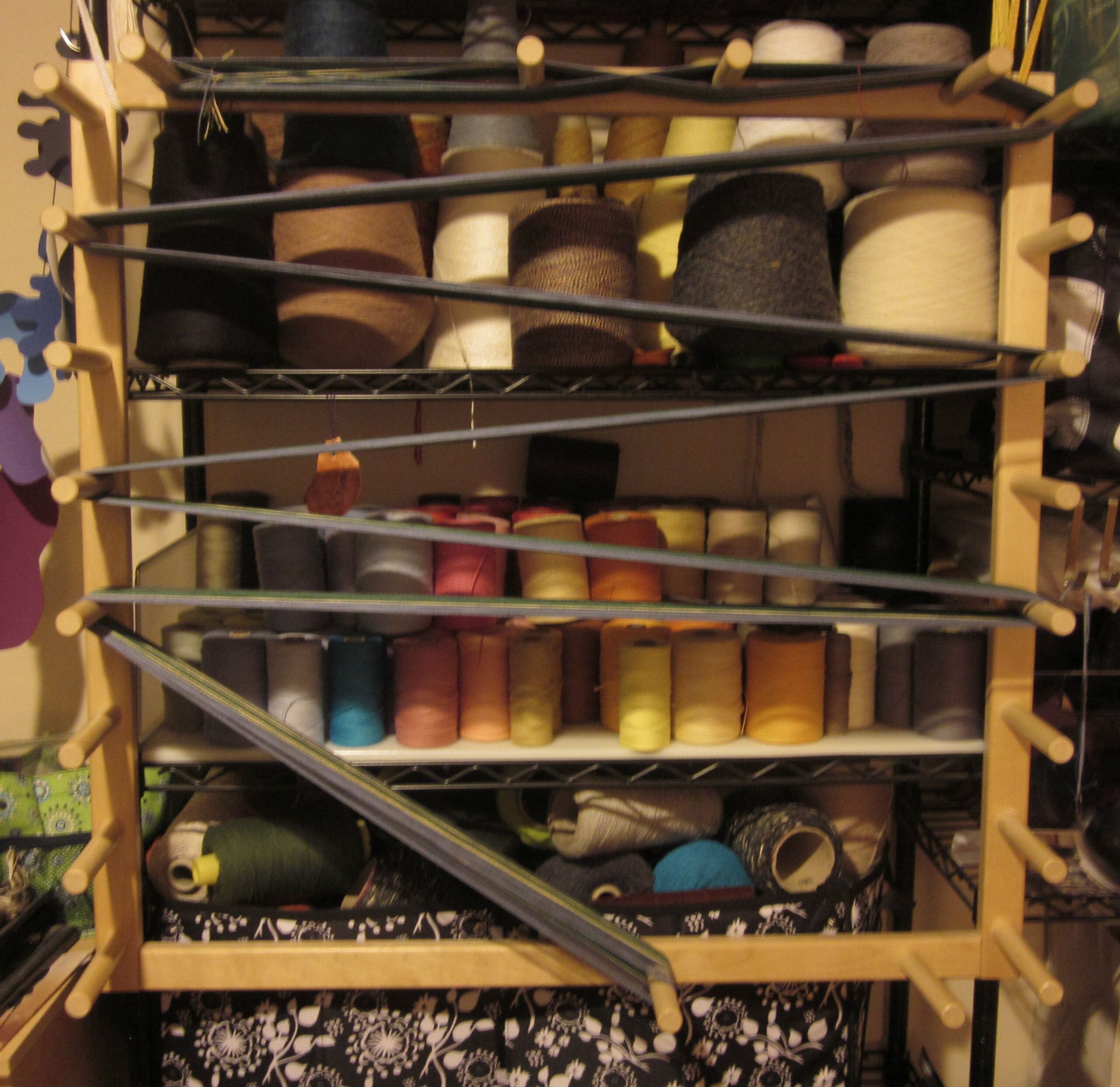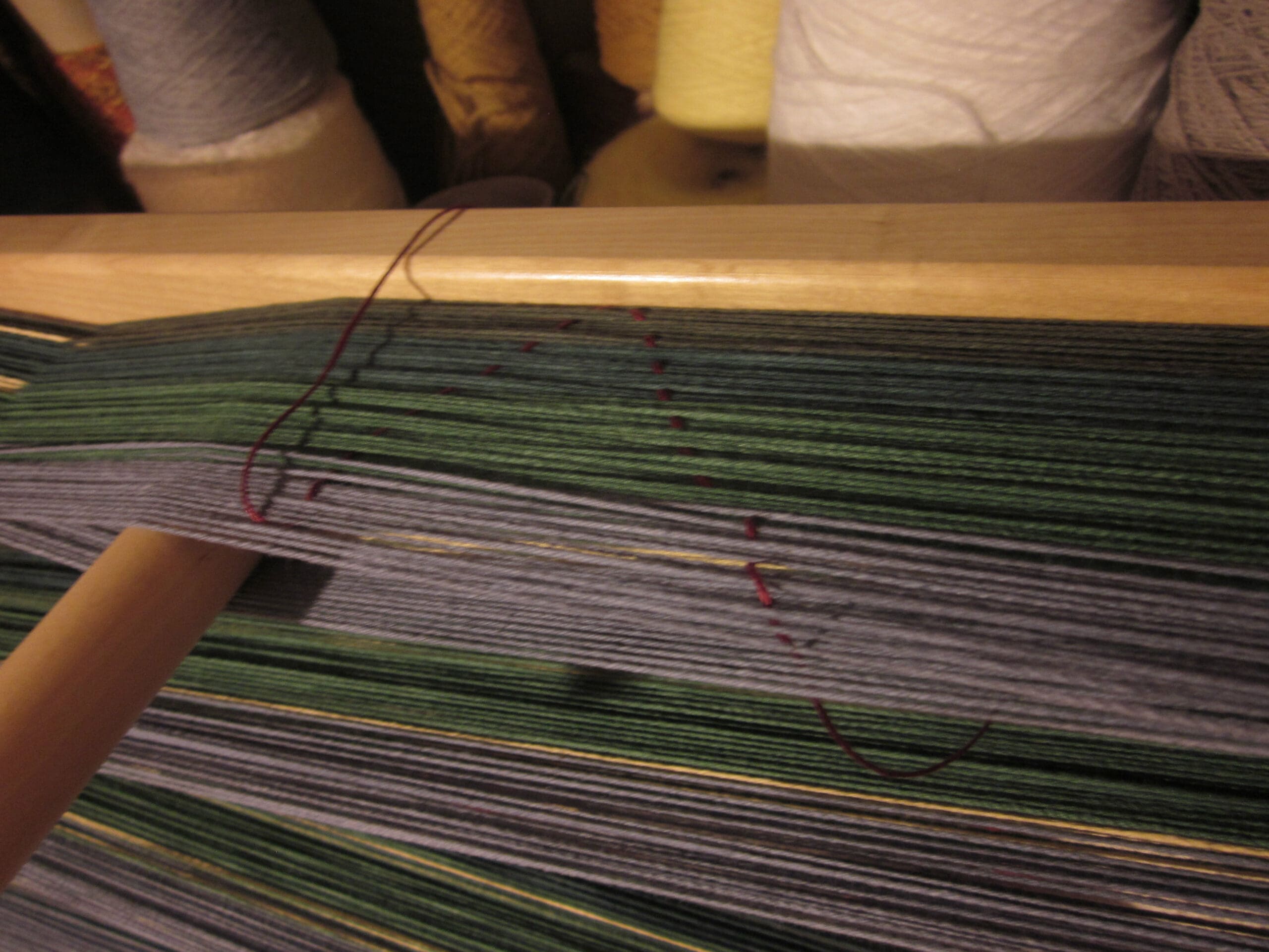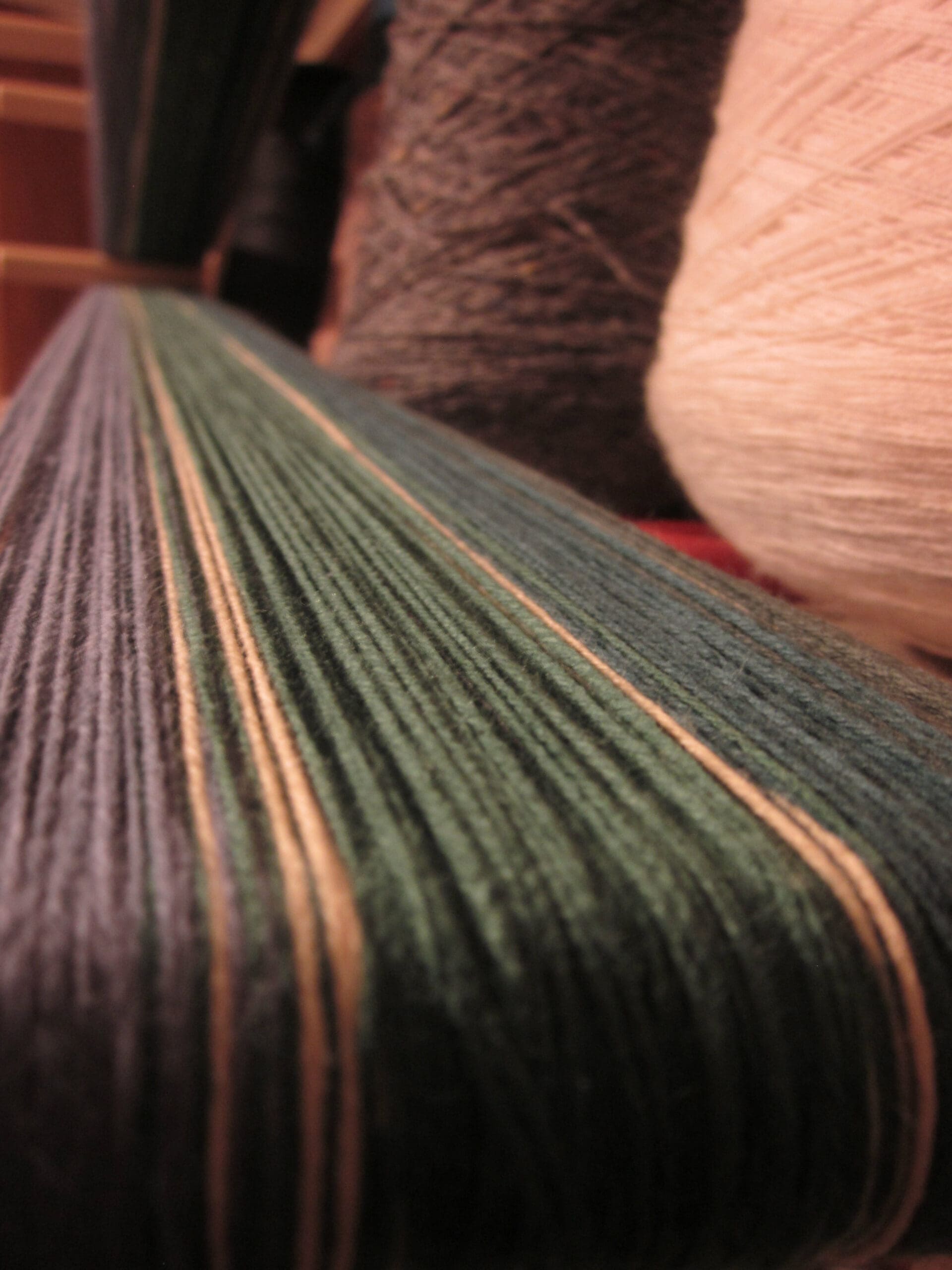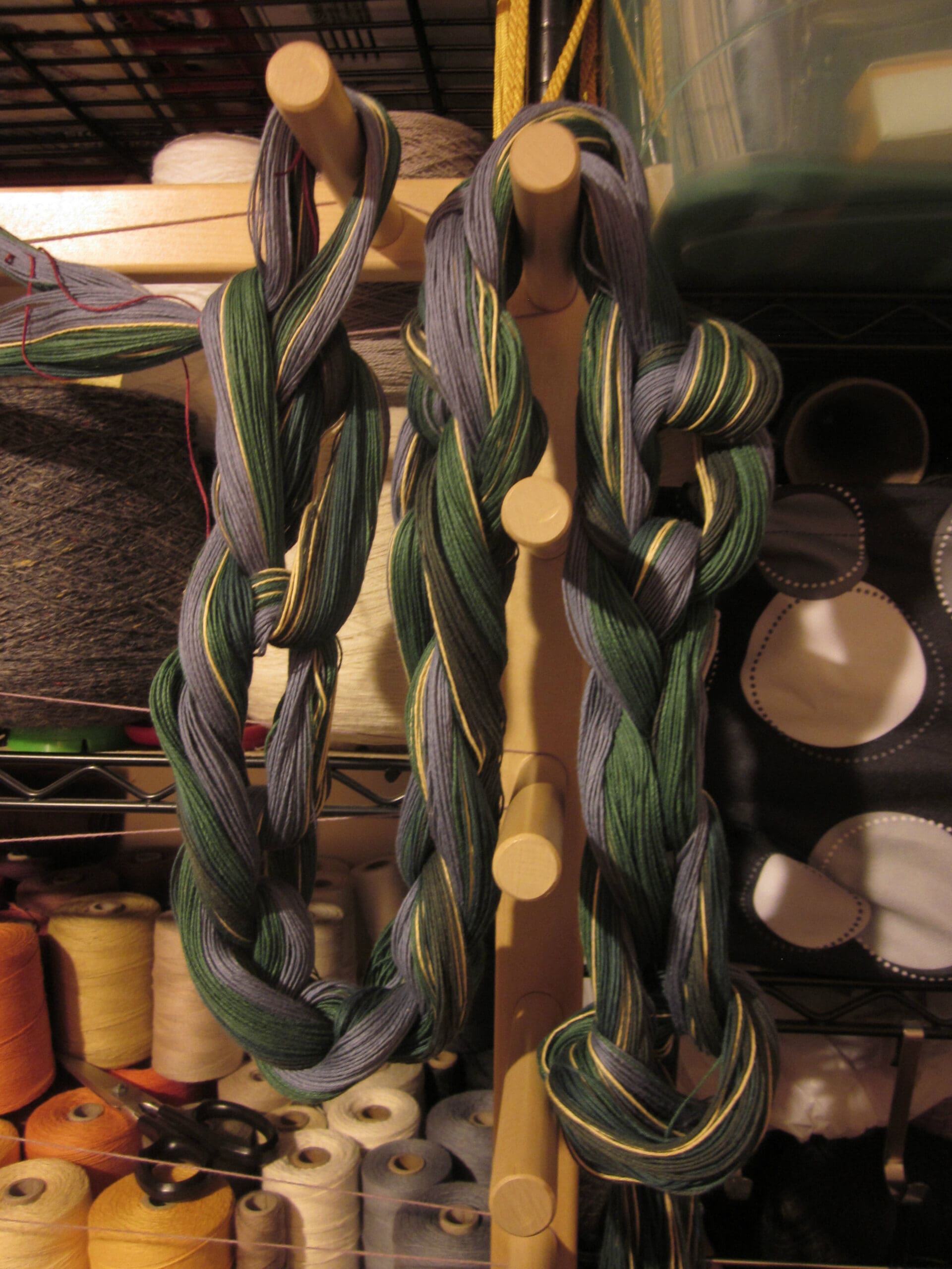 You want to keep the yarns in order on the warping board, so you don’t have to redetermine the order somewhere else in the process. So, weavers use a “cross” to do that! When you move down the board, you go over the left peg & under the right, and when you move up the board, you go over the right peg & under the left! At the intersection of all the yarns, you can see the order! It’s a fairly brilliant concept for whoever thought of it! Thank you, Ms. Cross Inventor! (Yes, it could be a Mister. But it’s my fictional character and Ms. it is! Funny, in my head, she looks sort of like Grandma… )