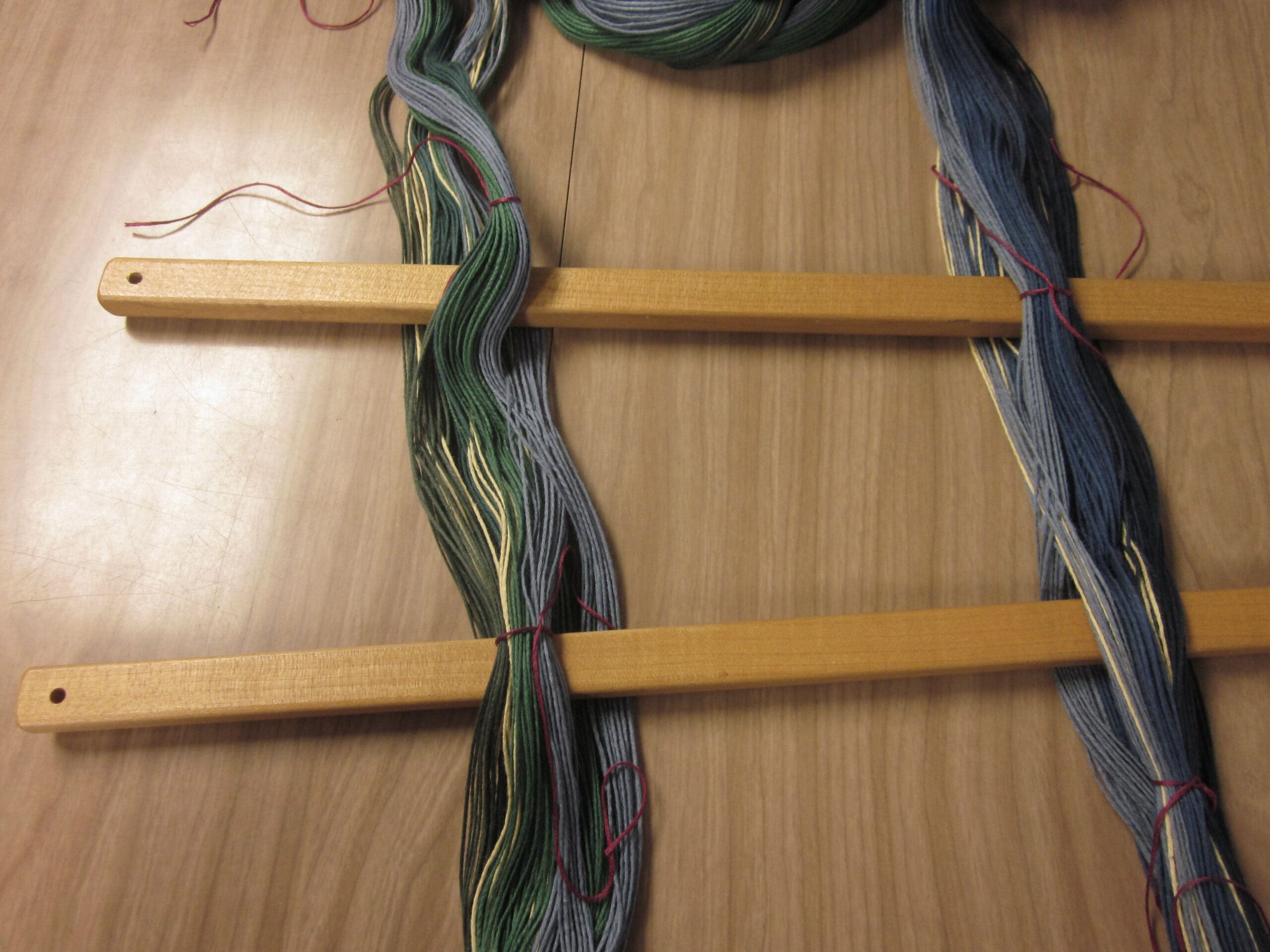 First off, I slid my lease sticks into the yarn where I marked the cross – thus, keeping the yarns in order. (By the way, it’s critical to tie the 2 ends of the lease sticks together once they are in. If you forget, the slippery little things will slide right out at some point! So, I’ll be tying those right now!)