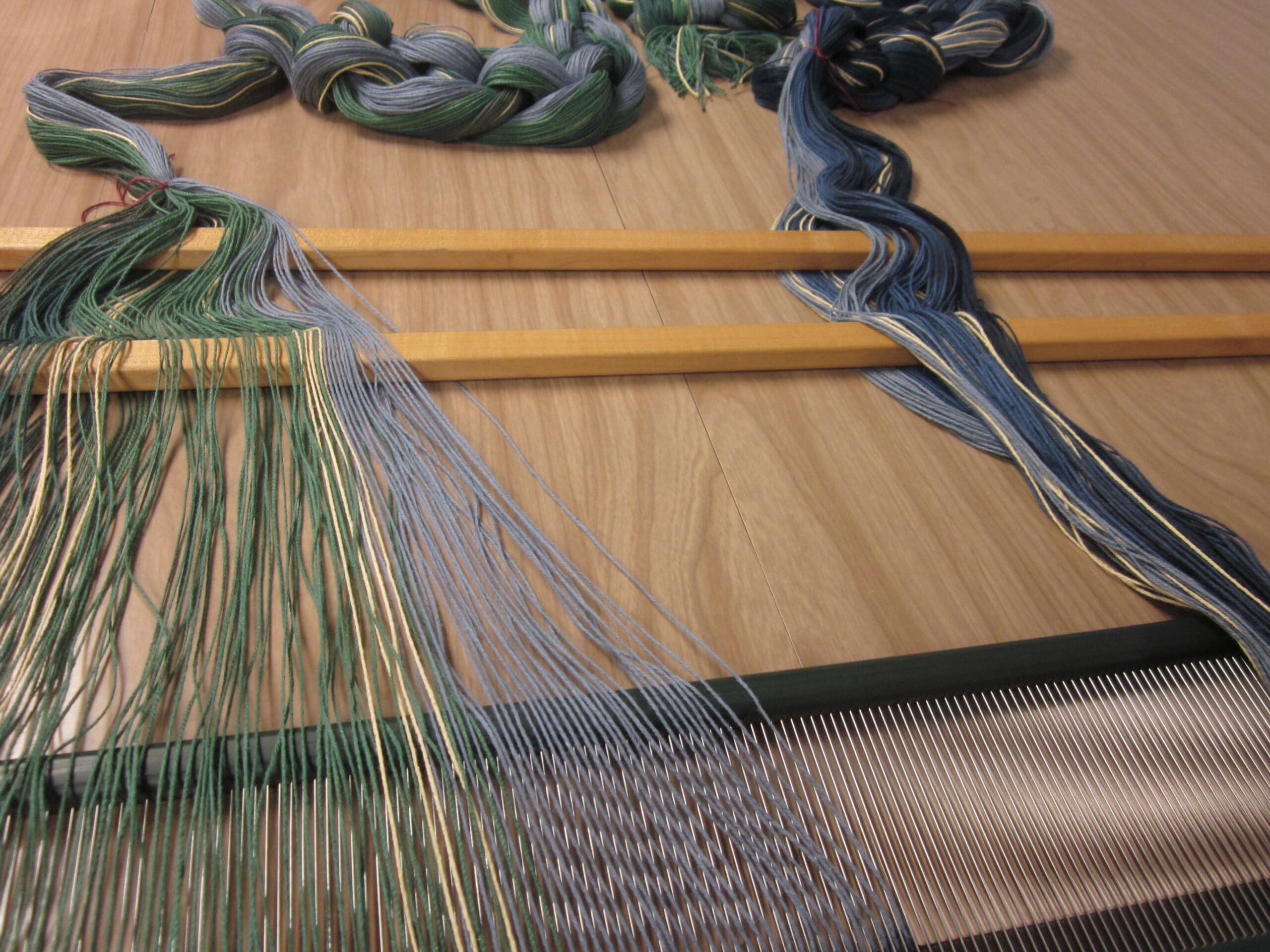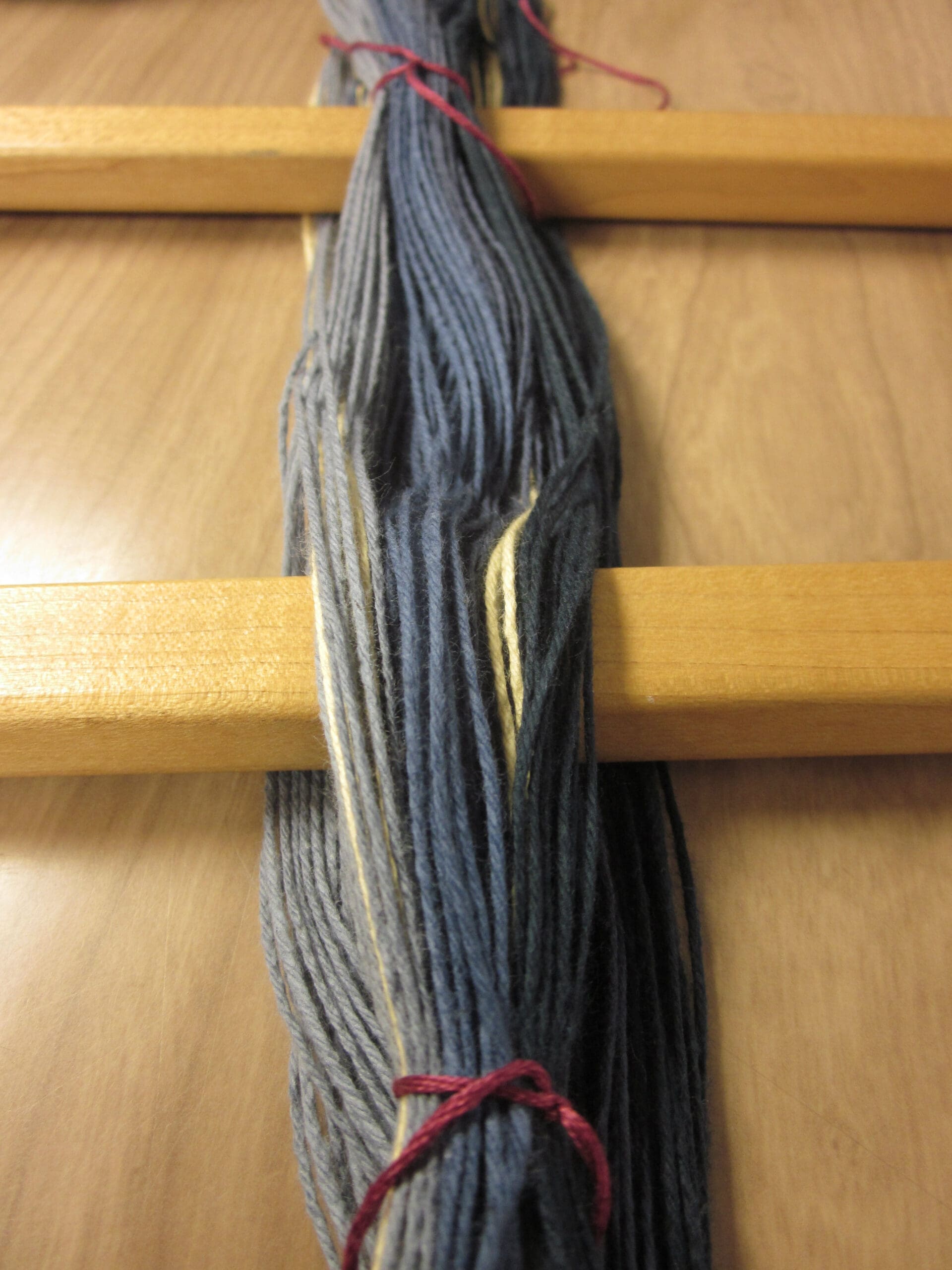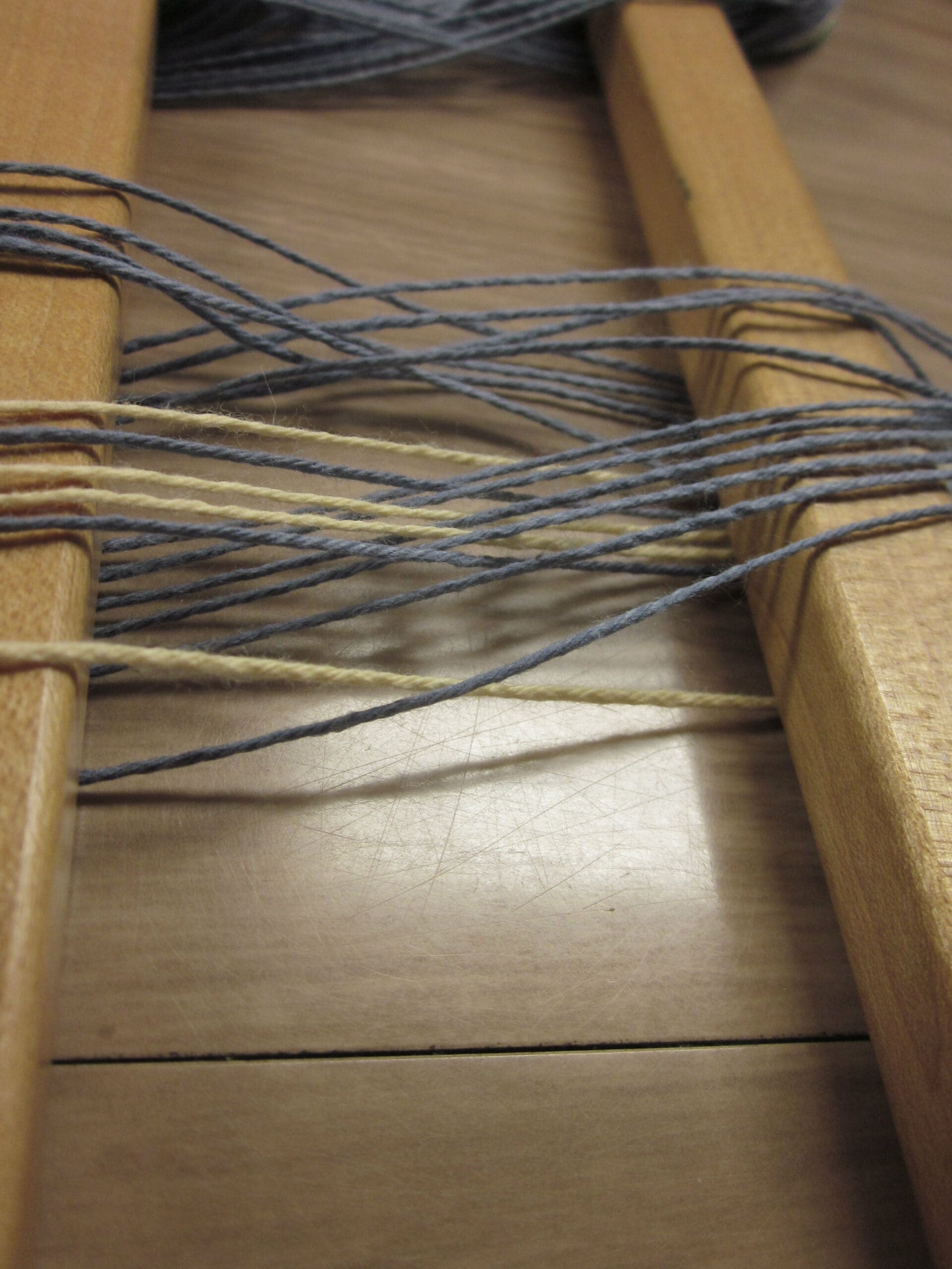 As you take a peek at the image above, you can see which yarn is in front of the other. That’s what I’m referring to when I say you can “read” the order! (The grey/blue yarn closest to us would be first, then the cream-colored, then the next grey/blue, etc… Now, you too can be an expert in sleying the reed!)