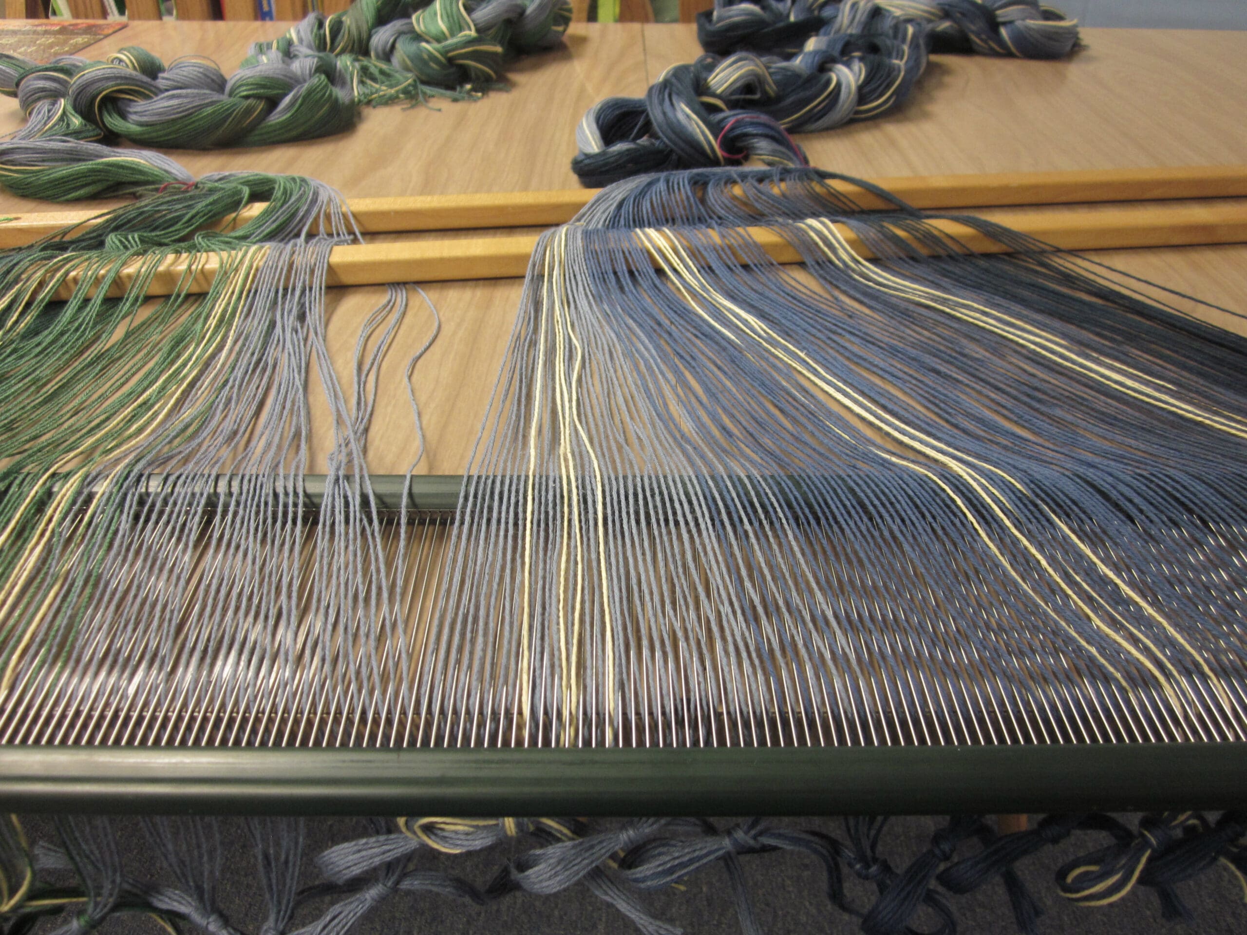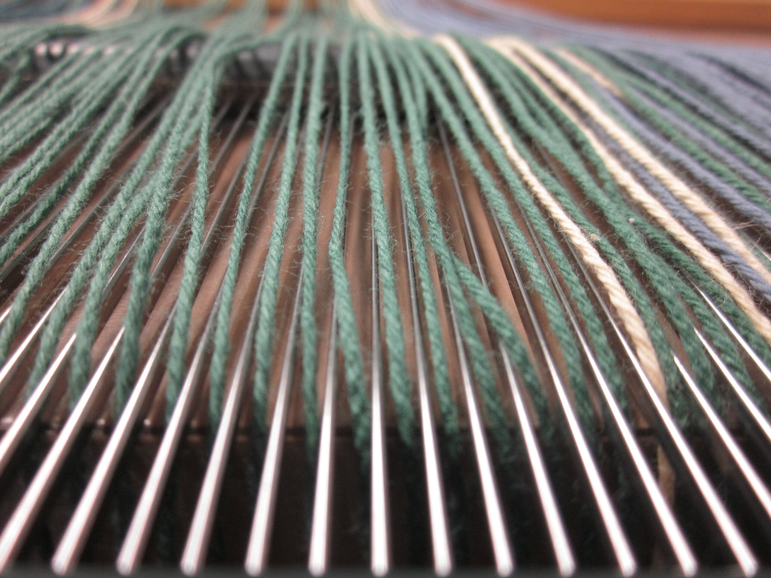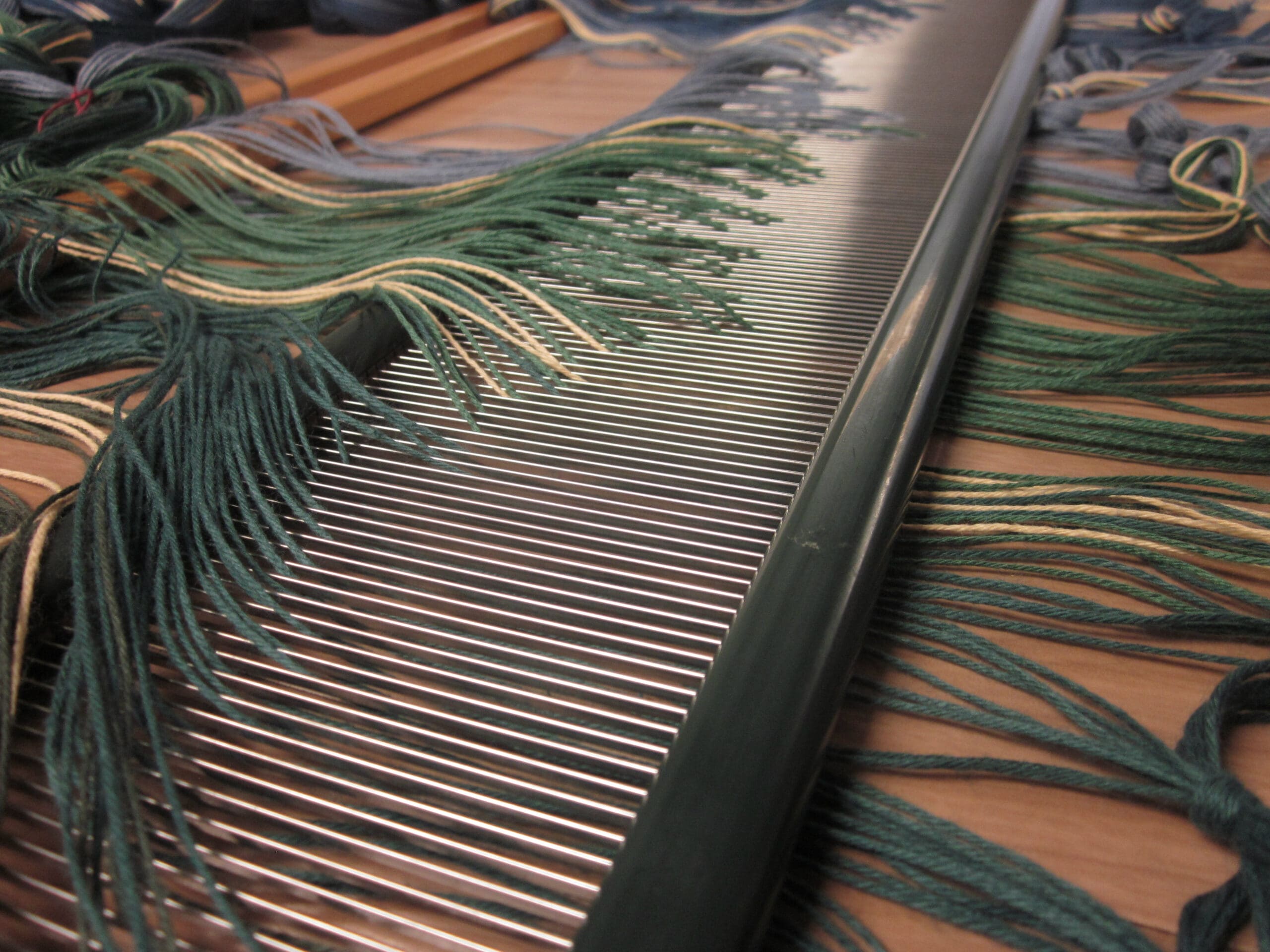 As you take a peek at the image above, you can see which yarn is in front of the other. That’s what I’m referring to when I say you can “read” the order! (The grey/blue yarn closest to us would be first, then the cream-colored, then the next grey/blue, etc… Now, you too can be an expert in sleying the reed!)