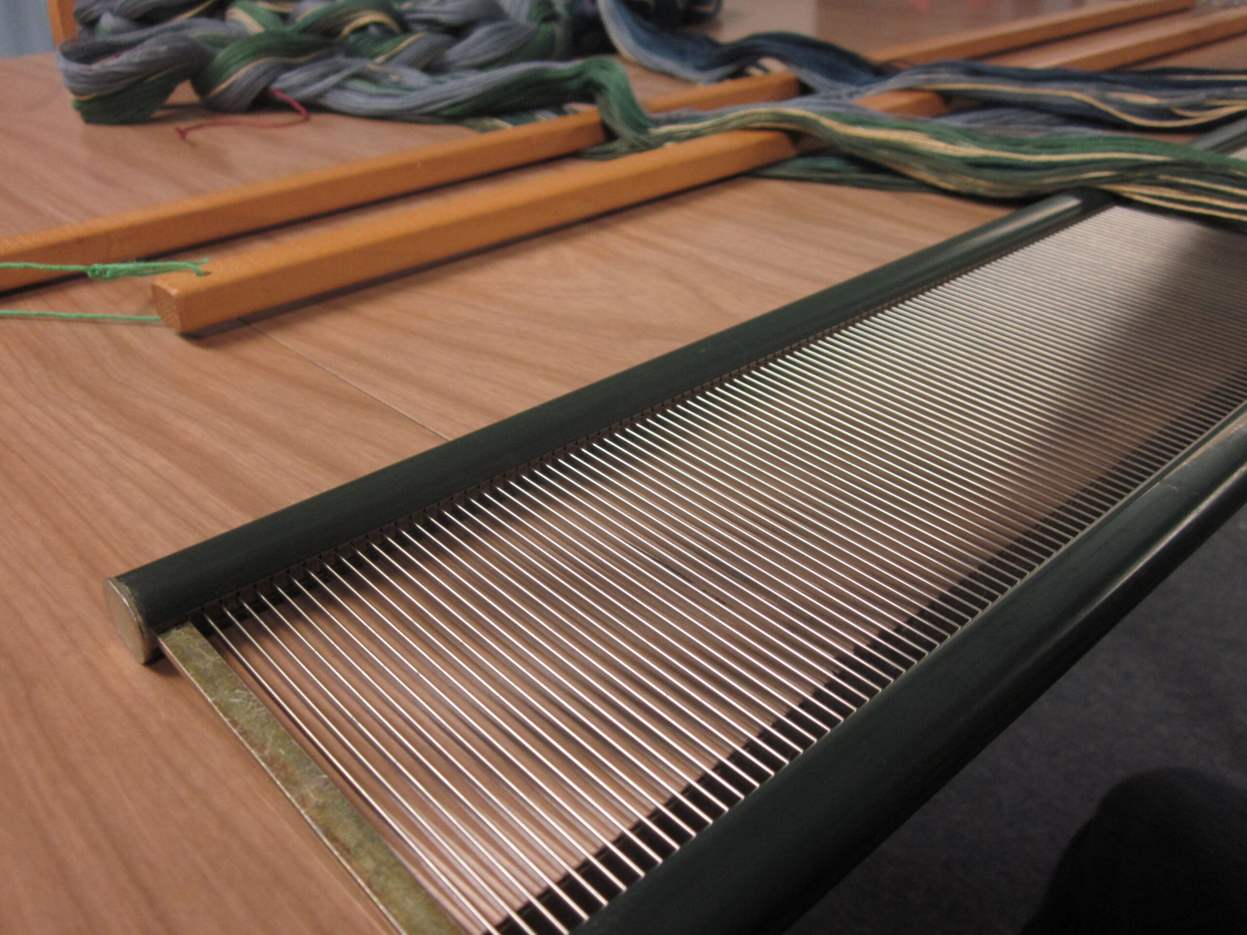 For this project, I’m using an 8 dent reed. A reed is a rectangular frame with evenly spaced slots. The idea is that the reed will keep the yarns at a consistent spacing for the project. Very important!