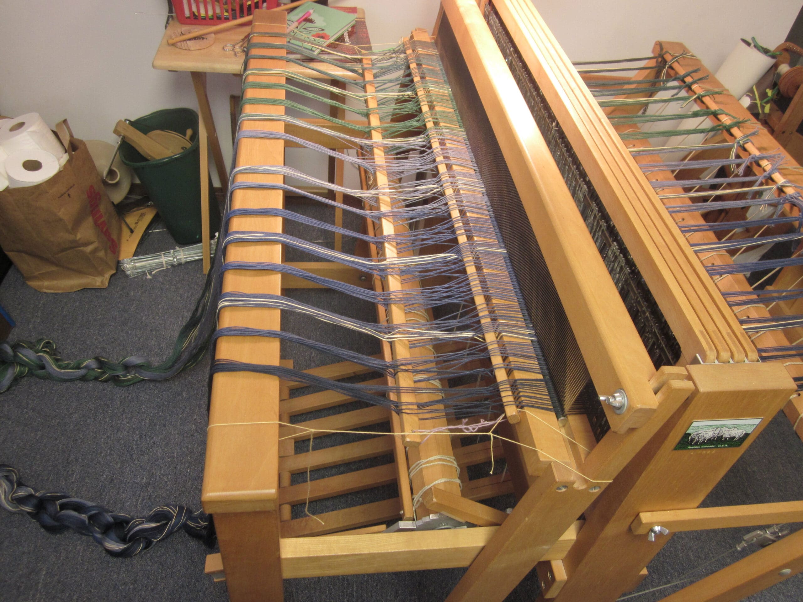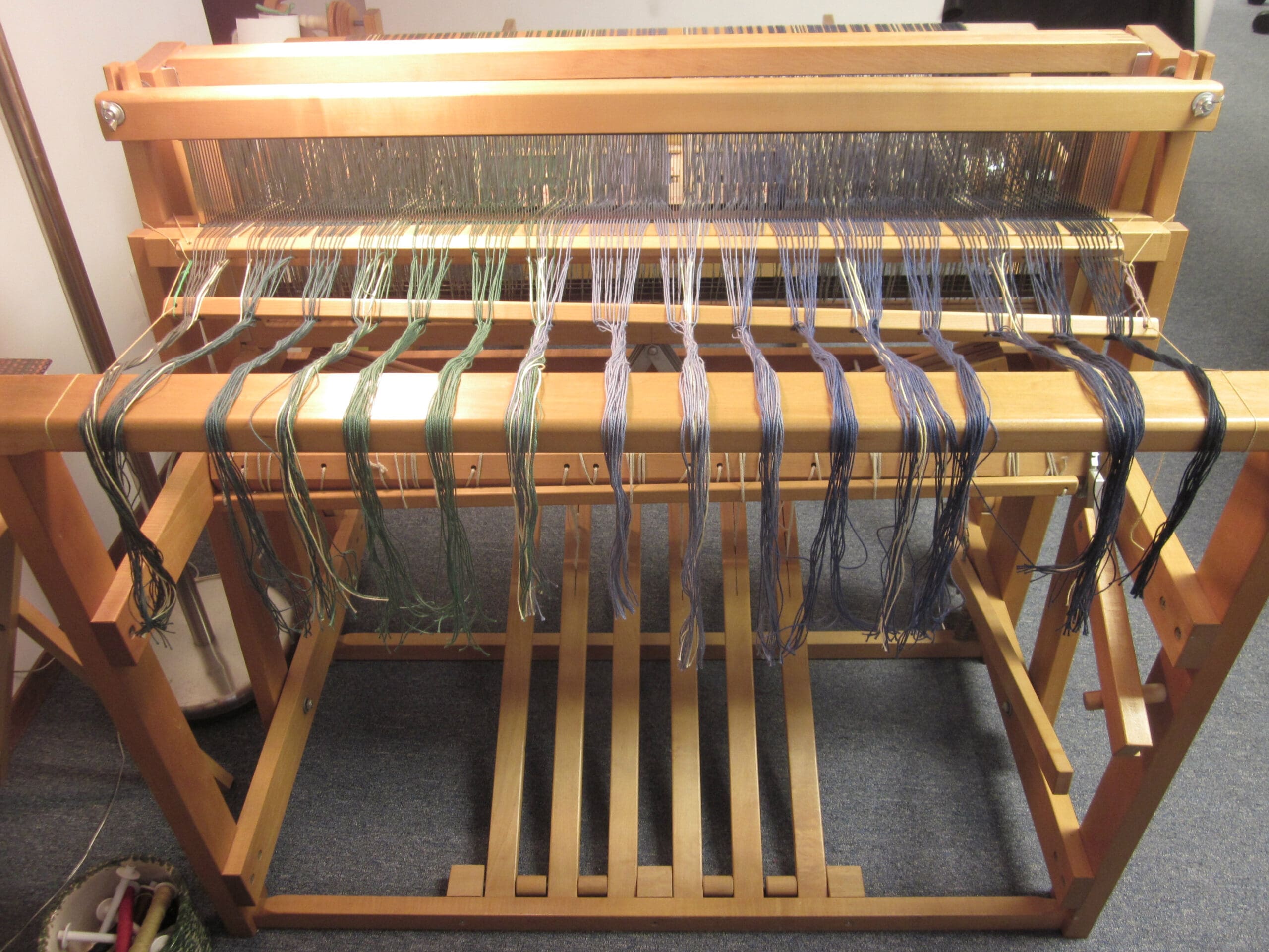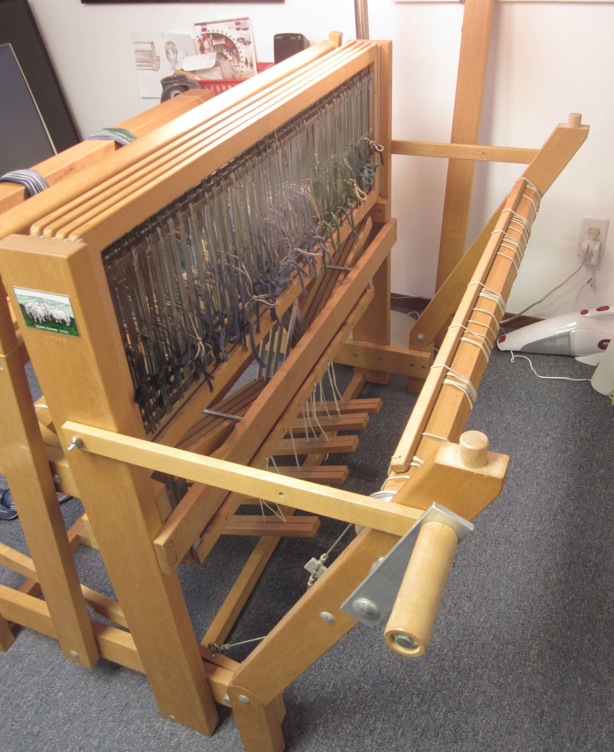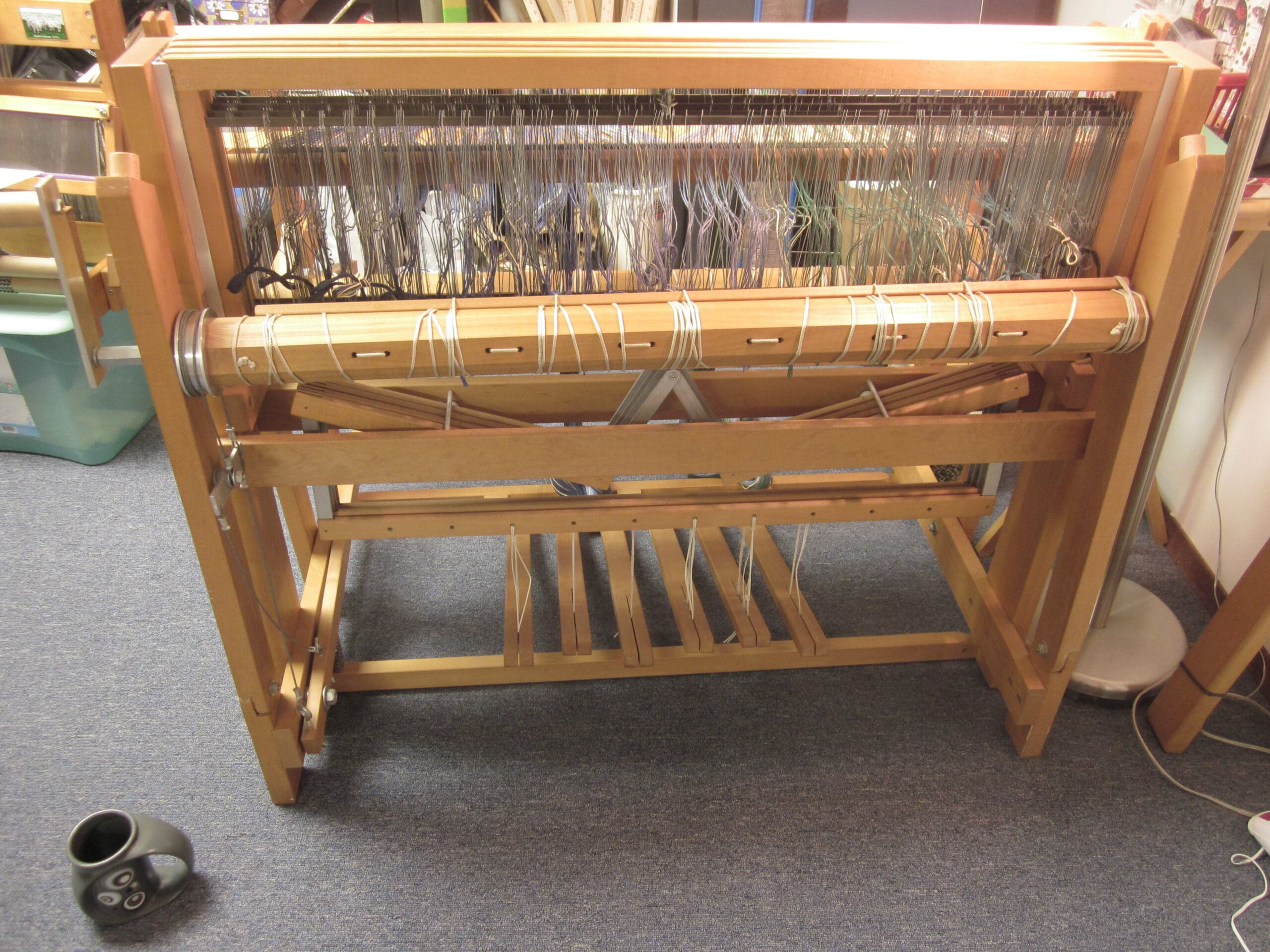 I’ve found that it is more comfortable to thread the heddles with the rear of the loom collapsed and the back beam removed. Once the heddles are all set, the loom can be stretched out and the beam placed back on!