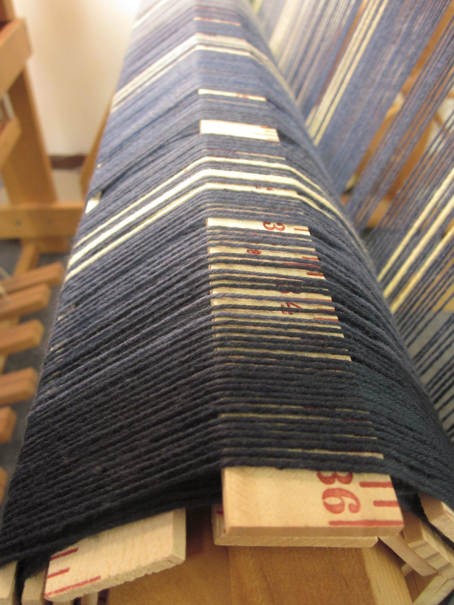 So, the ultimate goal of the “winding on” process is to end up with all the yarns evenly rolled onto the back, avoiding twists, tangles and breaks! Keeping the lease sticks in the project helps with that. But, the key steps are to give each group of yarn a tug at the front, before moving to the back and slowing winding them on, using something to keep everything the same height. I like using yard sticks, since I have a 36″ wide loom. (The math just makes me happy!)