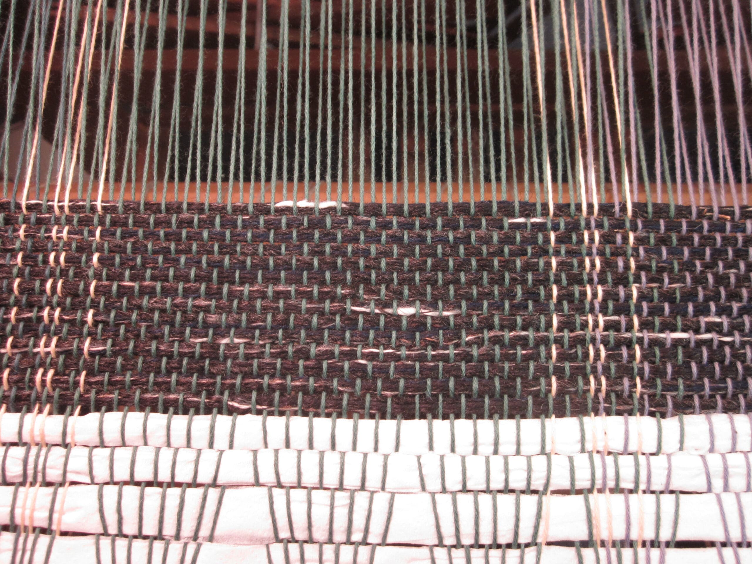 I like to use a rag shuttle for this type of project. It allows me to wind on a number of different yarns together without worrying about them becoming uneven. If you use a smaller-radiused shuttle, the thinner yarns wind on tighter than the thicker ones. (I think I just made up the word, “radiused”. Where’s Webster’s when you need him?)