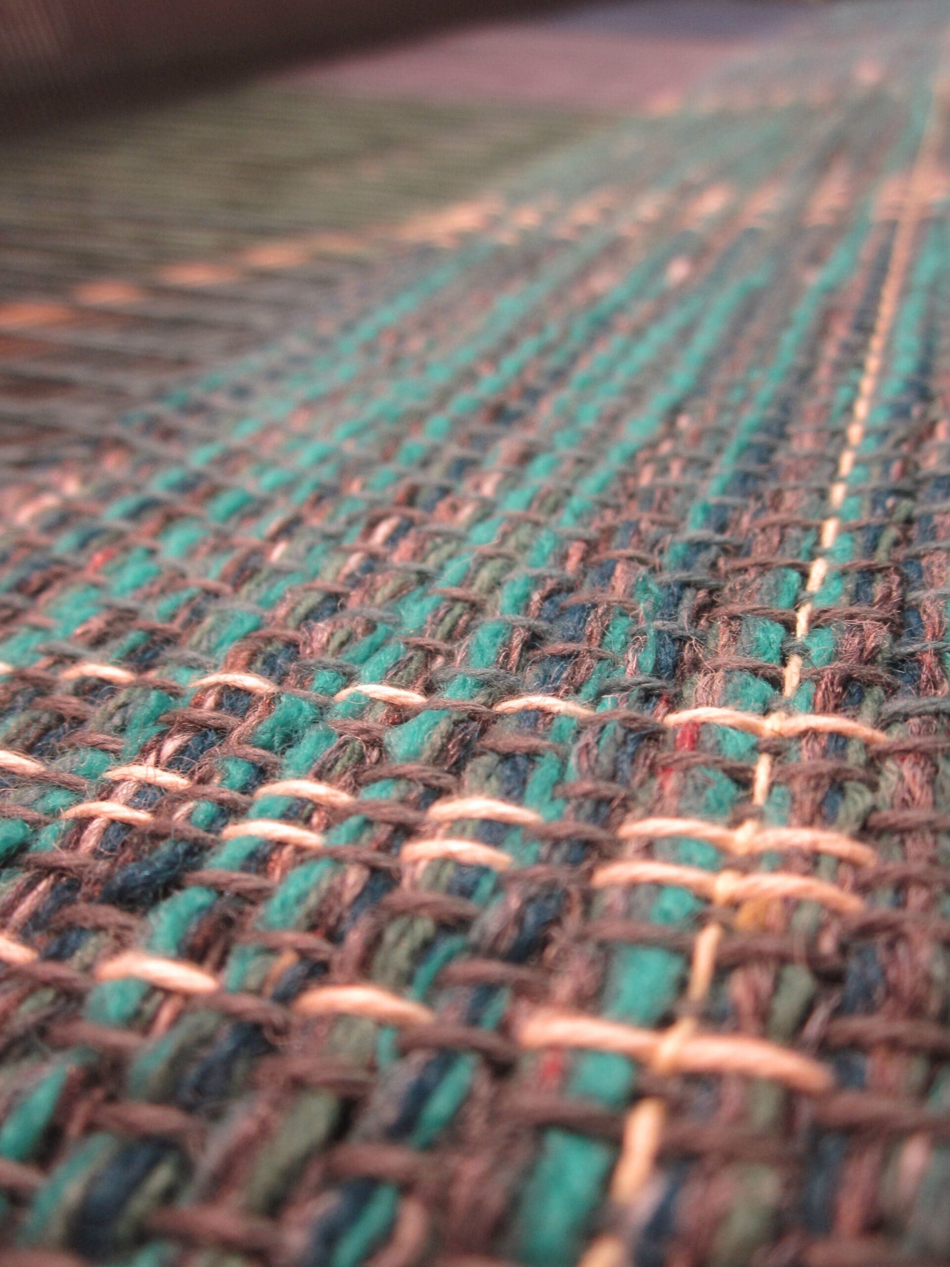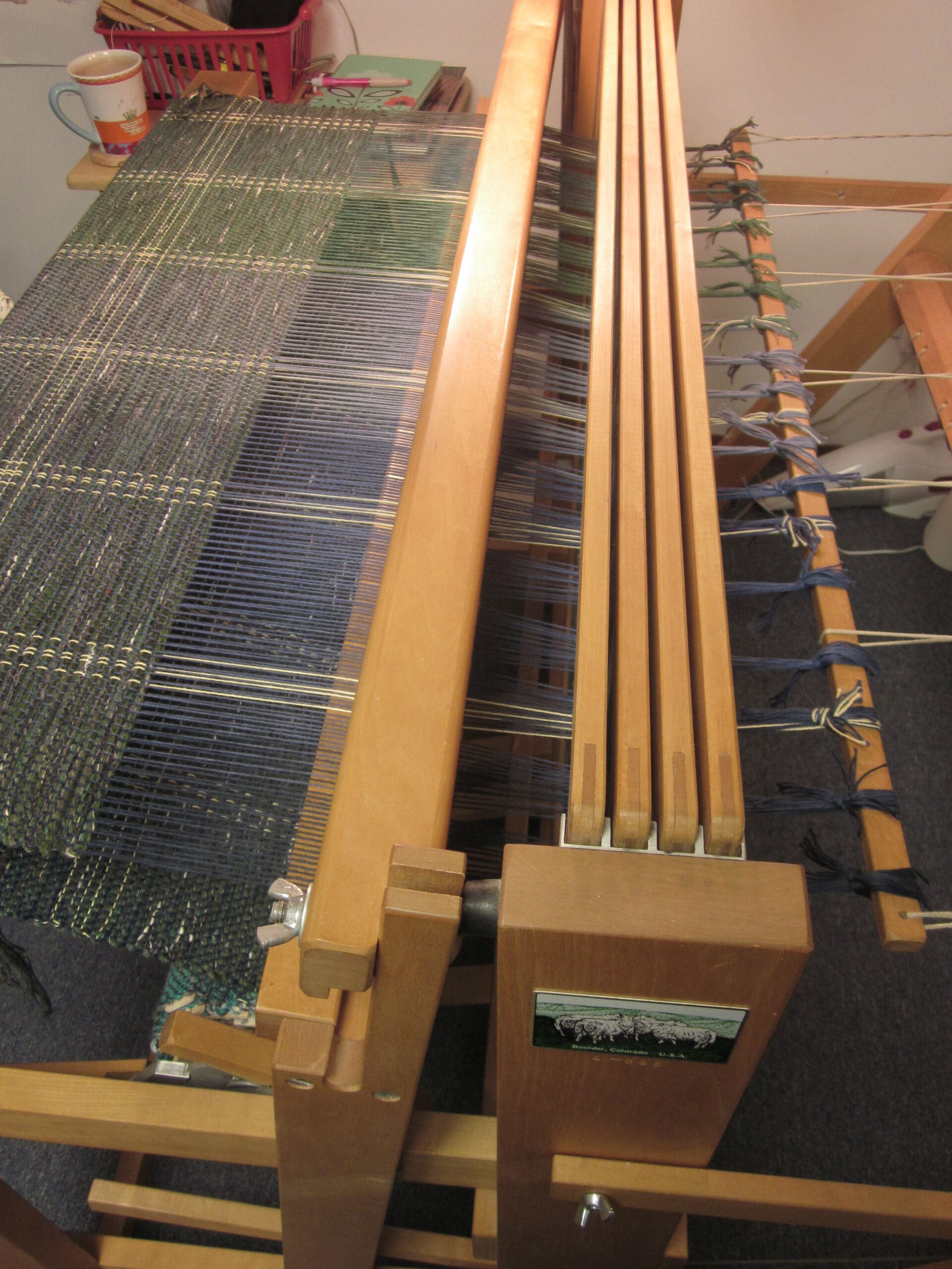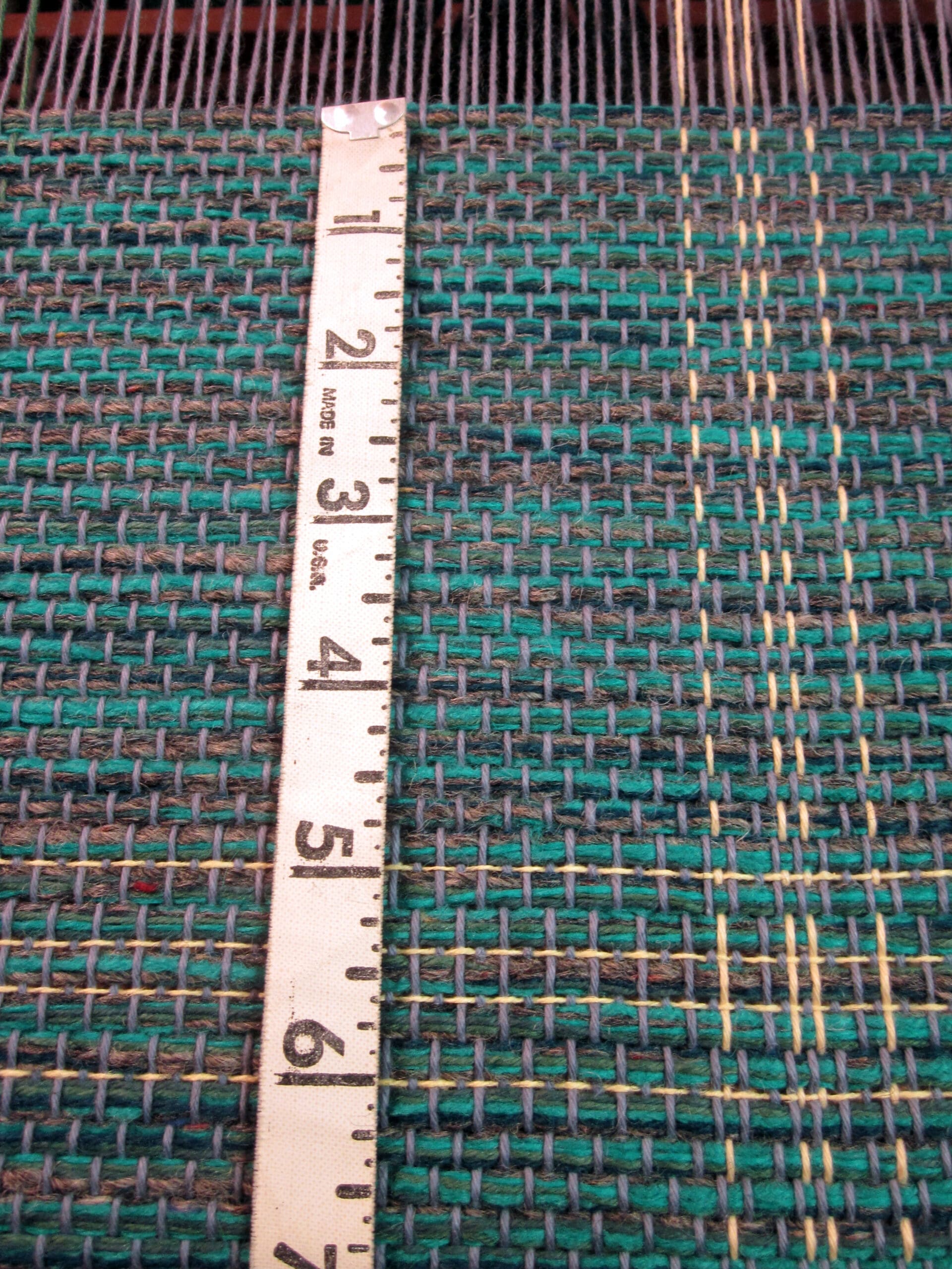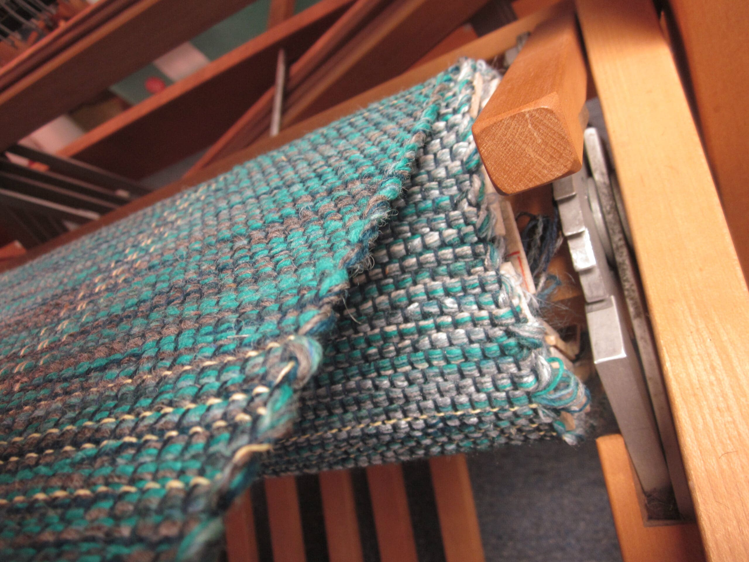 My lovely accent yarns come into play every so many inches. This part of the process just makes sure I’m not dozing off at the loom! It’s good to have some checks & balances while you’re weaving! Otherwise odd things can happen – like randomly changing the pattern, tossing the shuttle into the Blueray speaker, and slipping off the weaving bench in an effort to pick up aforementioned shuttle. Just, hypothetically speaking…
