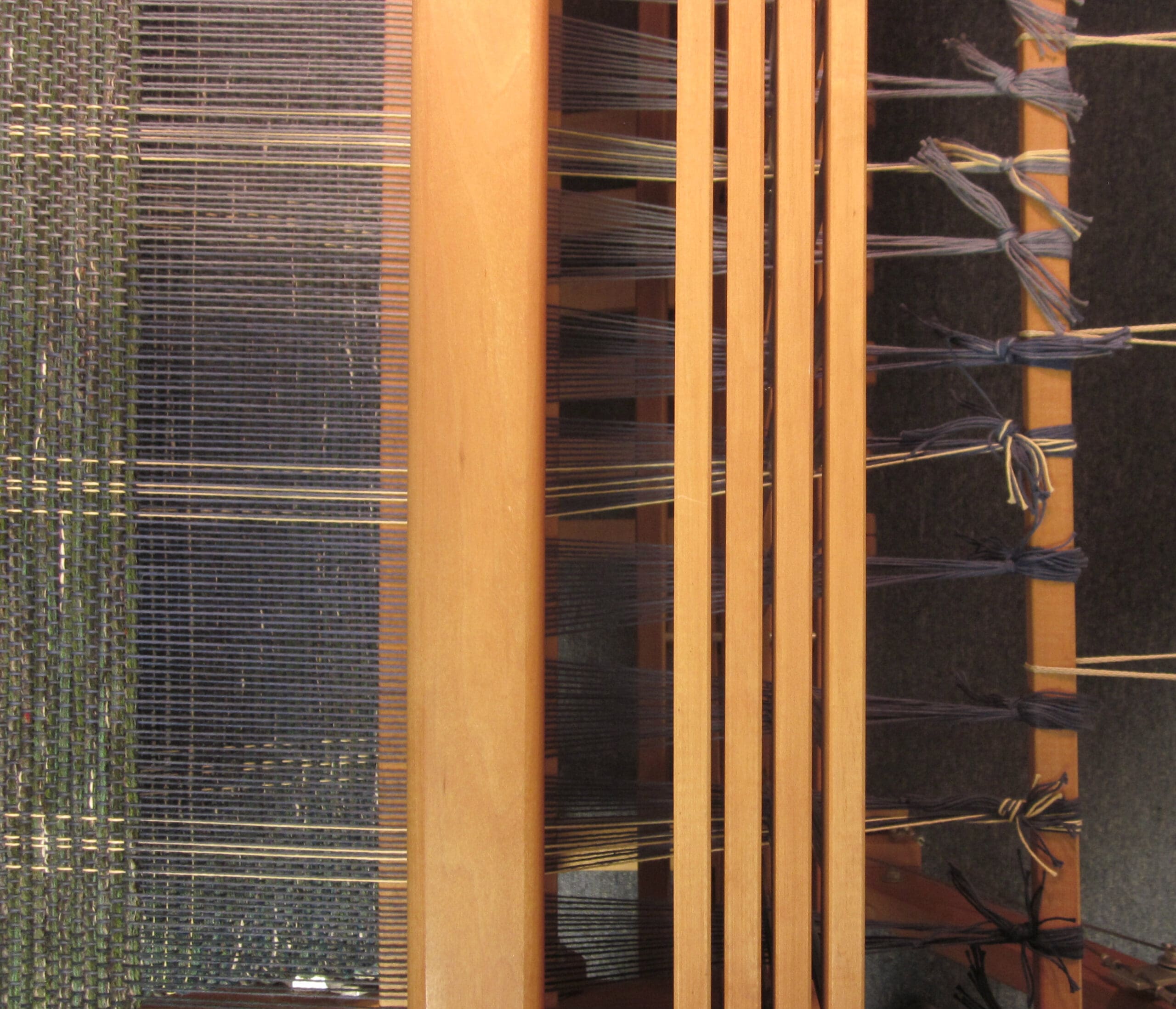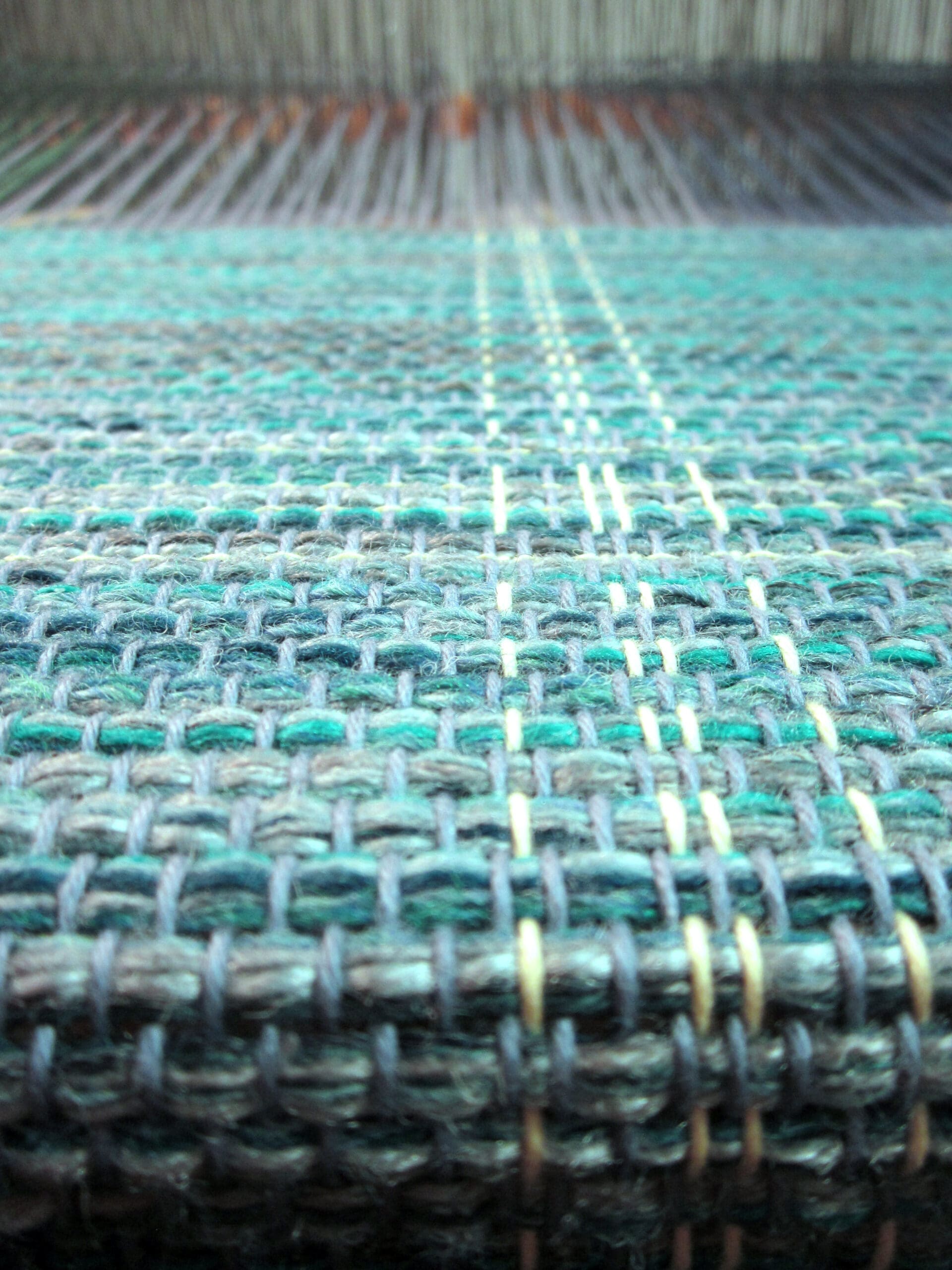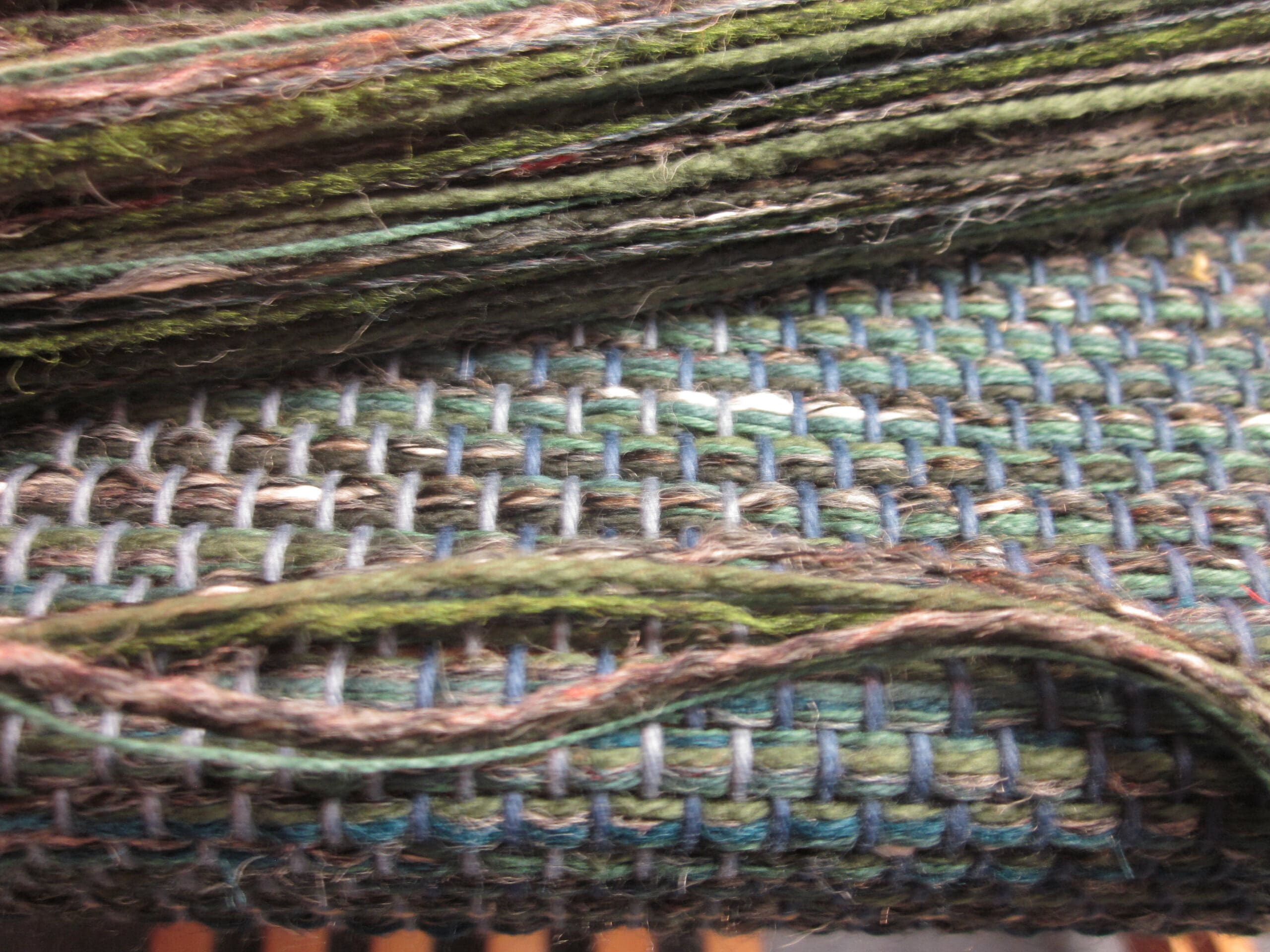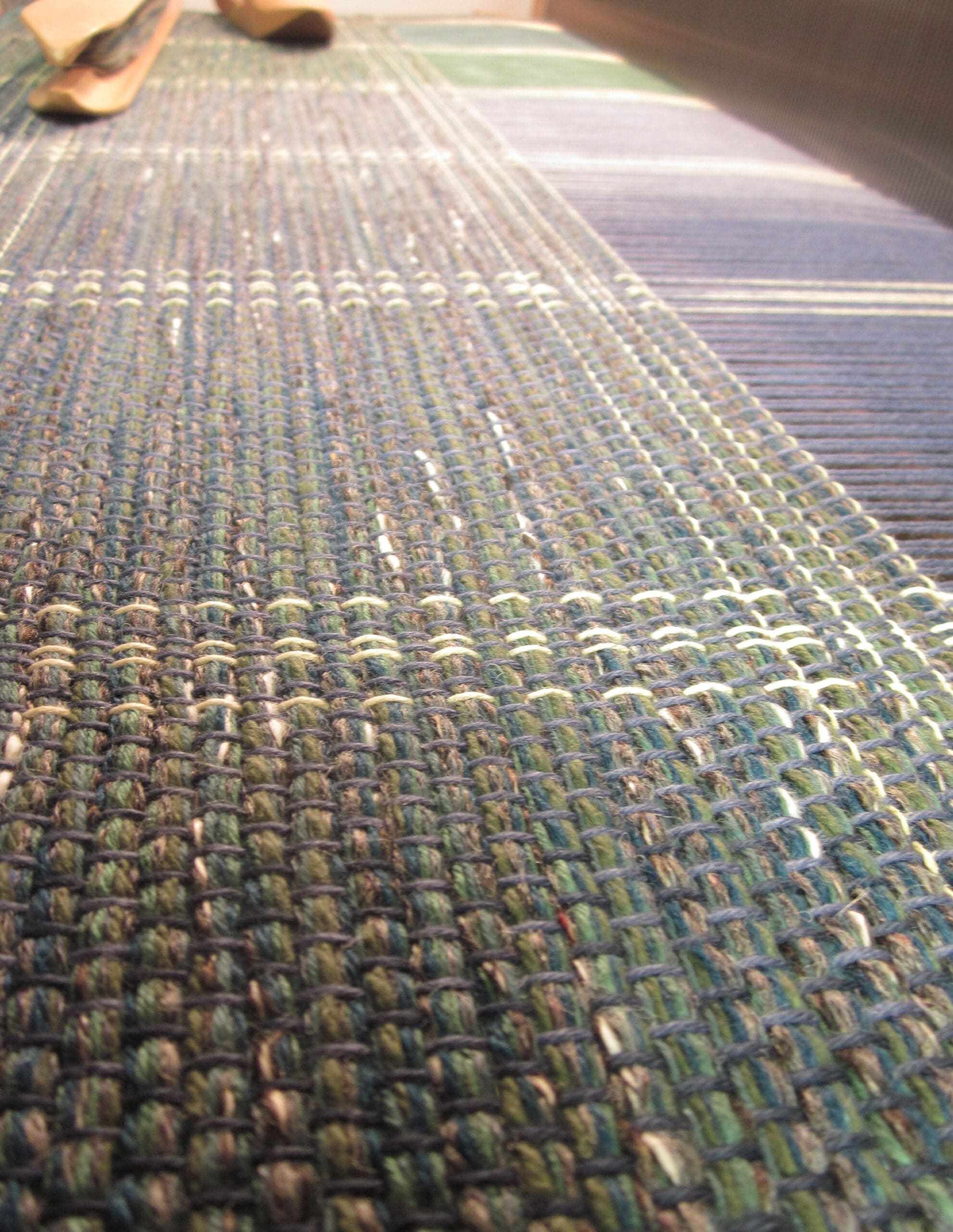 My lovely accent yarns come into play every so many inches. This part of the process just makes sure I’m not dozing off at the loom! It’s good to have some checks & balances while you’re weaving! Otherwise odd things can happen – like randomly changing the pattern, tossing the shuttle into the Blueray speaker, and slipping off the weaving bench in an effort to pick up aforementioned shuttle. Just, hypothetically speaking…