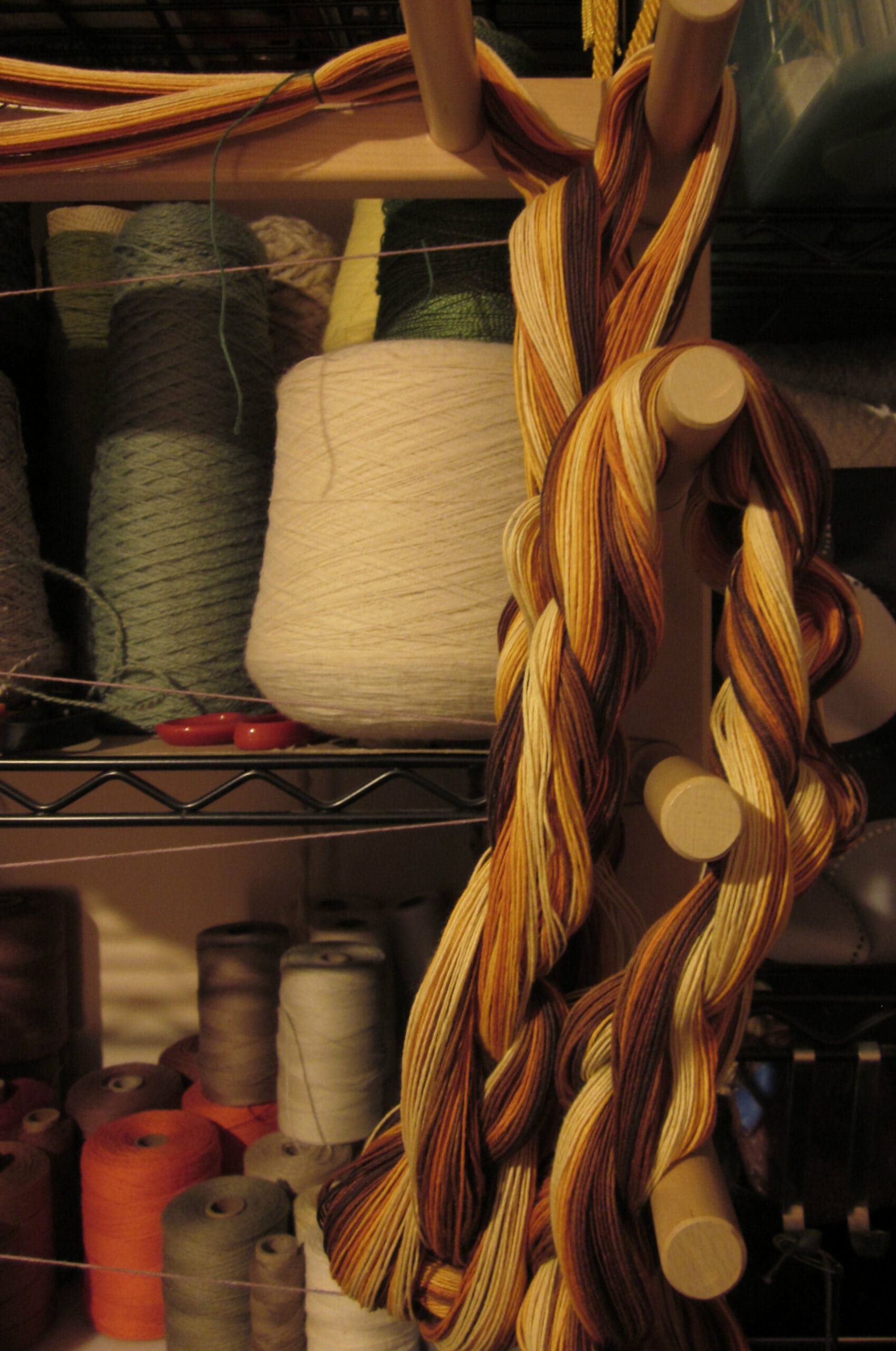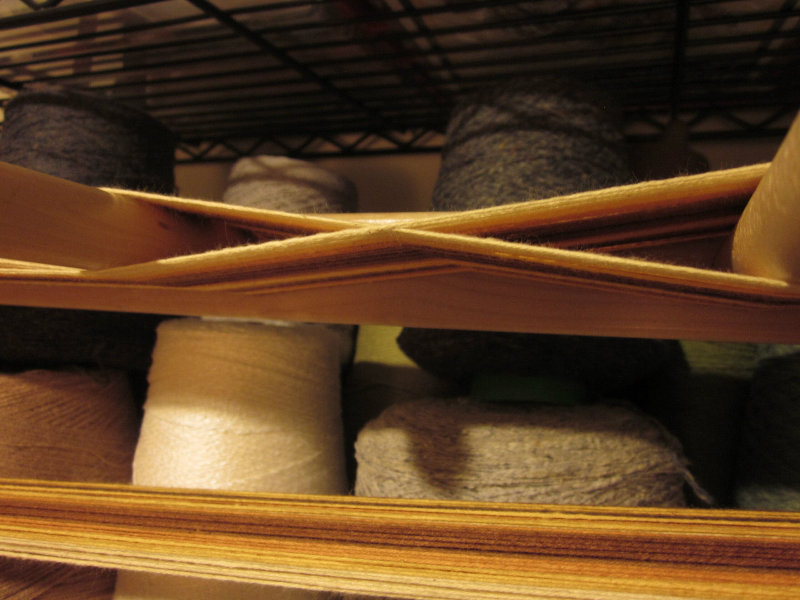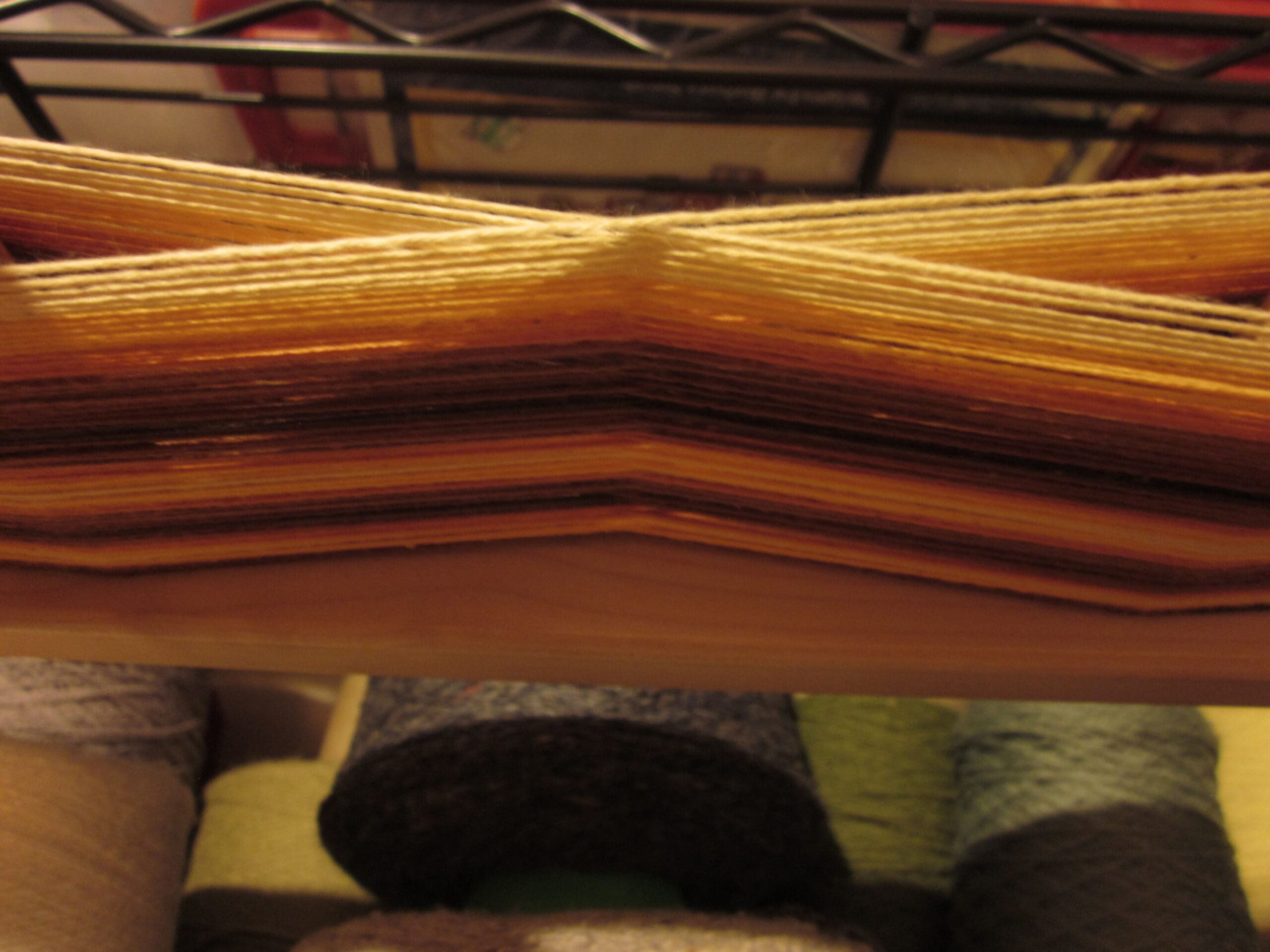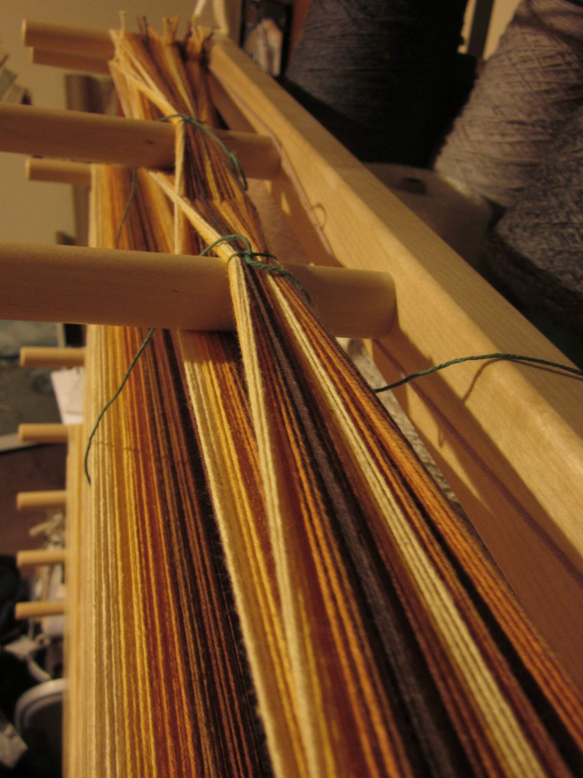The cross is just what it sounds like – a space between 2 pegs where the yarns cross each other in order. To create it, the yarn goes over and under the adjoining pegs in different directions, which is determined by if you are going moving down or up the warping board. It’s tricky to describe and unless you are a weaver getting ready to start a project, it’s not terribly relevant. What you should appreciate is the fact that this brilliant little technique helps set the tone for the rest of the project! Three cheers for the cross!!!