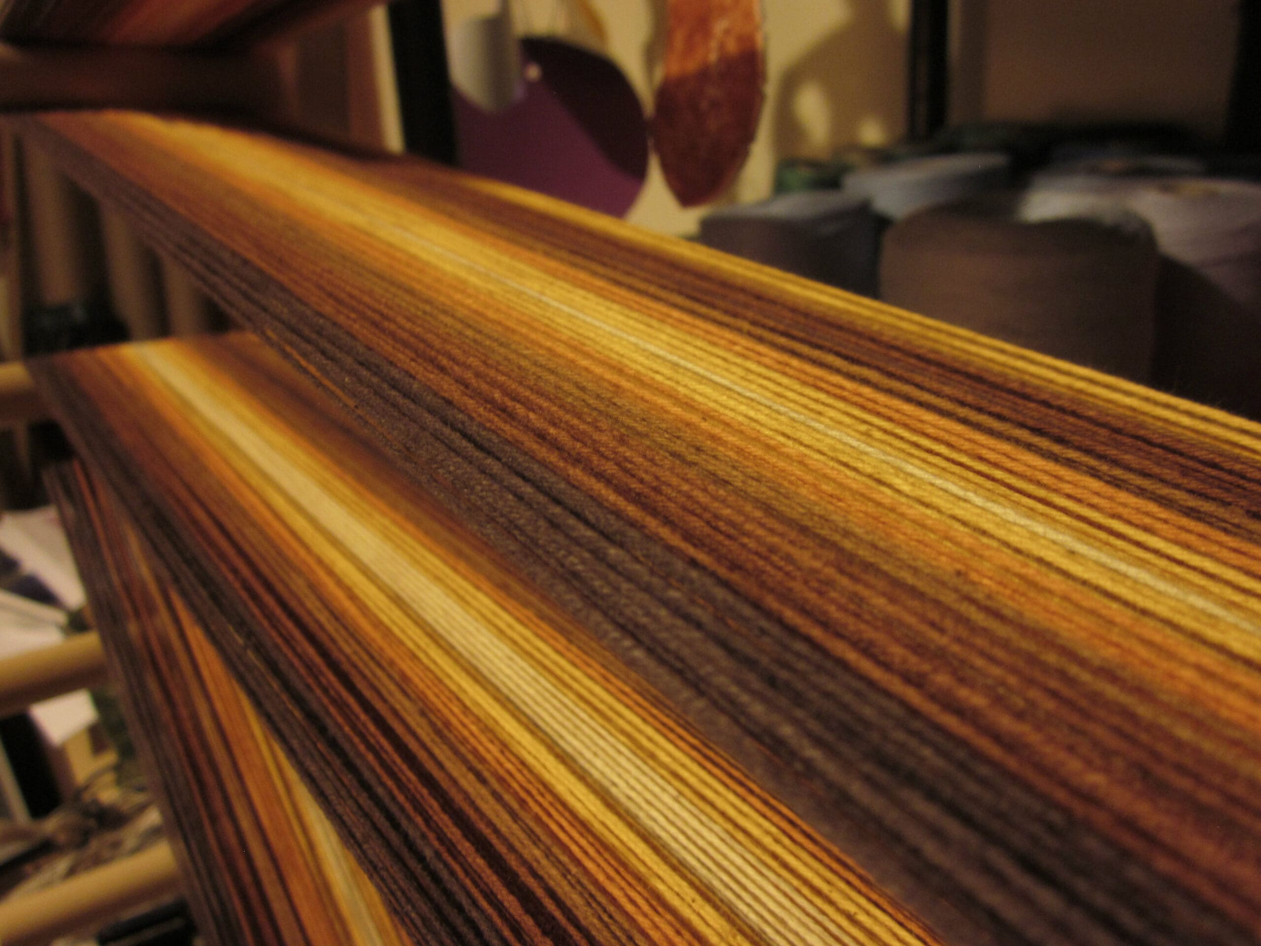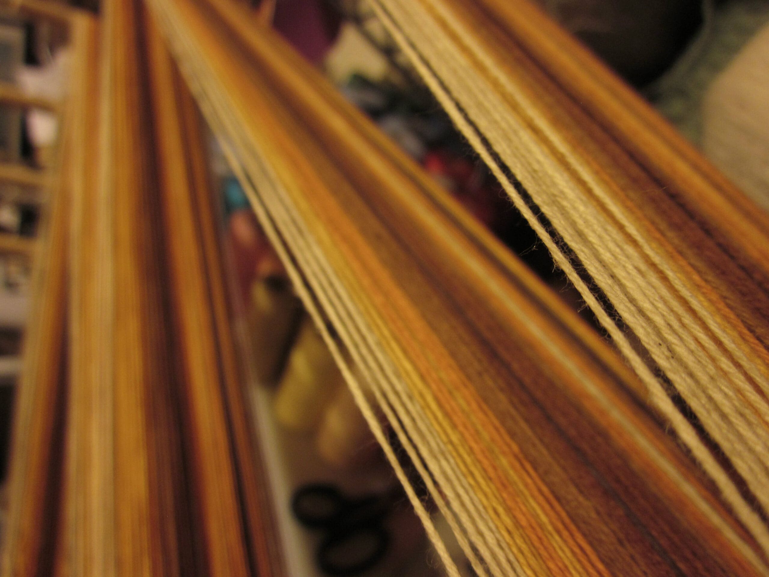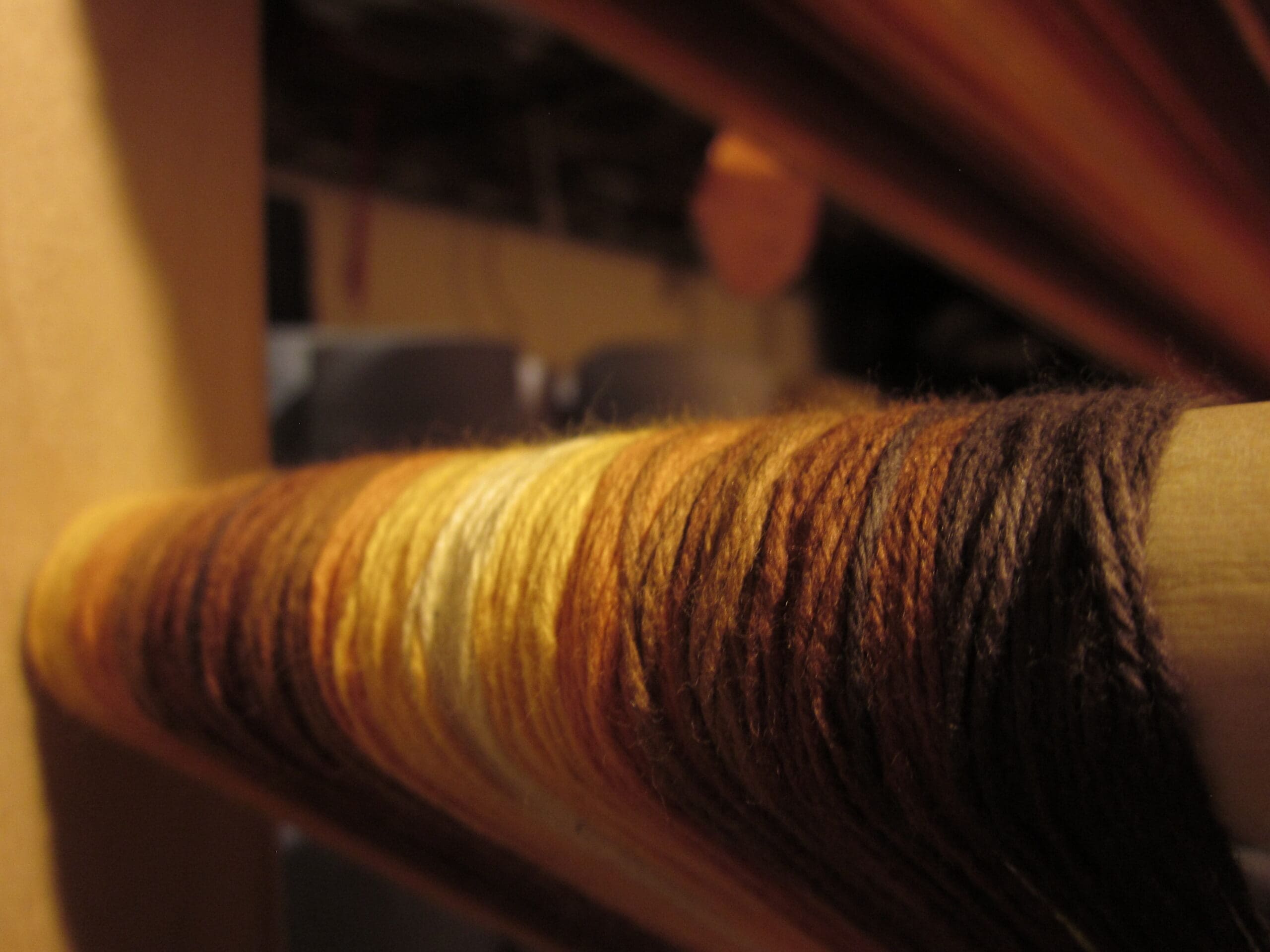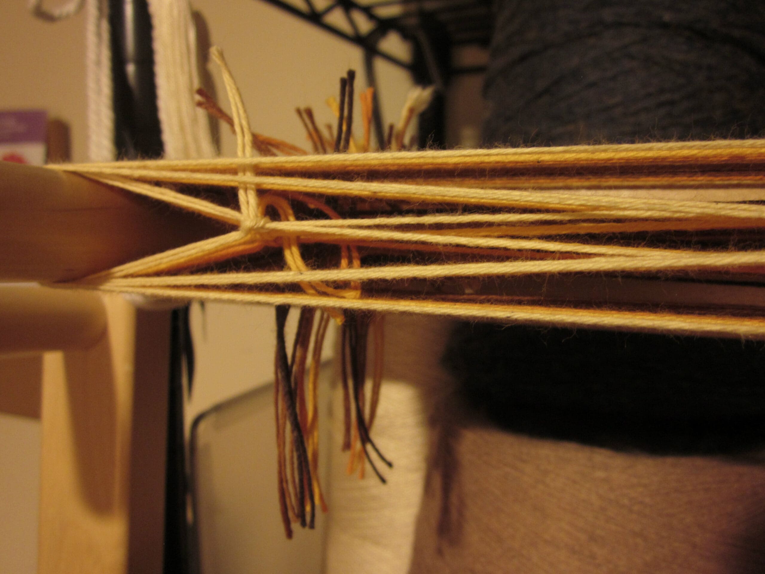 The cross is just what it sounds like – a space between 2 pegs where the yarns cross each other in order. To create it, the yarn goes over and under the adjoining pegs in different directions, which is determined by if you are going moving down or up the warping board. It’s tricky to describe and unless you are a weaver getting ready to start a project, it’s not terribly relevant. What you should appreciate is the fact that this brilliant little technique helps set the tone for the rest of the project! Three cheers for the cross!!!