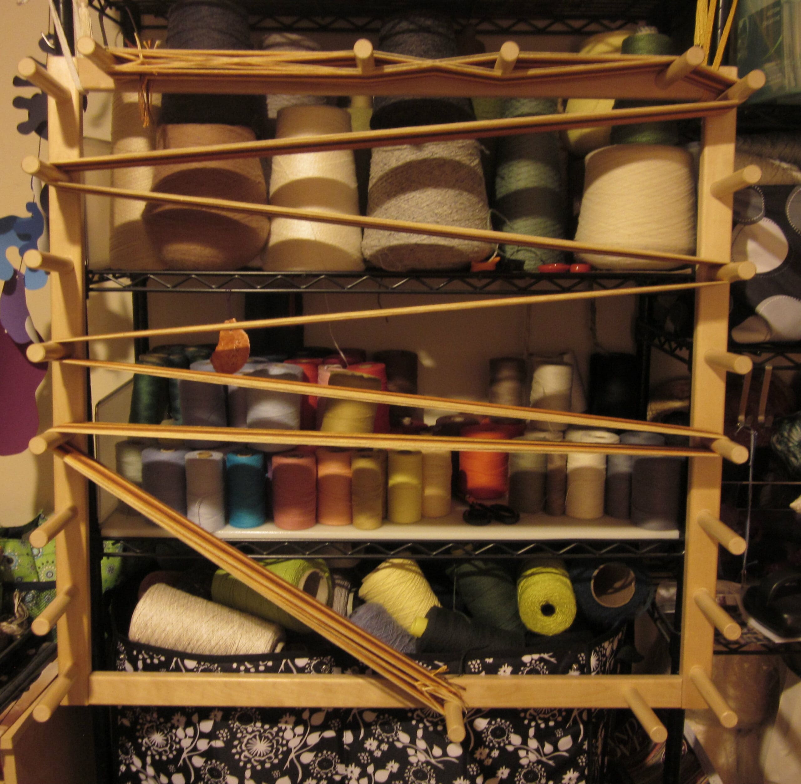 I’m fortunate to be able to leave my warping board up all the time. I have a set of shelves that I hang it from. Thankfully, I was able to adjust the height so I can reach everything. Sadly, I missed the average-to-tall gene and only top out at 5’3″. And using a warping board this big, it needs to be pretty low in order for me to be comfortable working on it. It might take up to 2 hours to warp this type of project. So, being comfortable is key!