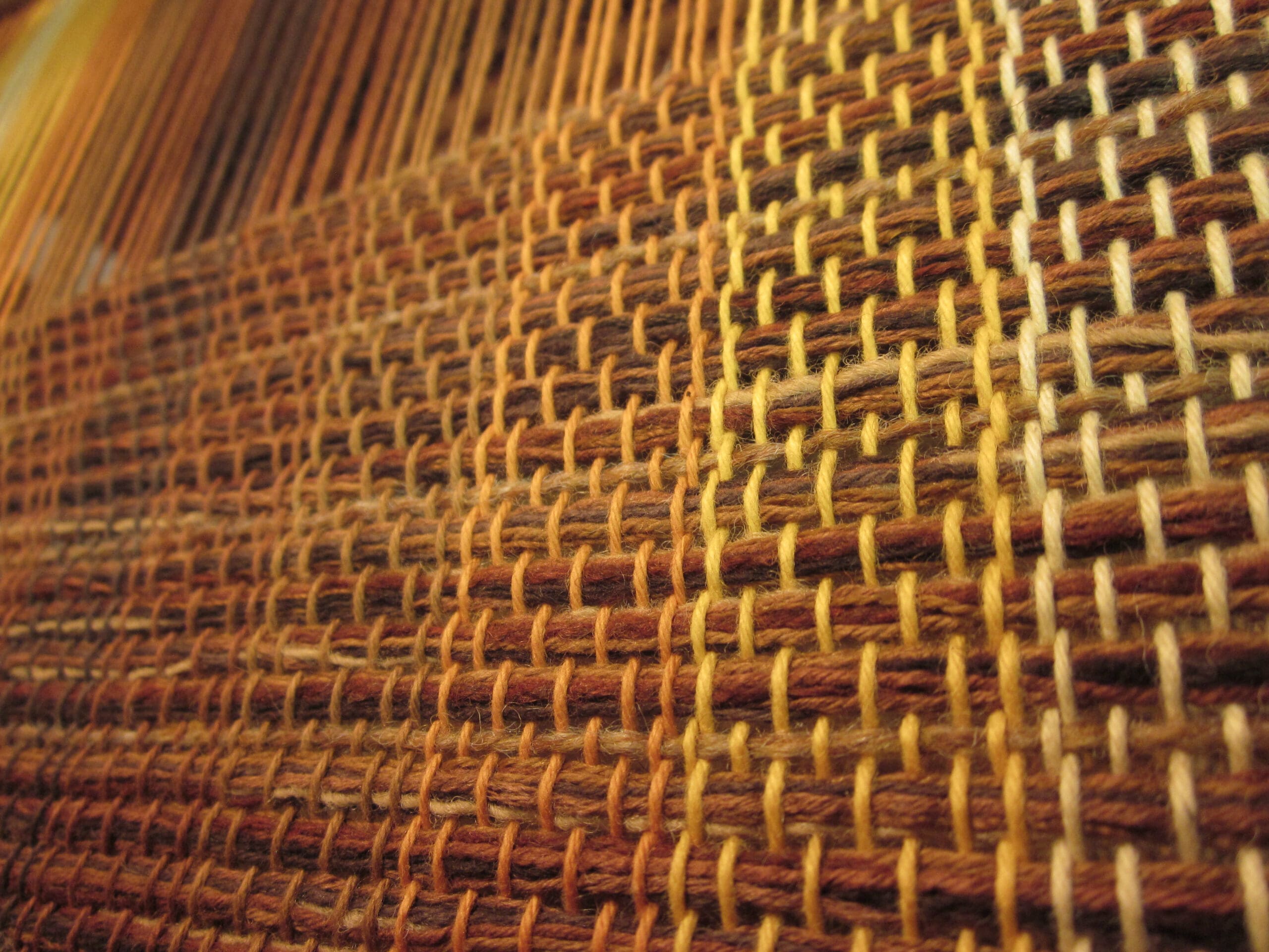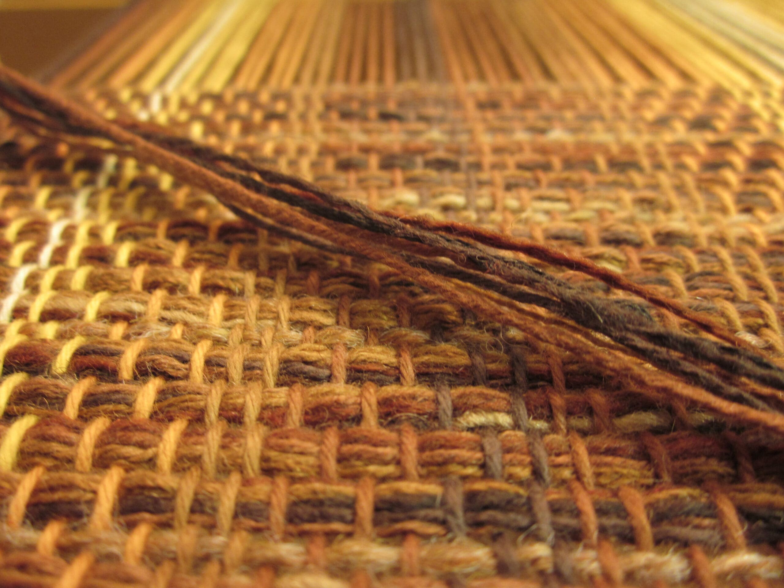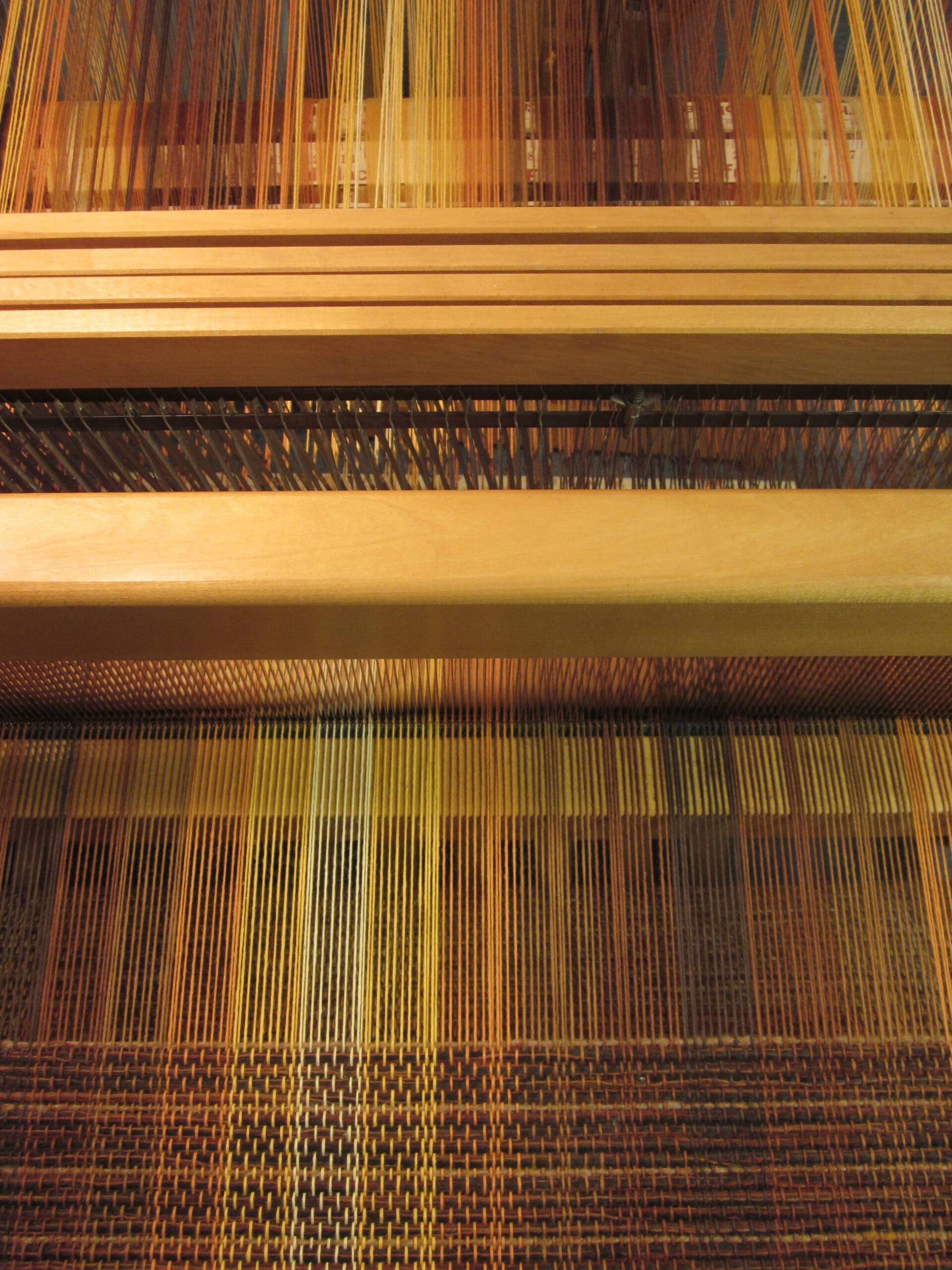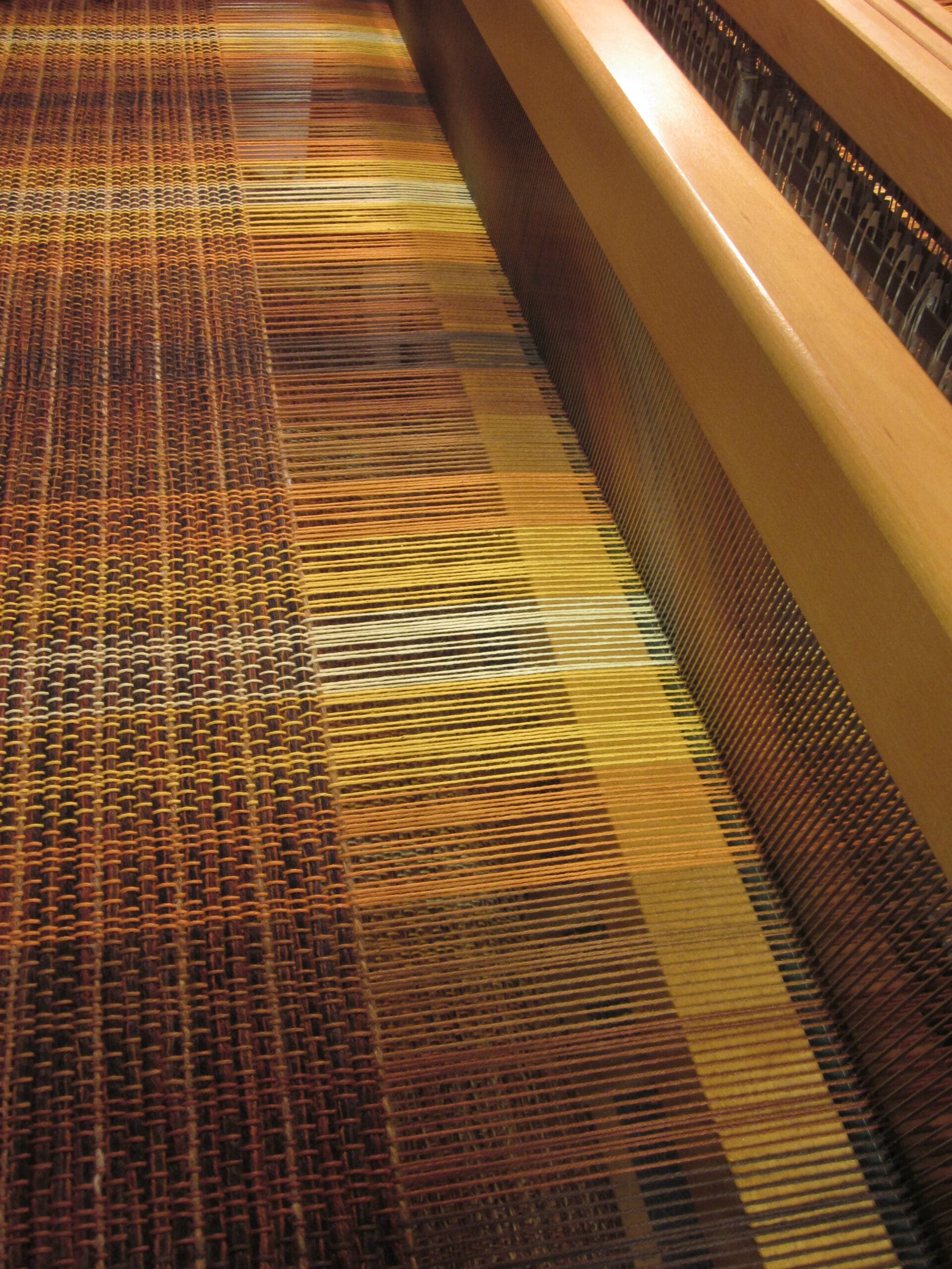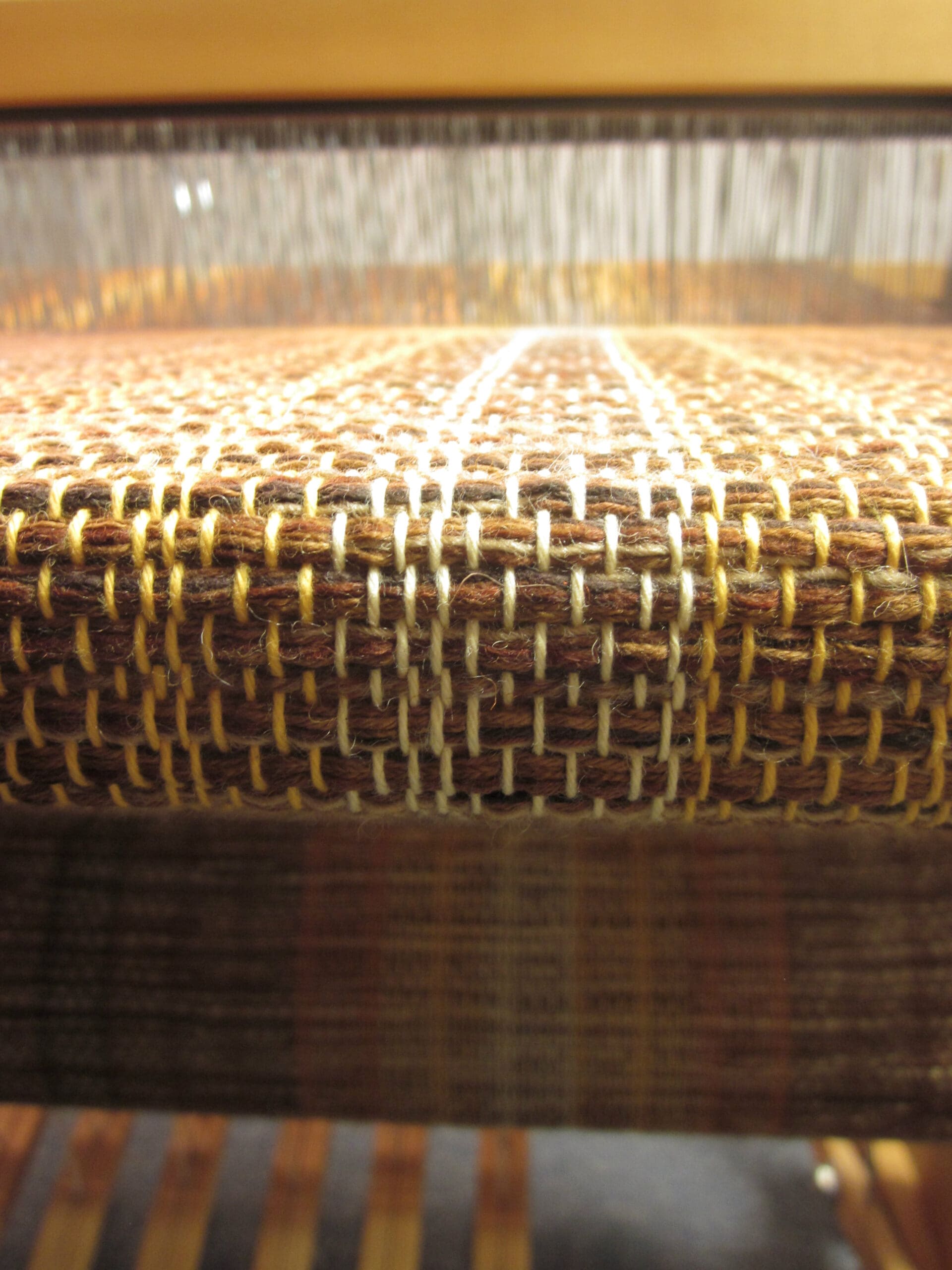 I began weaving the fabric in very light colors and am slowly incorporating darker shades. At this point, we are into the tans & browns, heading into the chocolates (milk & dark… and suddenly I have a hankerin’ for dessert…)