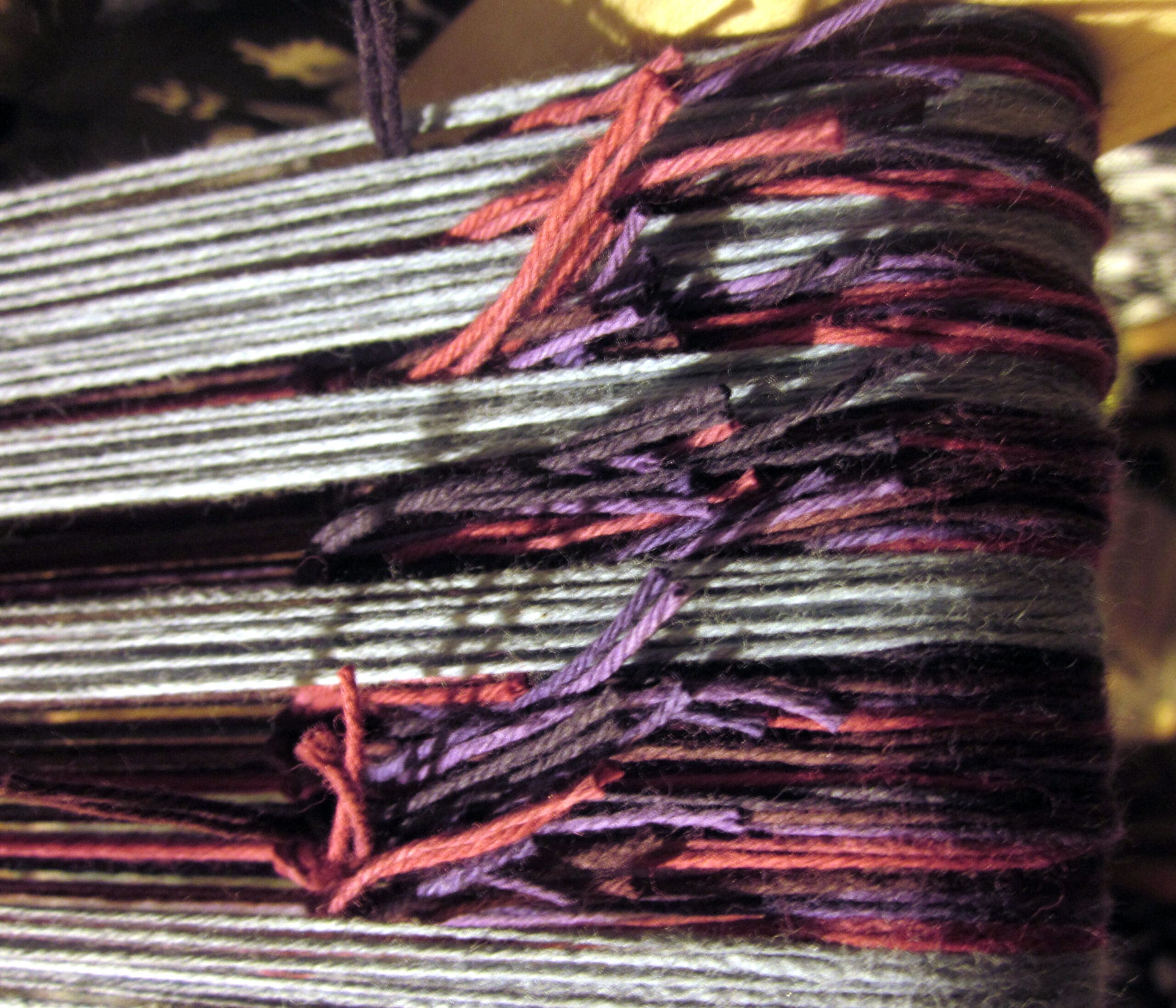 When taking the yarn off the warping board, I start at the bottom and do a little twisty thing until I get to the top. My weaving teacher tried to explain how the twisting motion was similar to a crochet stitch. But, since I’m not a crochet-er, I’m sure I looked at her with glazed-over, non-comprehending eyes. So, she just walked me through it about 50 times until I got it! Teachers are so patient, aren’t they?