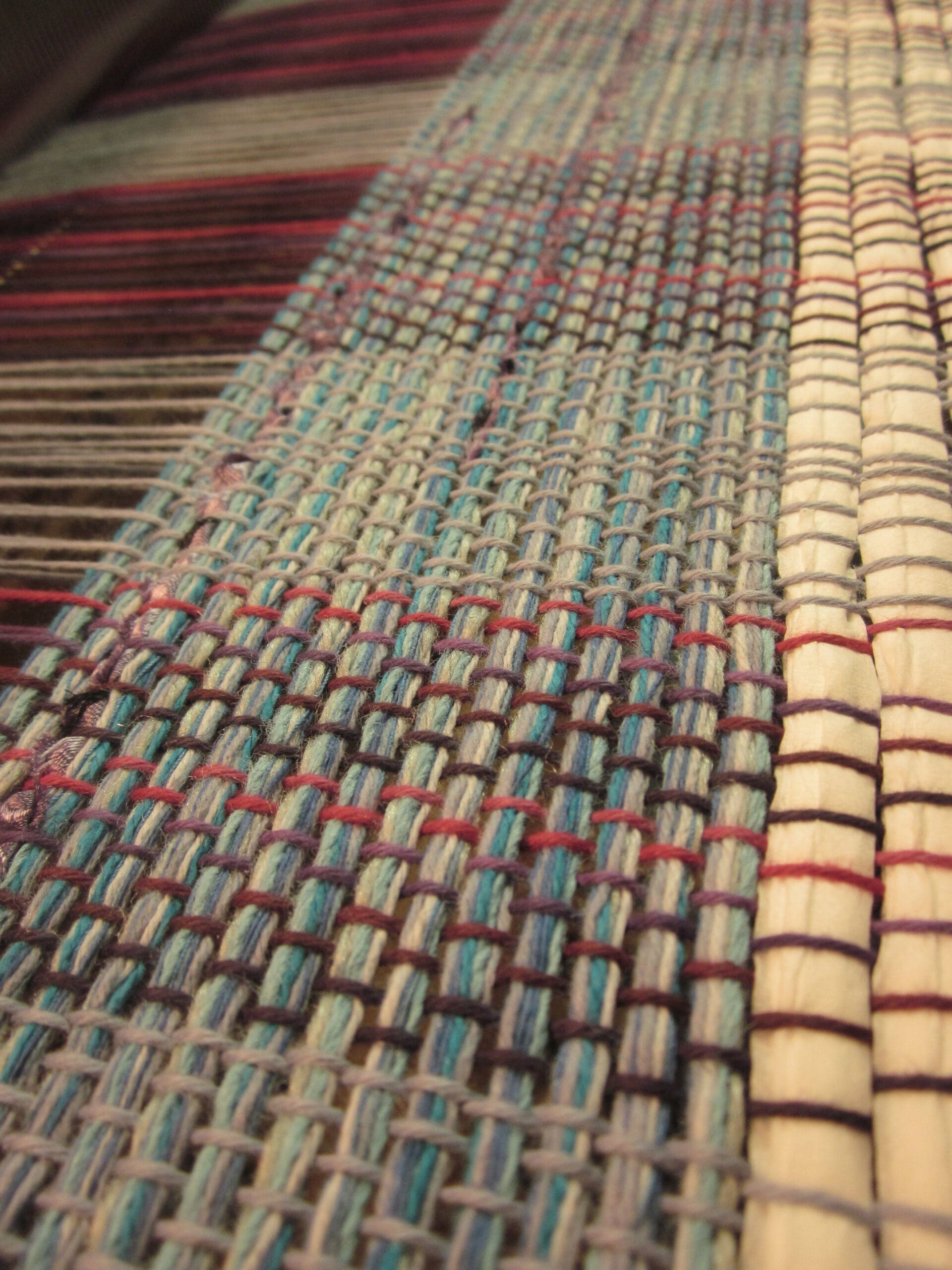 First up, we need some sort of filler to even out the yarns. I like to use toilet paper – preferably, the really cheap stuff! For every (5) weavers you meet, they will have (5) different ways of tackling this part of the process! Using old yarn, strips of fabric, just start weaving without beating it until it evens out, etc. So many options! None of them wrong! (See how zen I sound? Everyone is right in their own way. Well… maybe not you over there with the funny smirk on your face…)