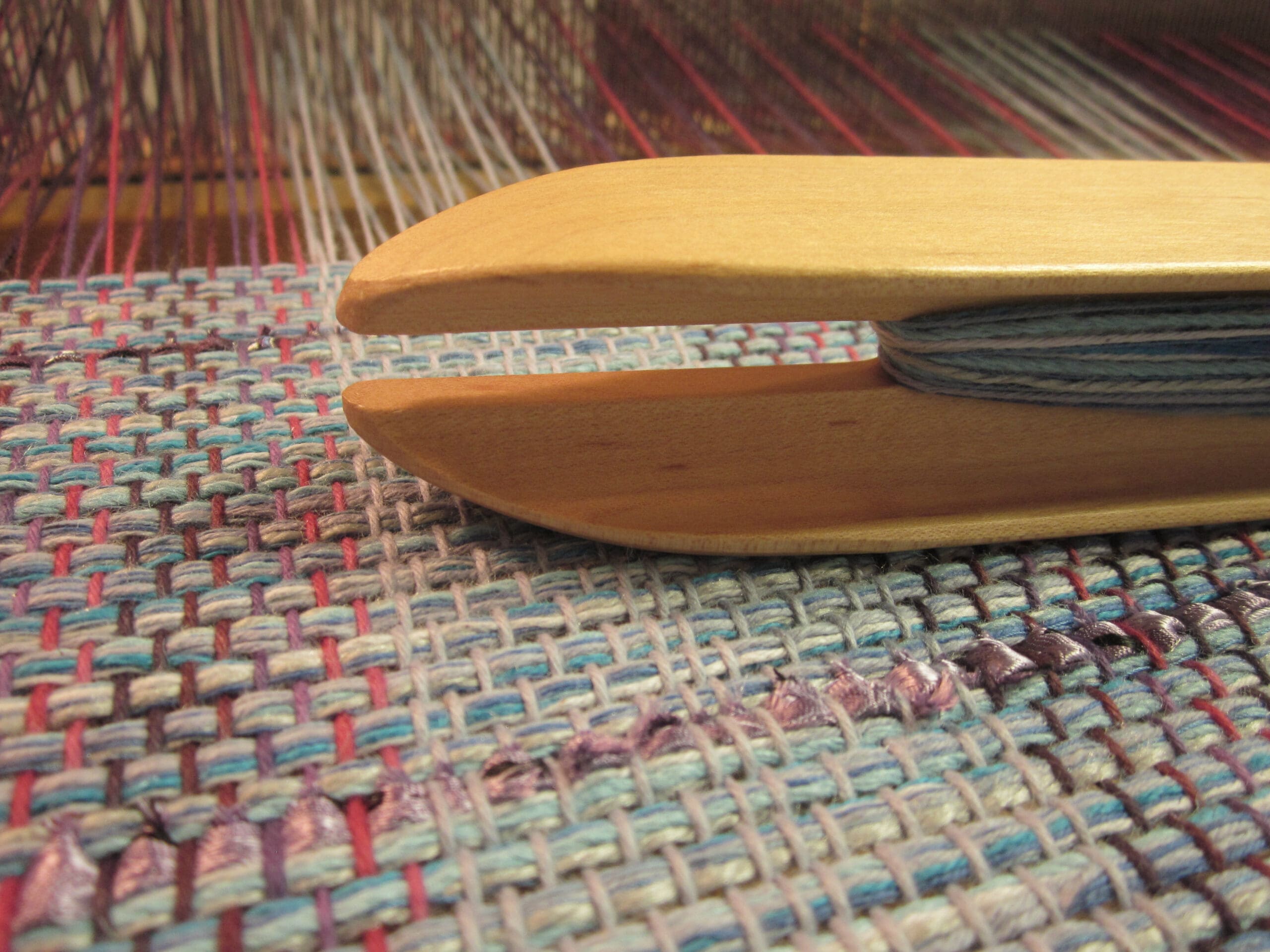 Since I have blues and purples in the warp (yarns in the loom), it makes sense to start things off with a little blue in the weft (yarns in the shuttle)!