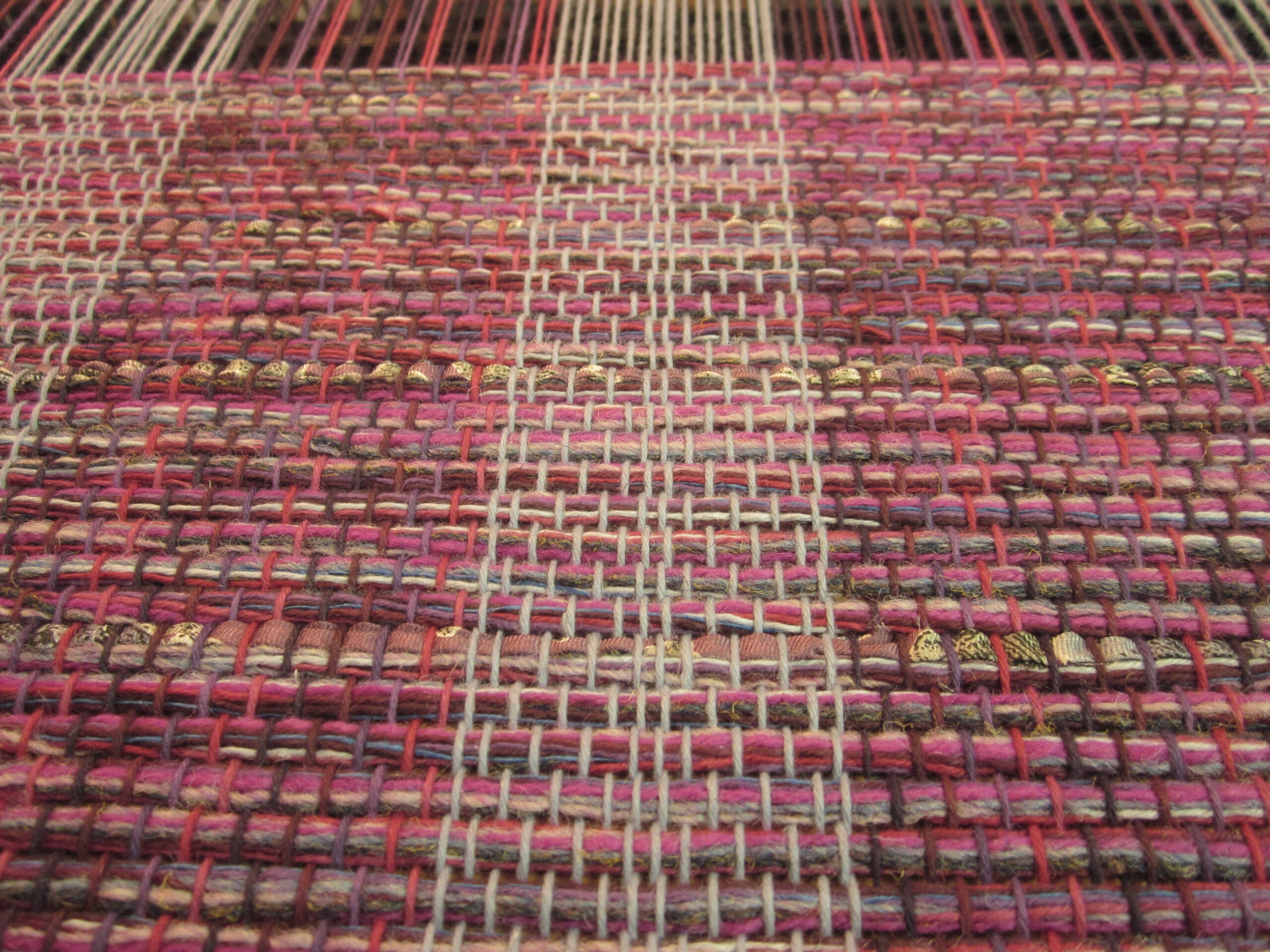 Last we chatted, I was weaving in yarns and pieces of recycled neckties to create a lovely bolt of fabric that will be turned into handbags! And guess what? This week, more of the same – just pinkier! (This is immensely funny because of all the colors in the whole, wide world, pink is my least favorite! Turns out, I can stomach the dark pink colors better. But still, the coincidence is not lost on me!)