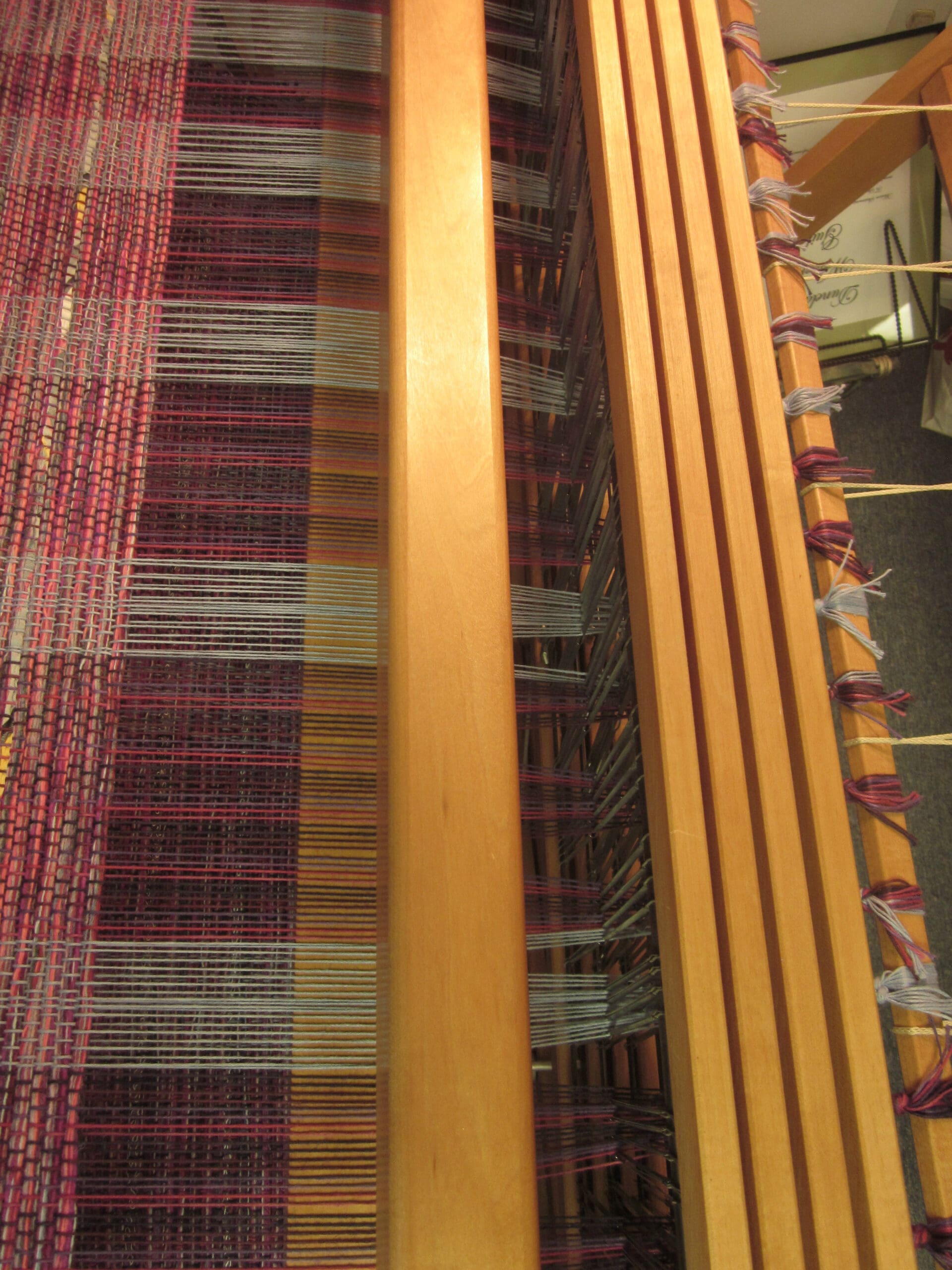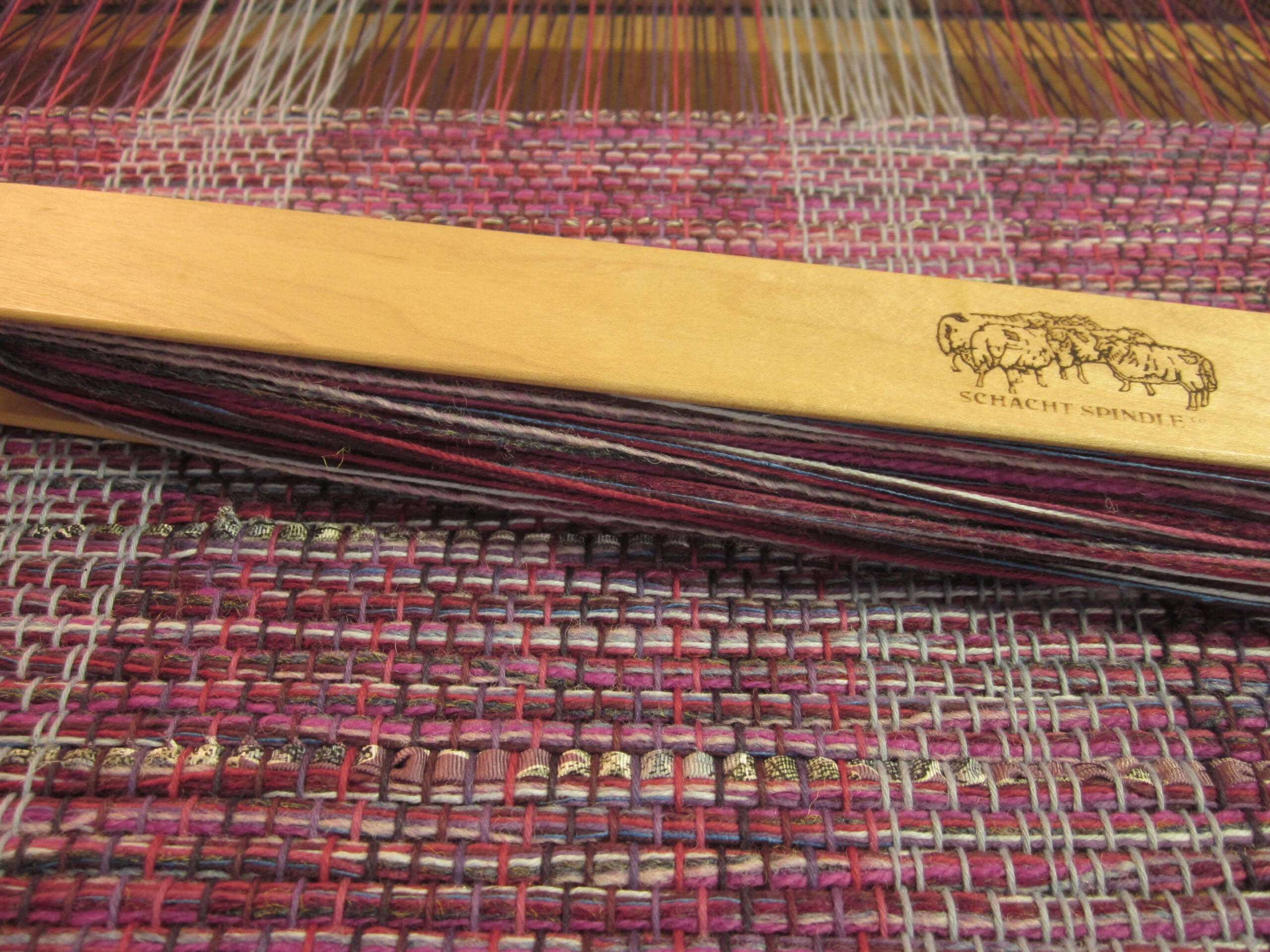 If you remember from the beginning of the project, I wound in a number of yardsticks to keep the yarns even. Now, all the yardsticks have fallen out of the back and they’ve been moved to the front, keeping the fabric consistent. What would the world do without yardsticks? Honestly, most folks wouldn’t miss them. But, I’d like to think weavers everywhere would! (Or, it could just be me. I’m OK with that!)