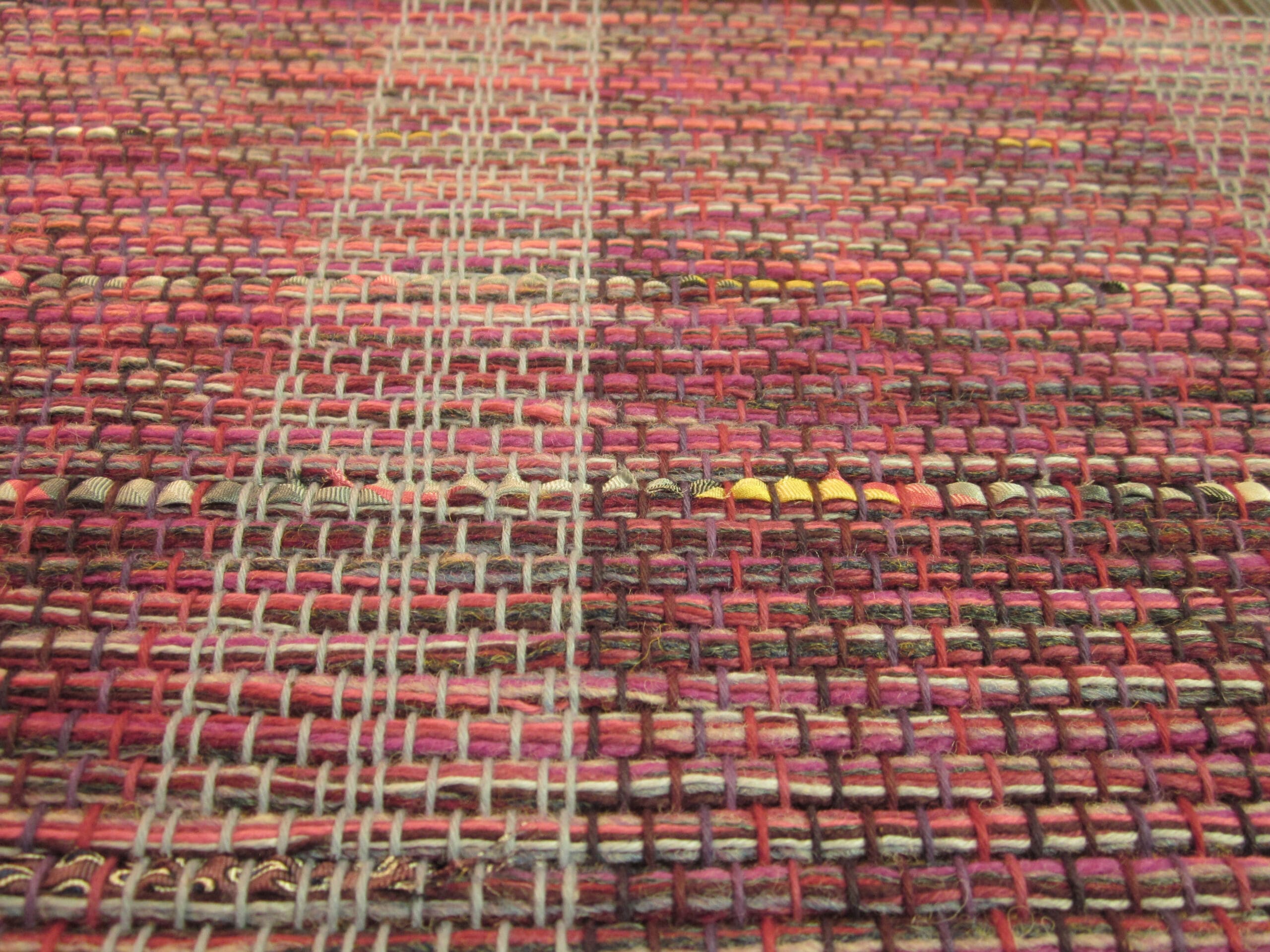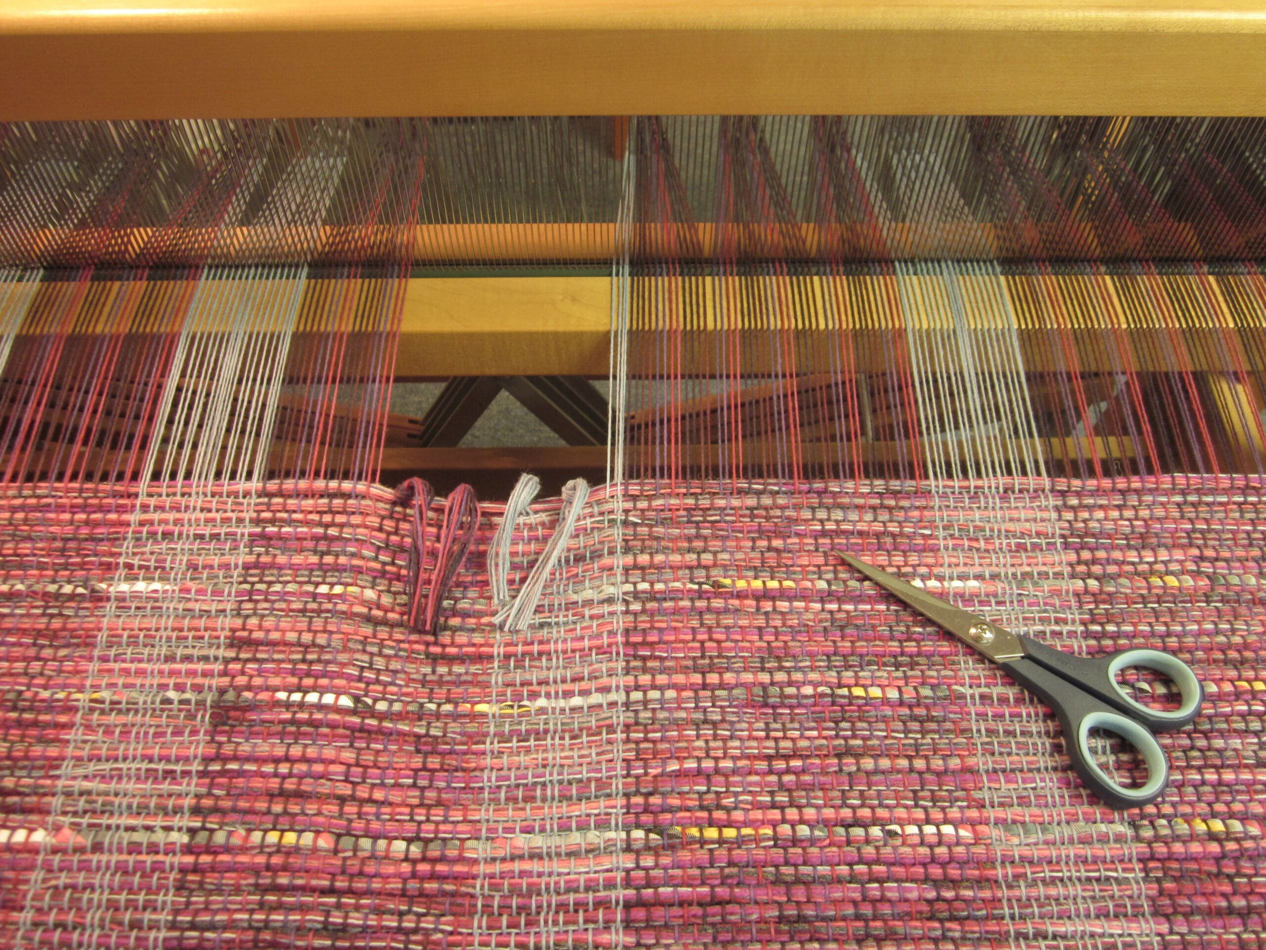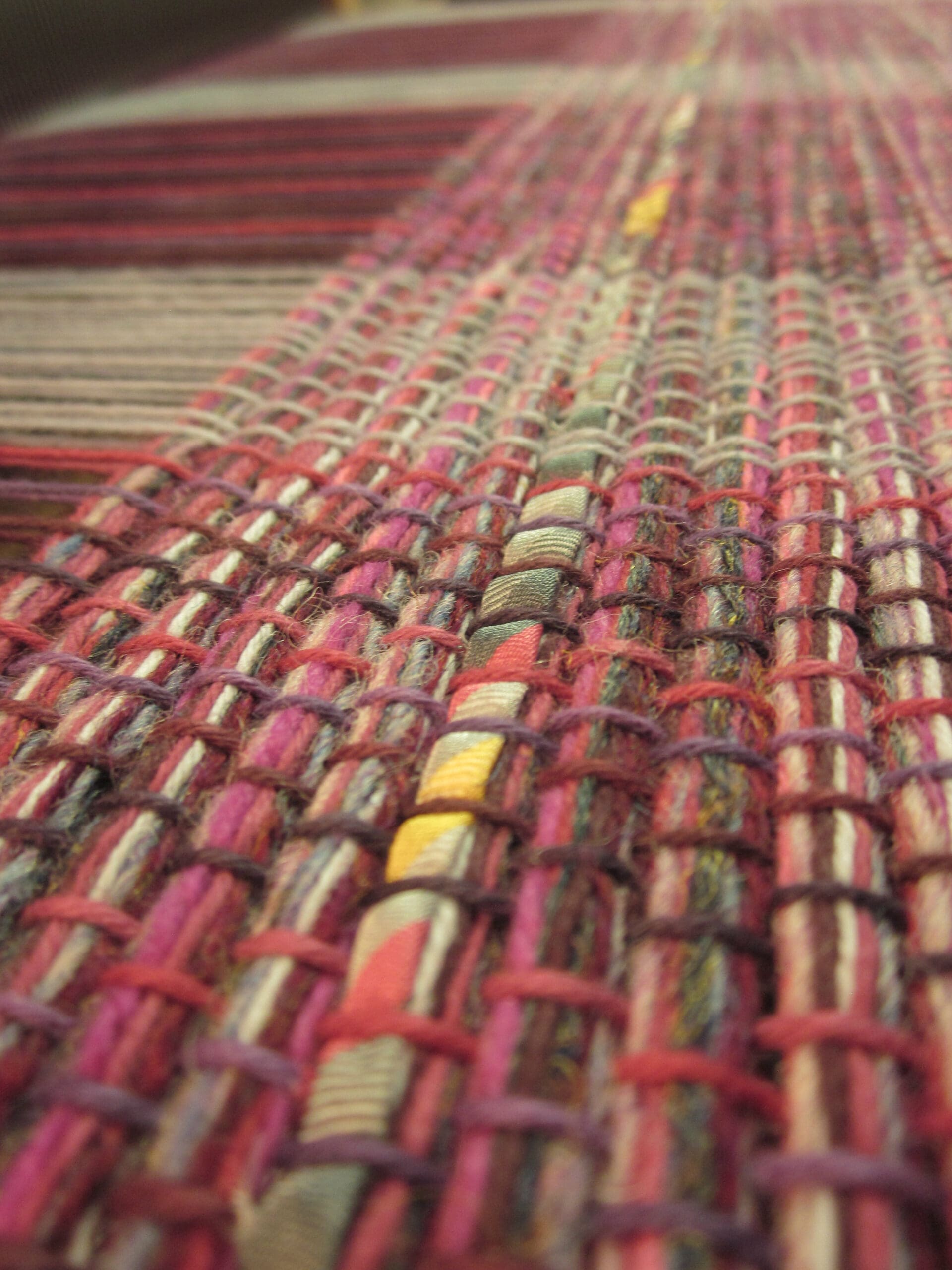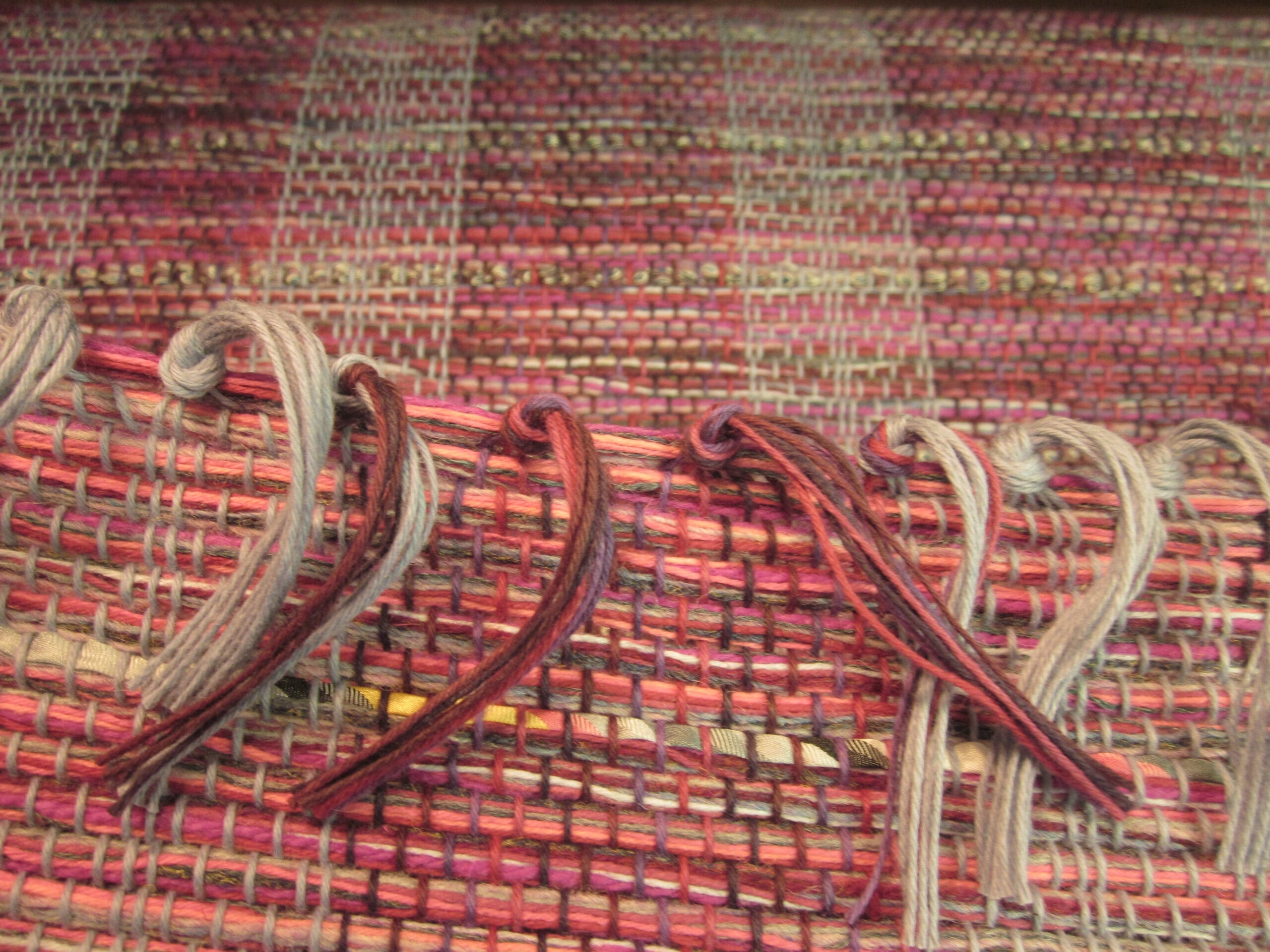 The knots are coming up quickly, signaling the end of the fabric! I started the project with lots of blues, moved into some purples and now am solidly living in magenta-land! (I know many folks who could live quite happily in magenta-land without complaints!)