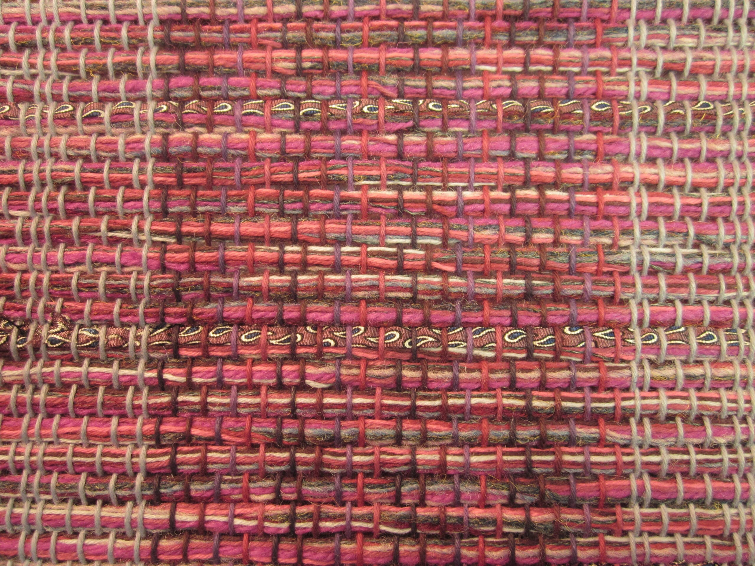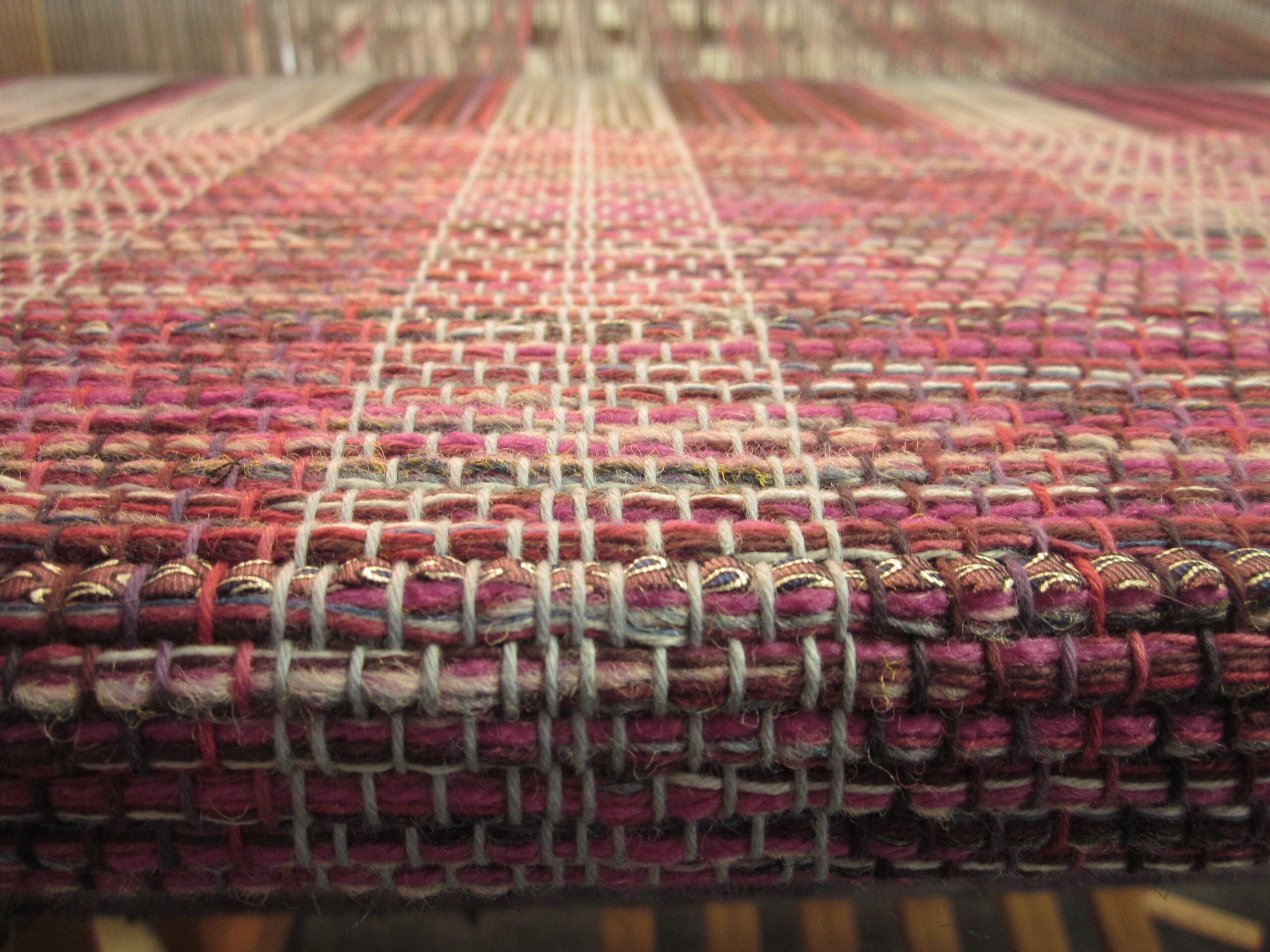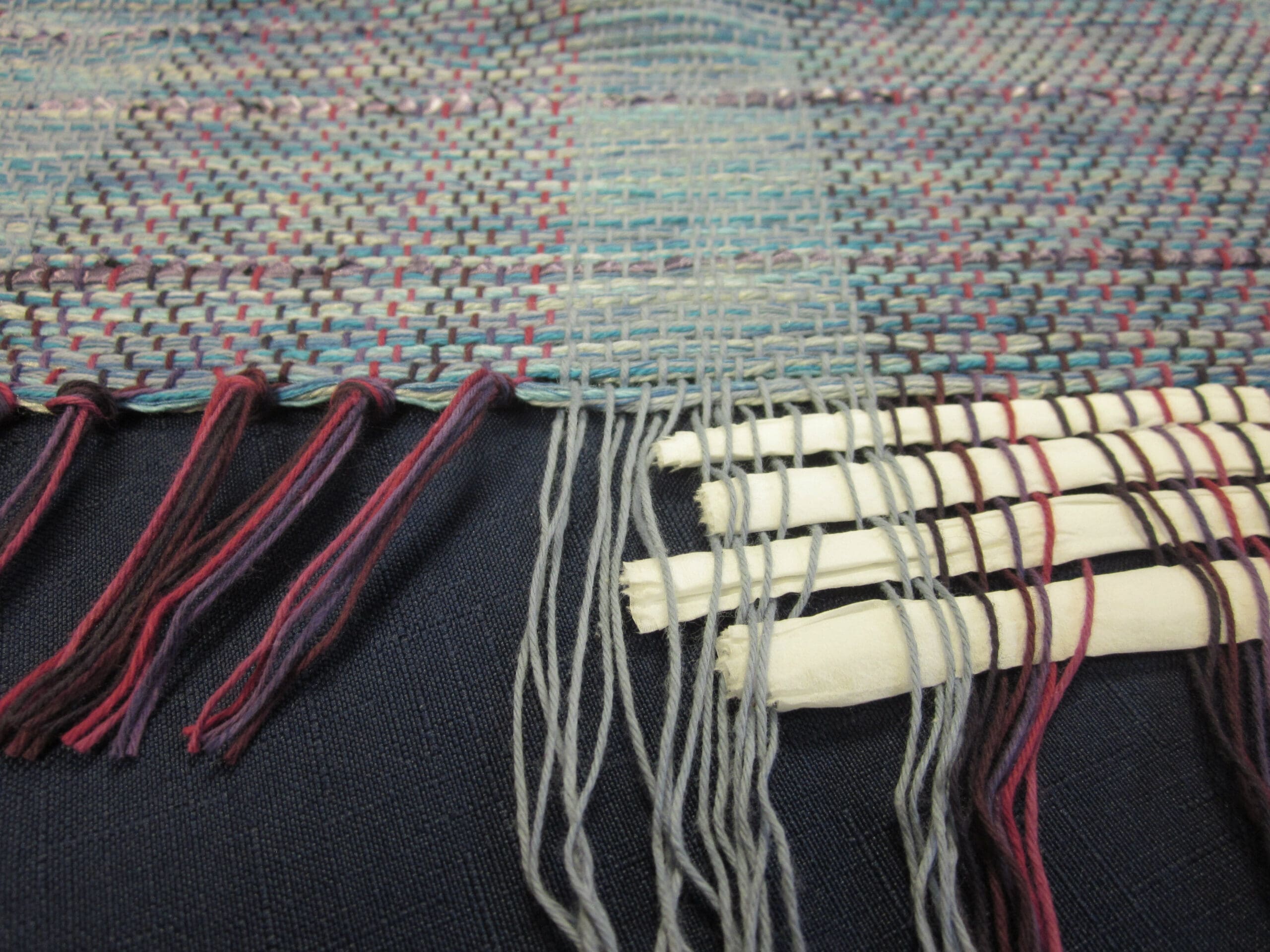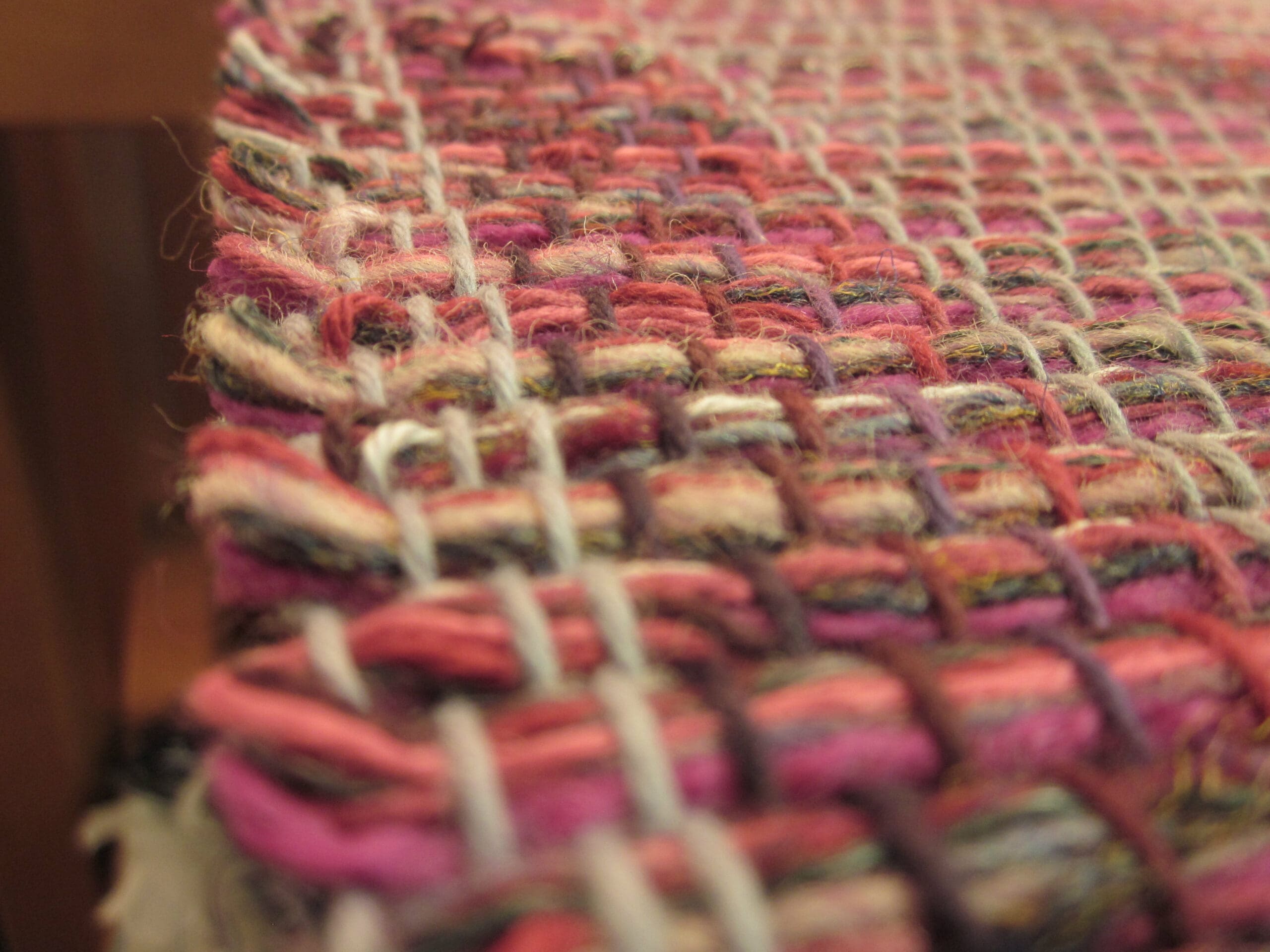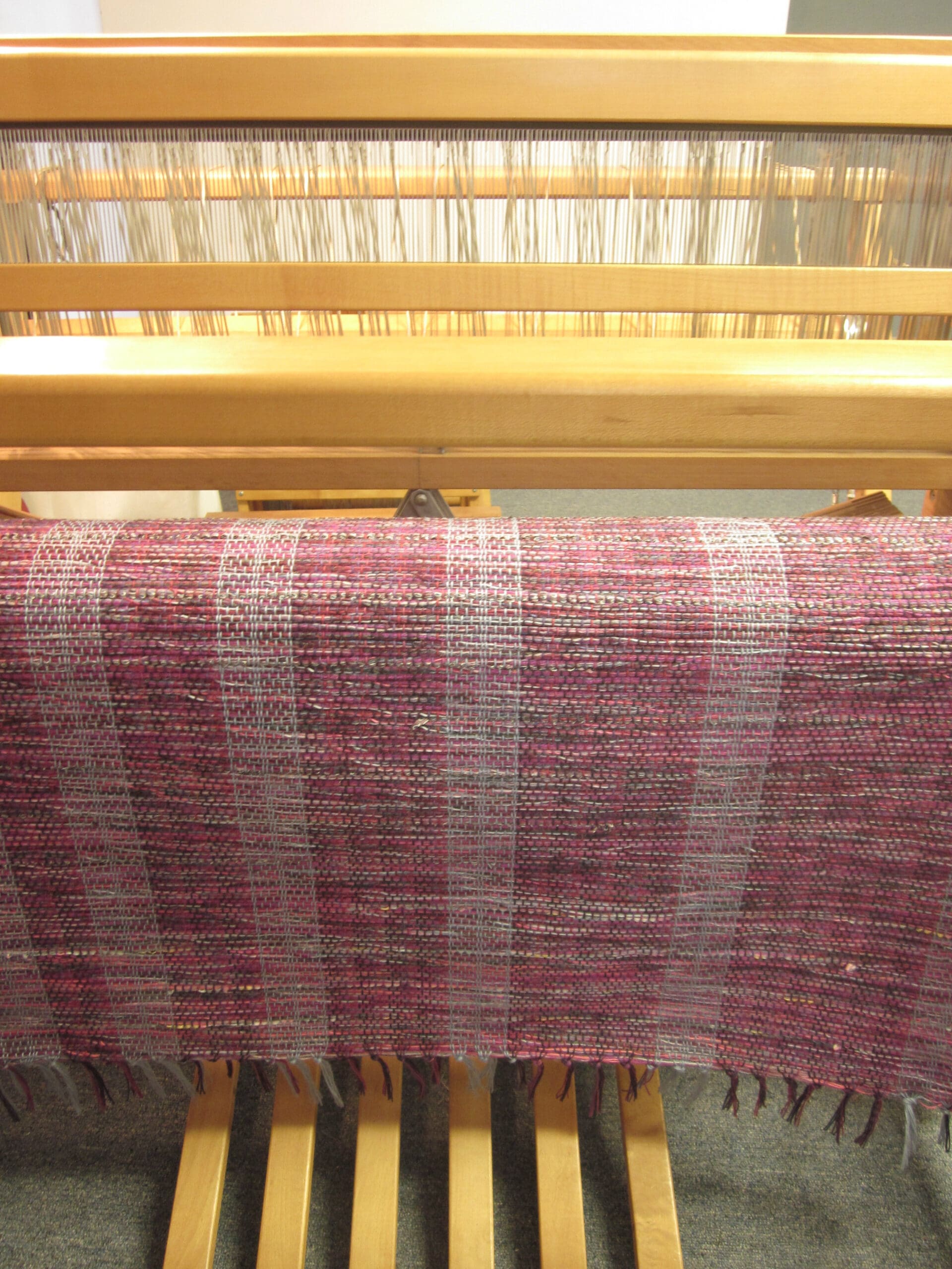The knots are coming up quickly, signaling the end of the fabric! I started the project with lots of blues, moved into some purples and now am solidly living in magenta-land! (I know many folks who could live quite happily in magenta-land without complaints!)