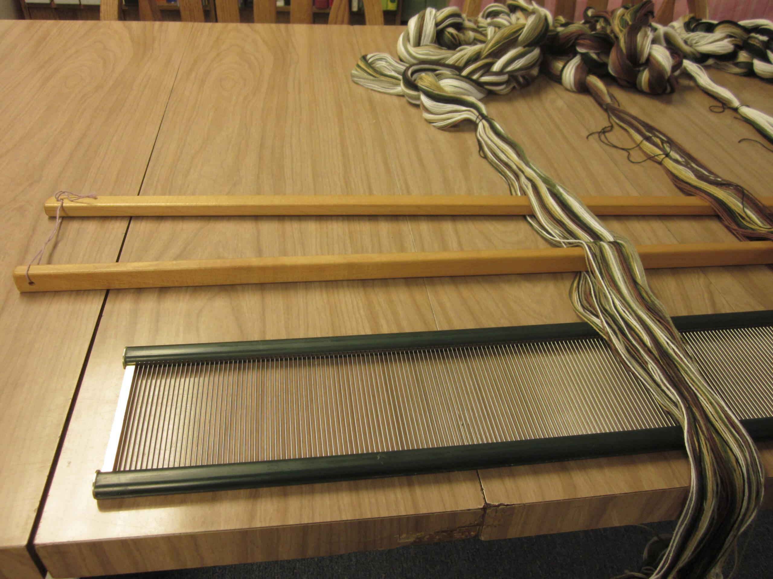 First up, the lease sticks slip through the cross I made on the warping board. I tied everything in strategic spots so I could locate the cross once I was sitting at the table. (Those ties get cut once I start sleying.) So now, the lease sticks are keeping the yarns in order! The reed sits directly in front of me with an edge hanging off the table to make the threading easier. The trick is to avoid knocking the reed over onto the floor. You can always tape it down if it makes you more comfortable!