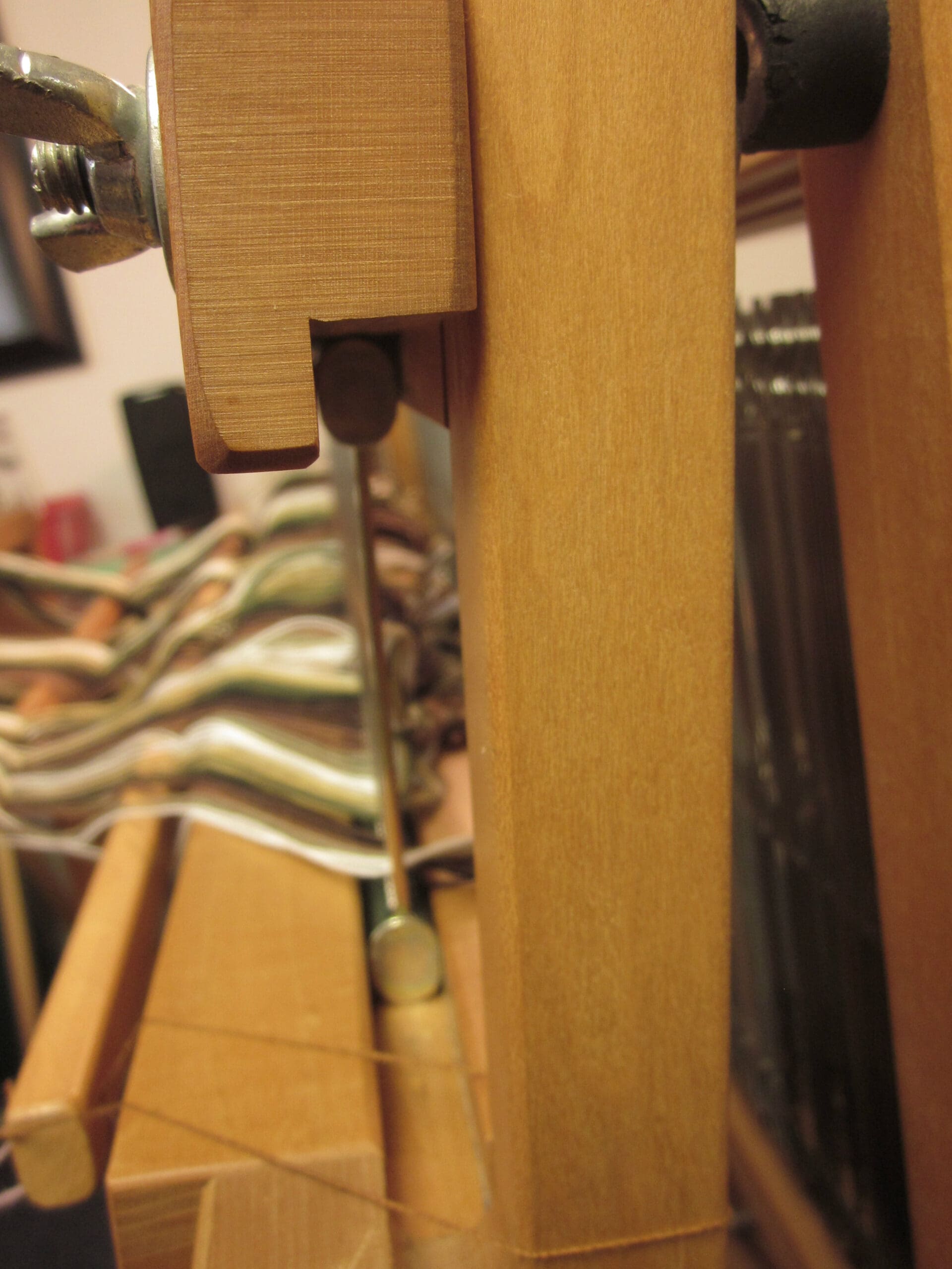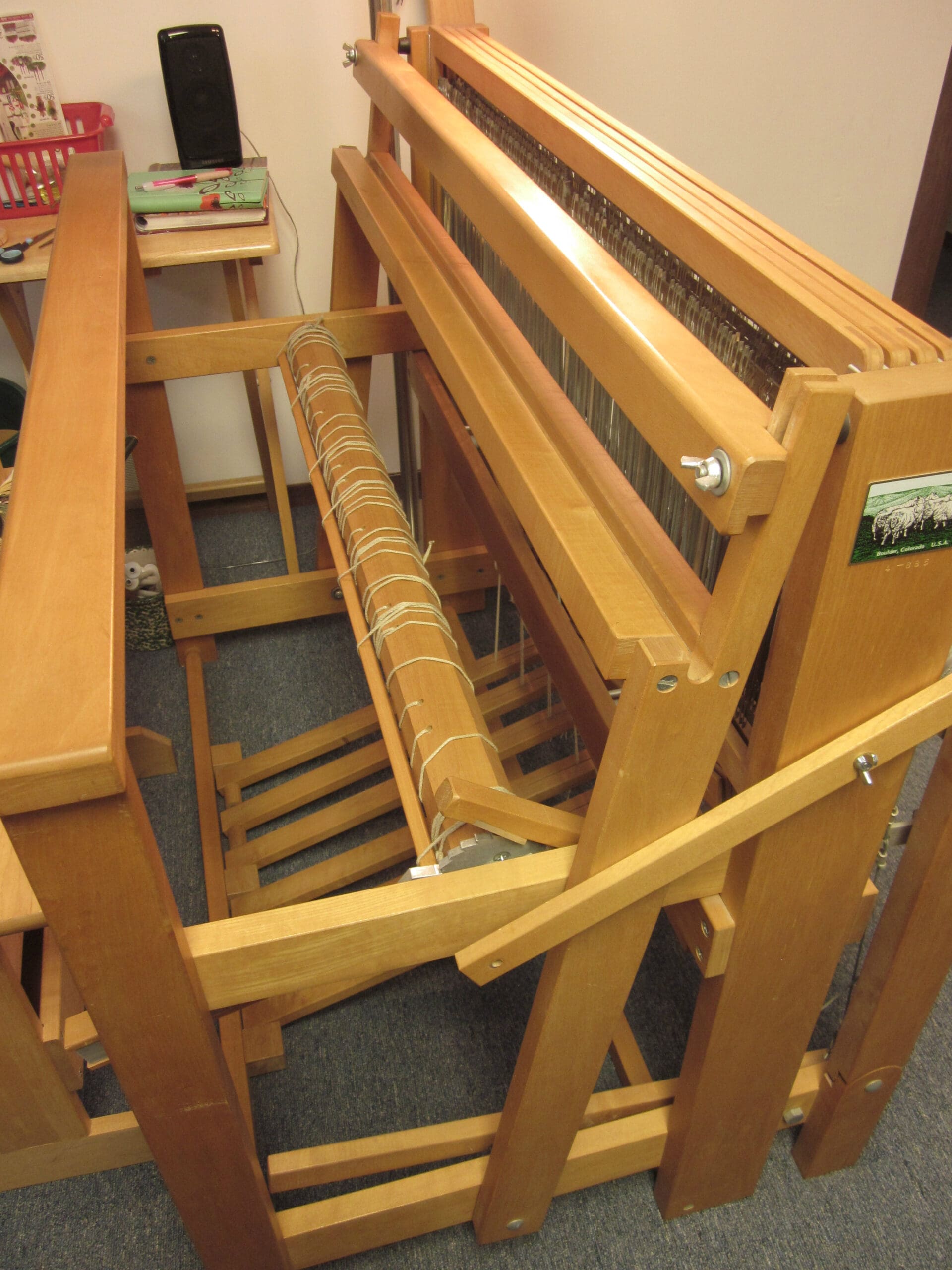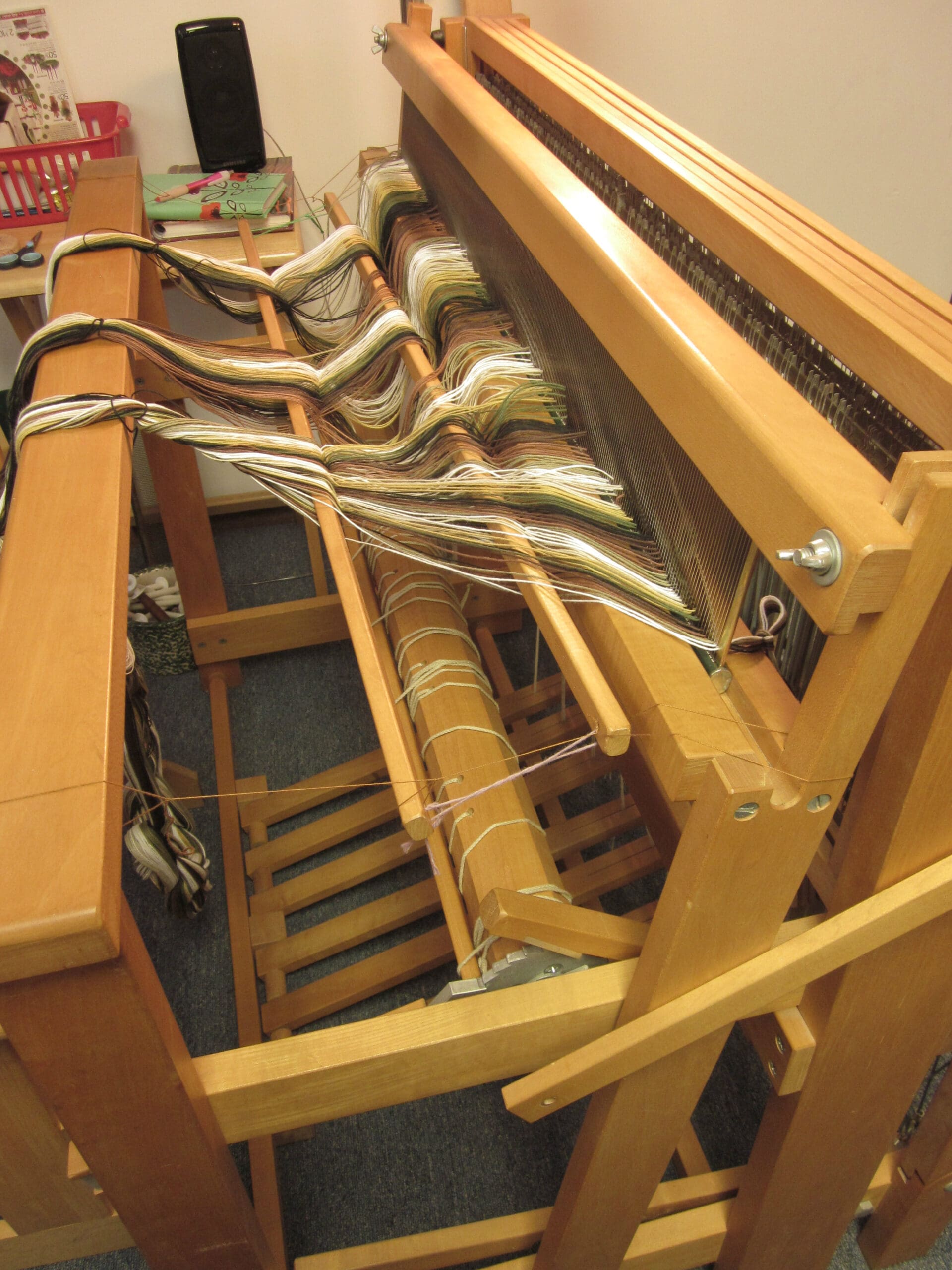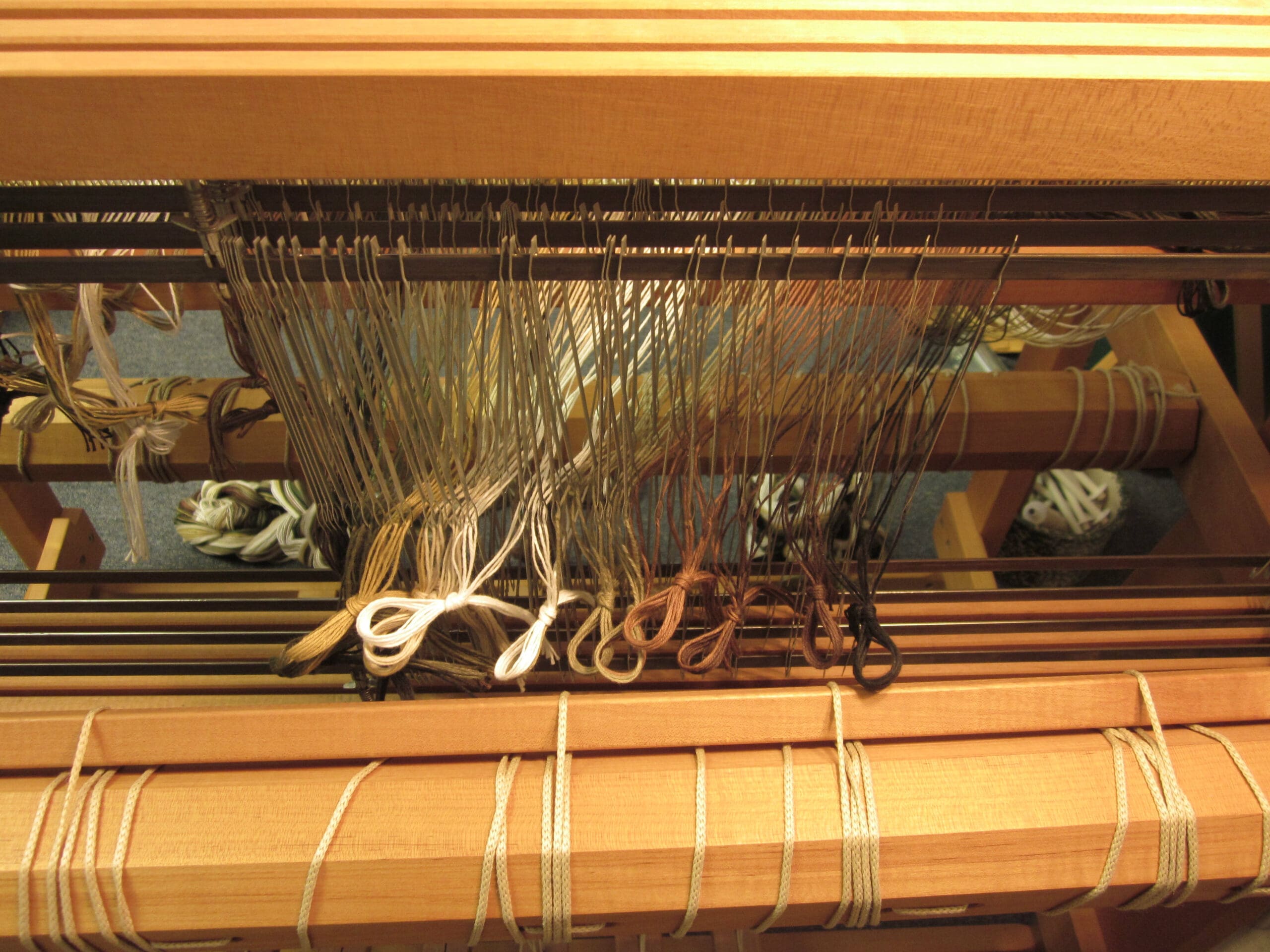 The reed, that is now completely filled with yarn, moves over to the beater bar of the loom and fits right in! The top of the beater bar comes off, making it easy to put the reed into the grooves and then tighten everything up so we don’t have wiggleage. (I’m sure that’s not a word. Probably “wiggling” would have been more accurate. But, I’m taking creative leverage today – Mr. Webster will have to get over it!)