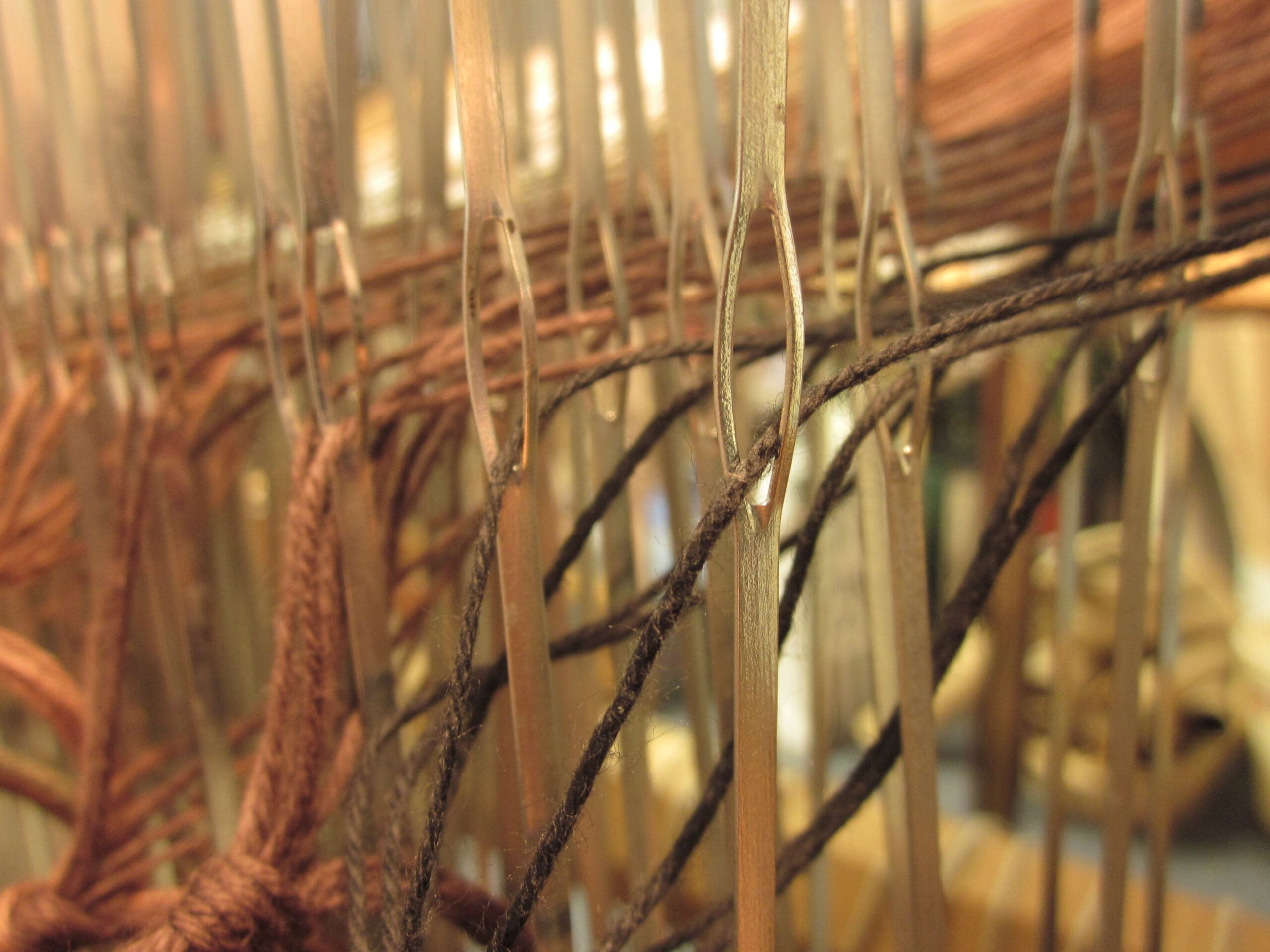 Next up, the yarns all need their own heddle. So, I sit behind the loom (which is really more of a squat so I’m at heddle level) and start threading the yarns from the middle moving out. (p.s. heddles are tall, skinny, metal pieces with an eye in the middle that slide around on the shafts of the loom. And now you are in the know!)